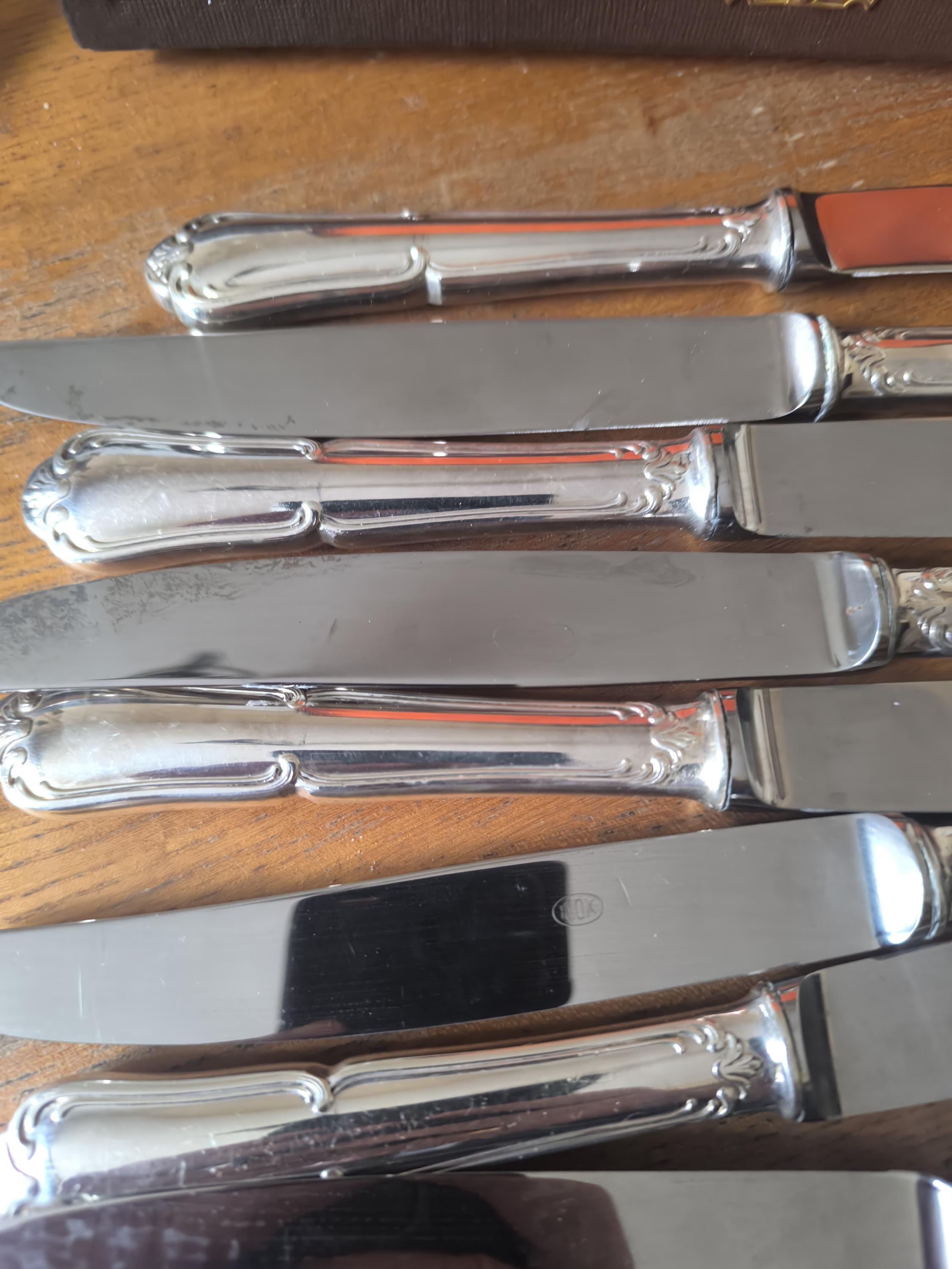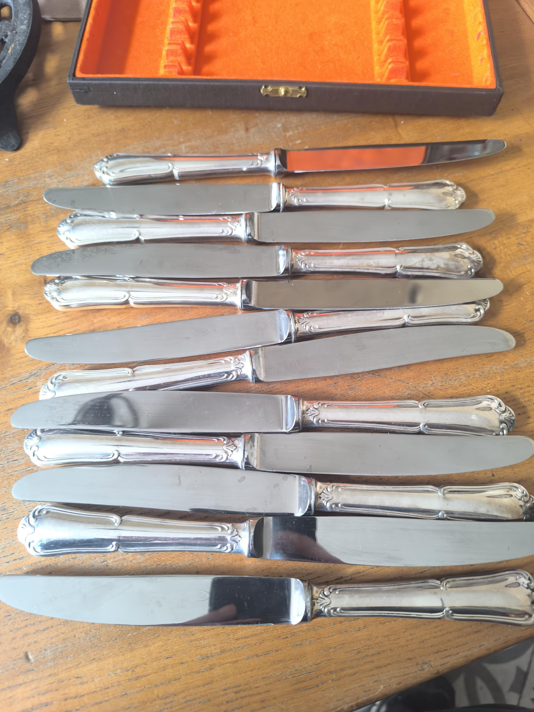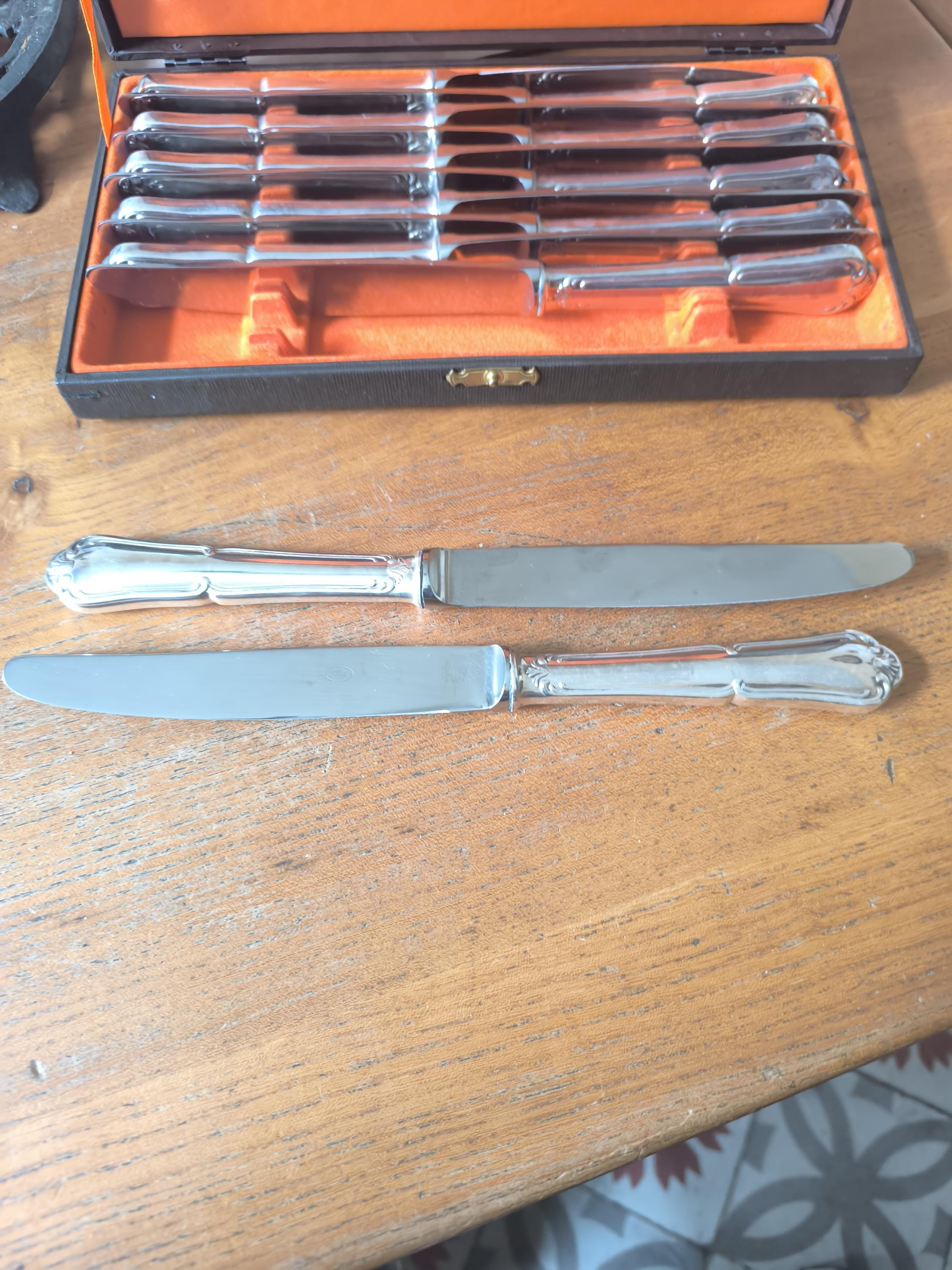 A beautiful set of twelve large Louis XV knives in silver-plated metal with stainless steel blades, presented in a case.