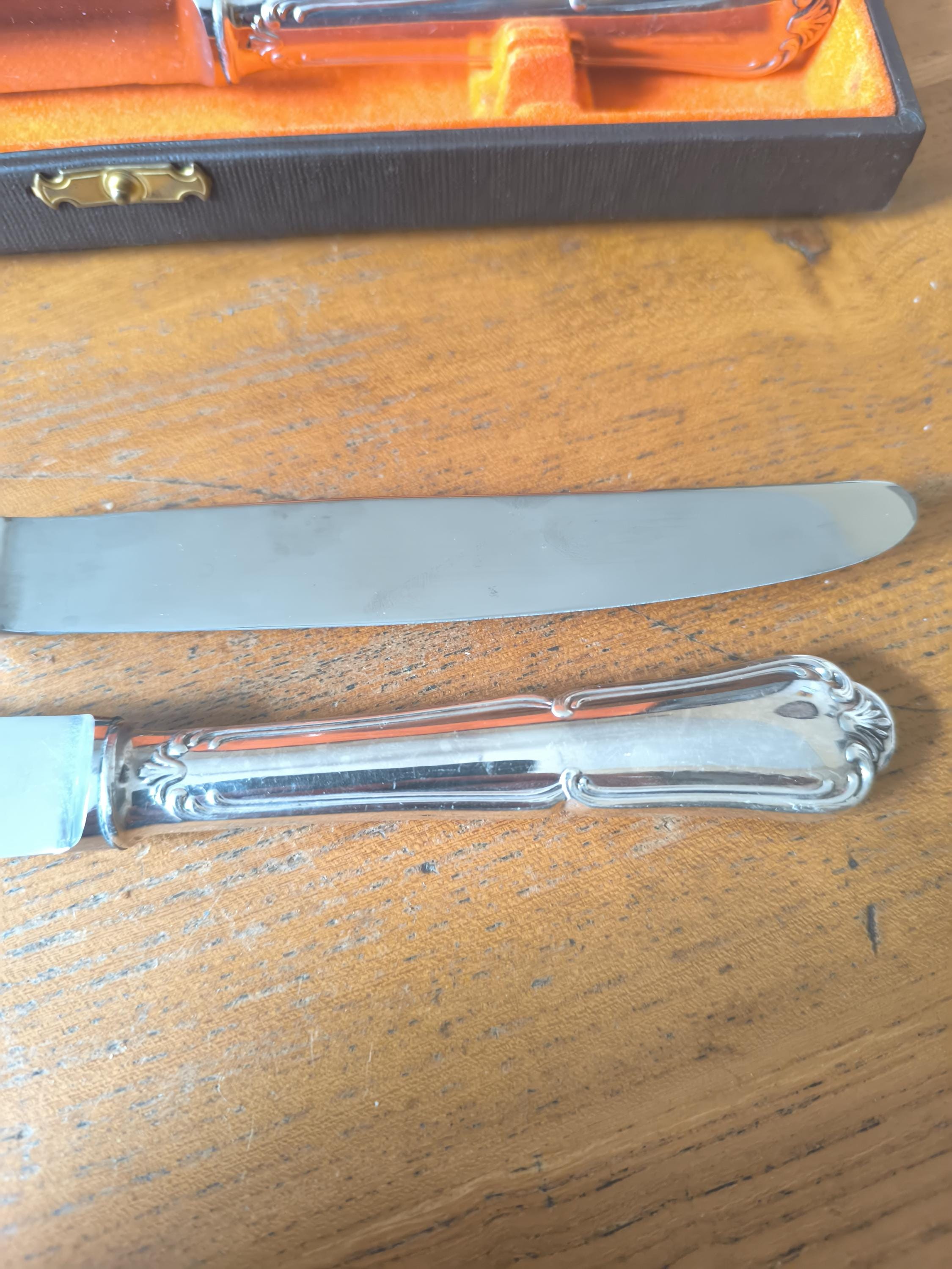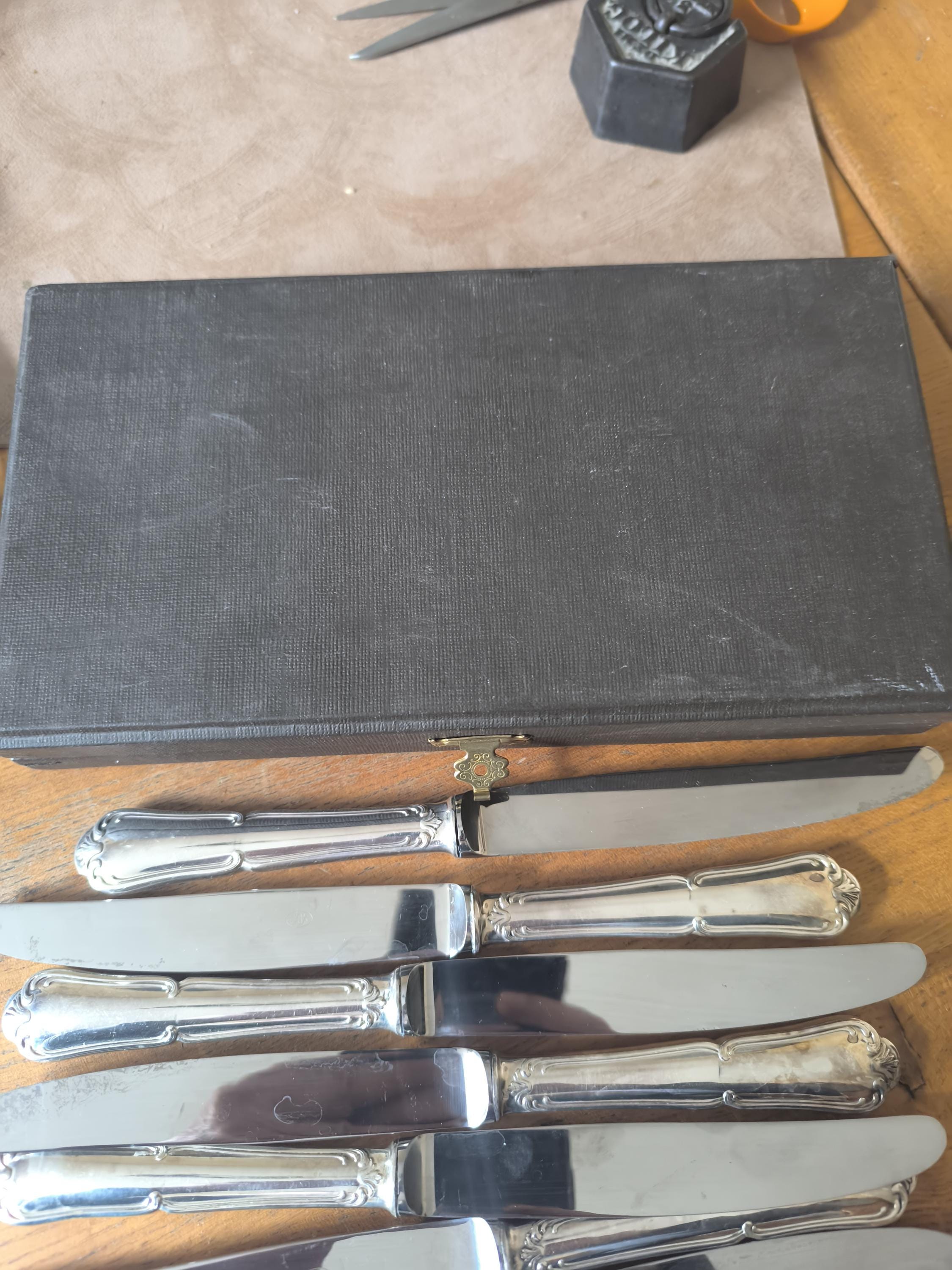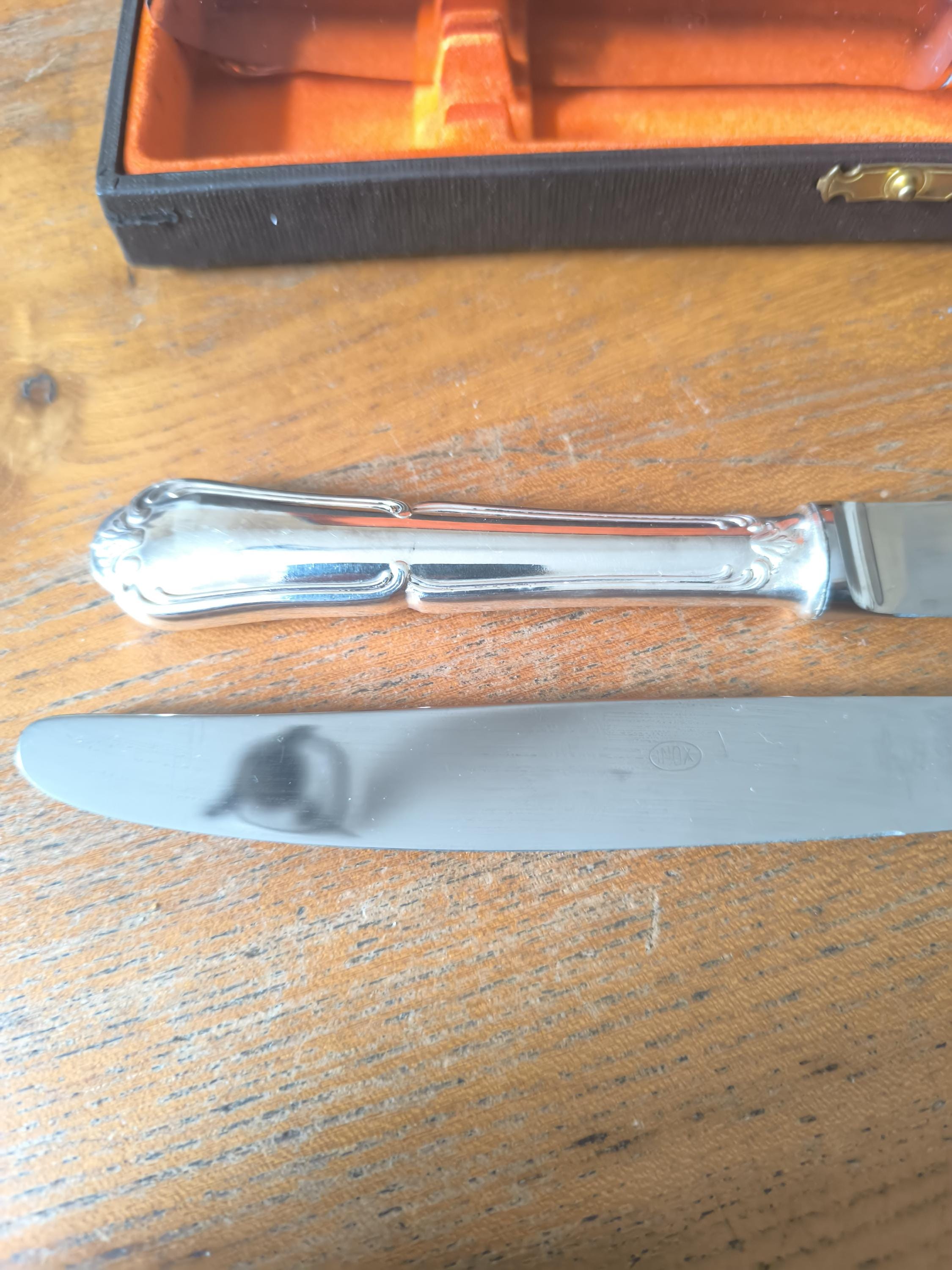 A beautiful set of twelve large Louis XV knives in silver-plated metal with stainless steel blades, presented in a case.