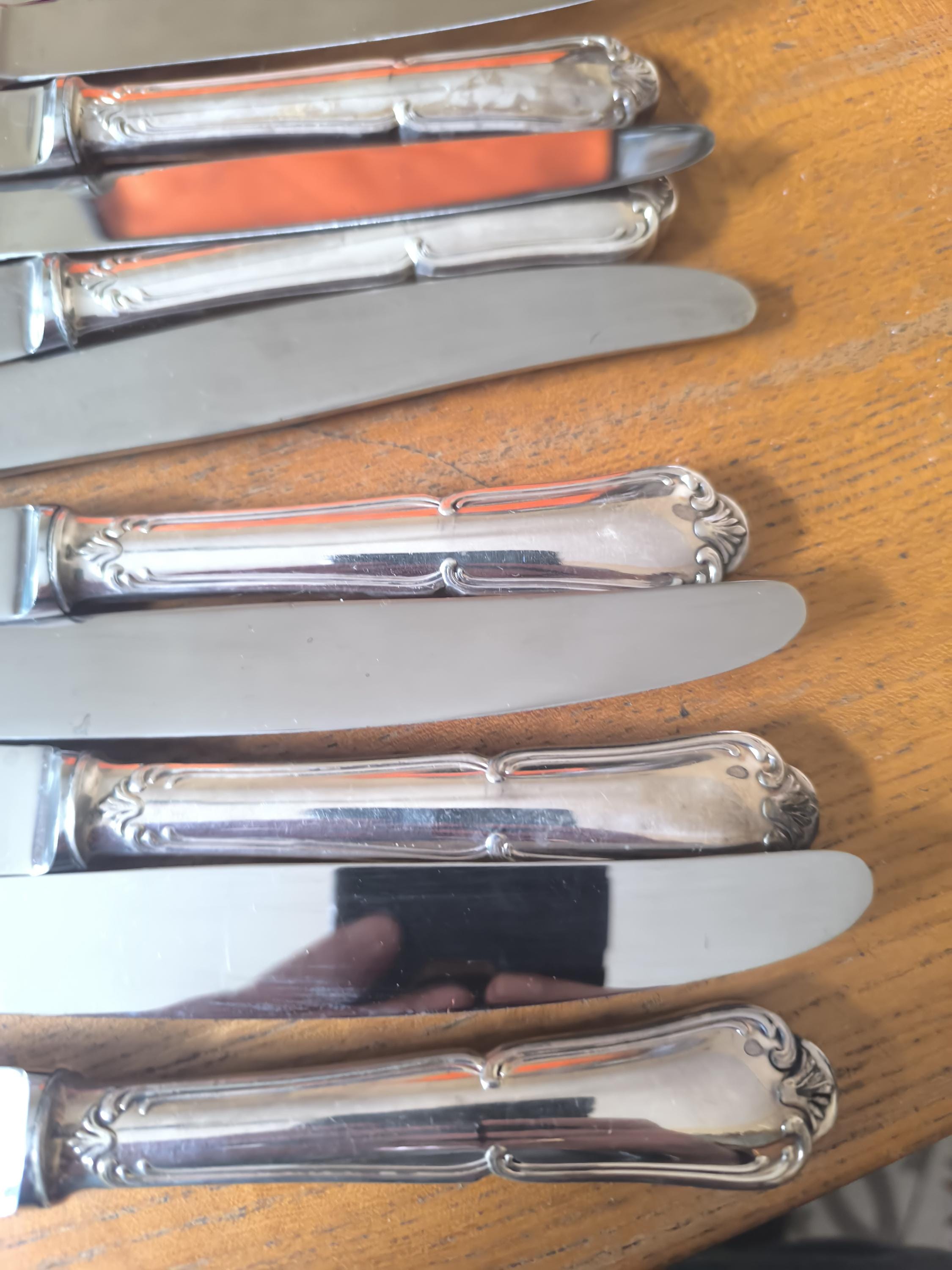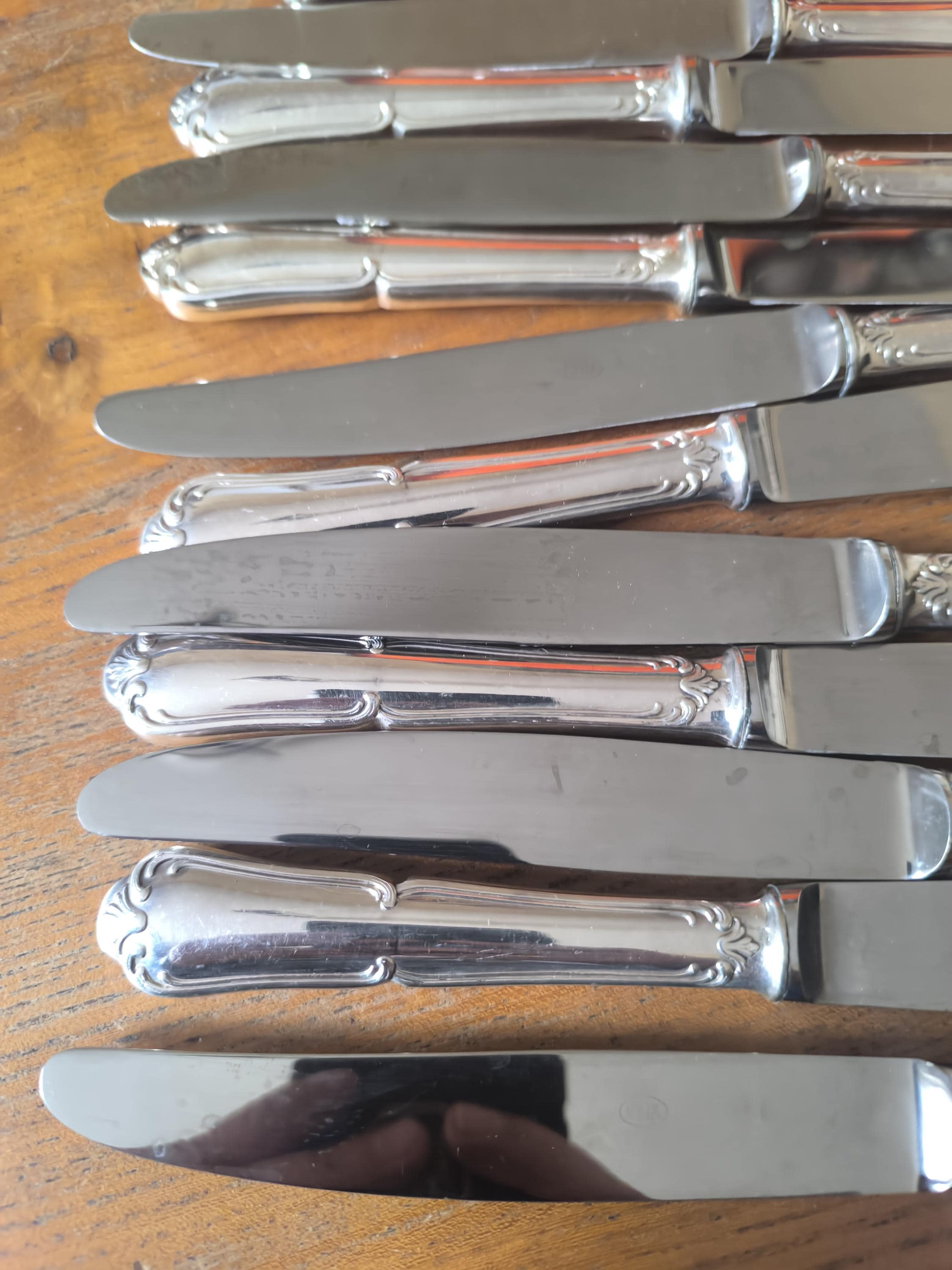 A beautiful set of twelve large Louis XV knives in silver-plated metal with stainless steel blades, in excellent condition.