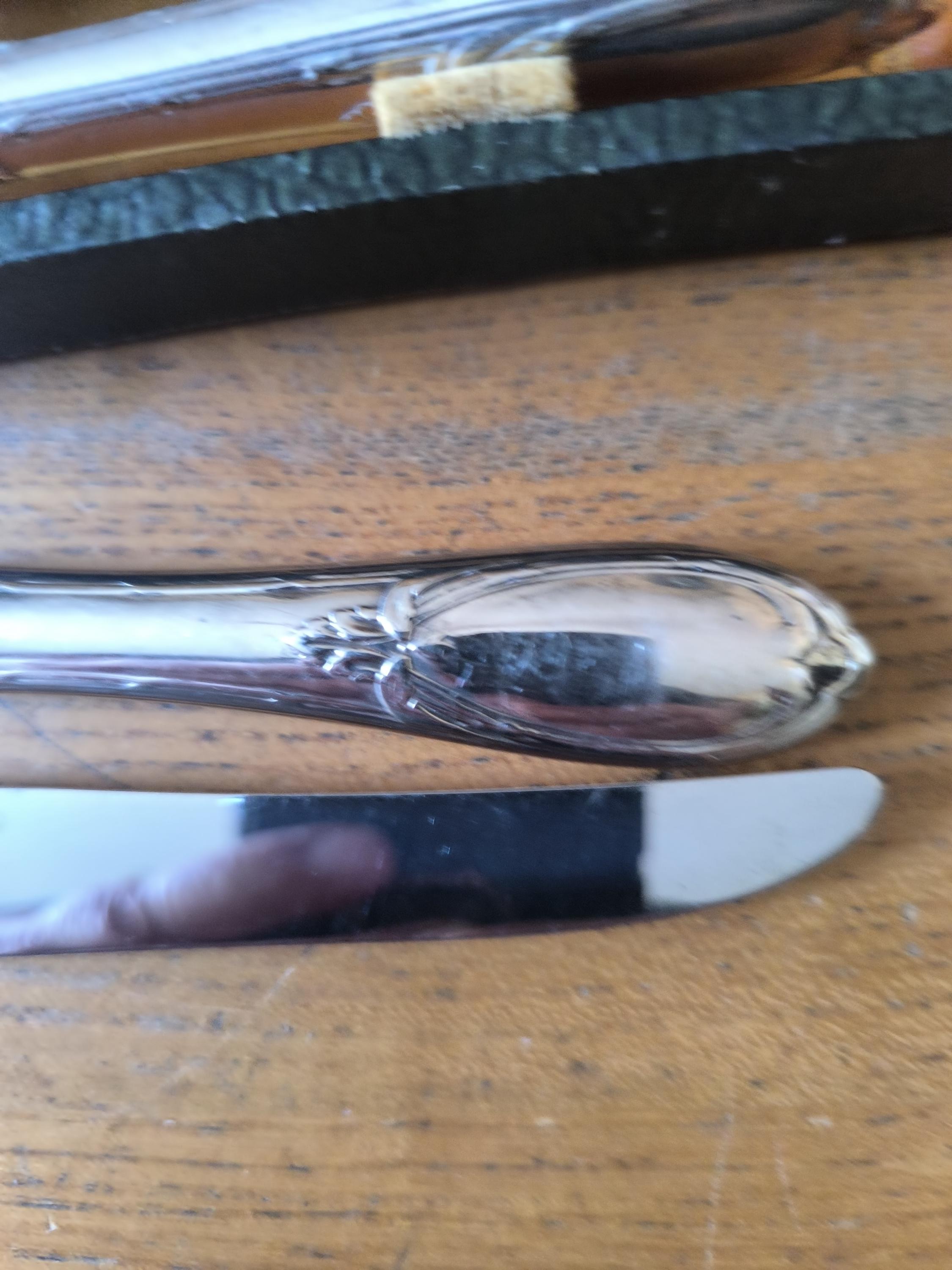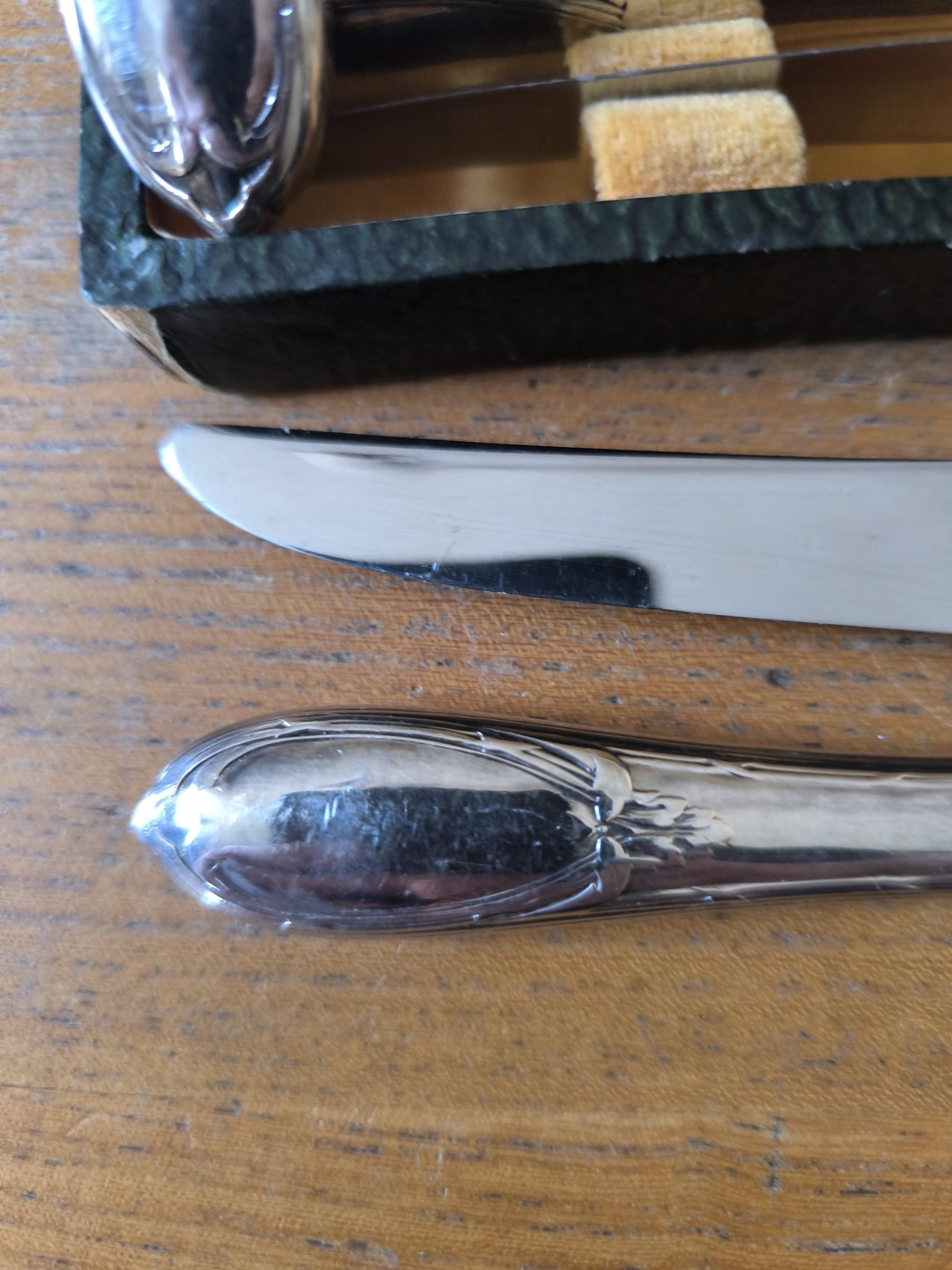 A beautiful set of twelve stainless steel dessert knives from the Lapparra silversmiths, unhallmarked, was part of a flatware set that bore the Lapparra hallmark. I have included a photo of the hallmark as an example.