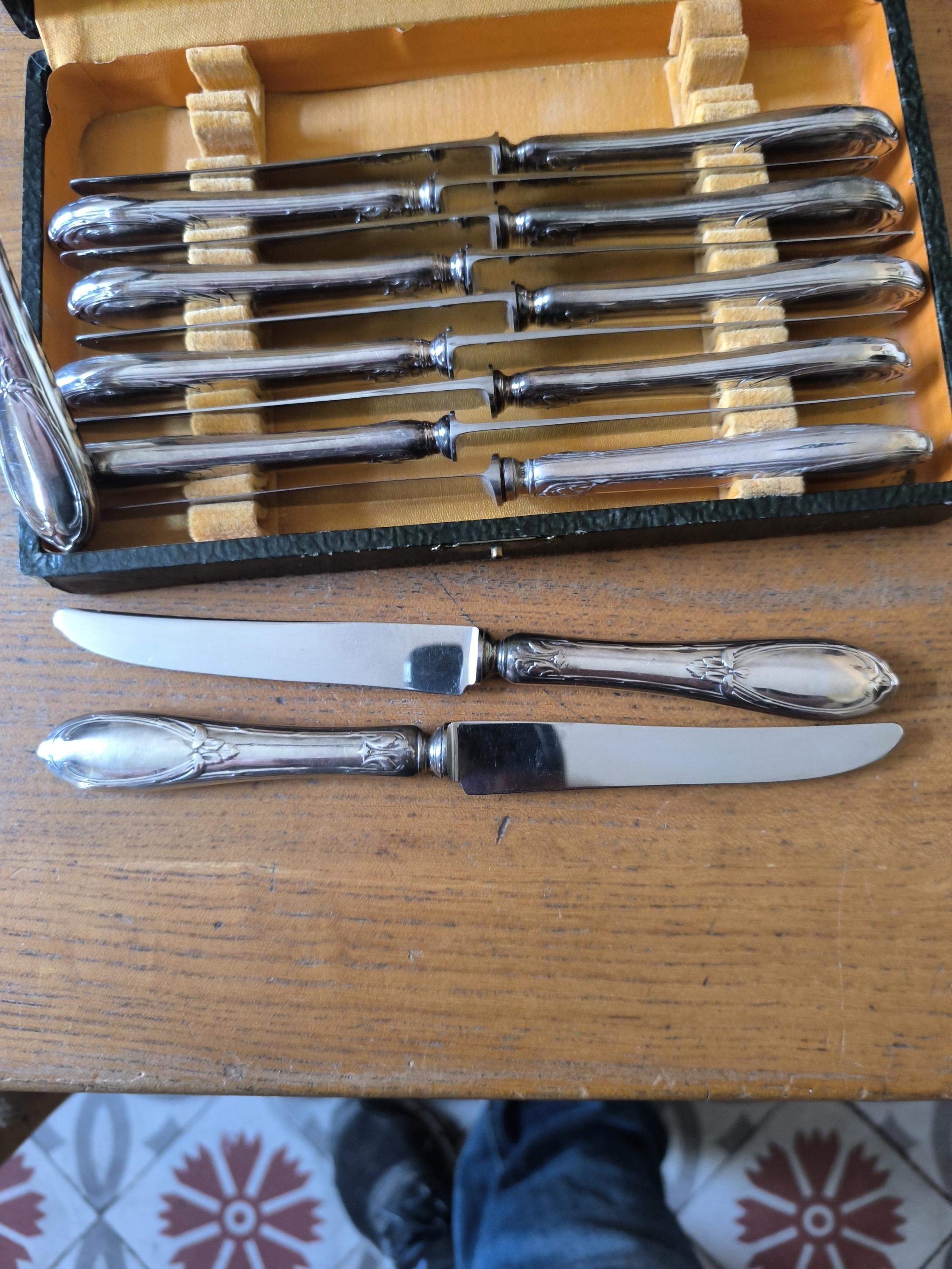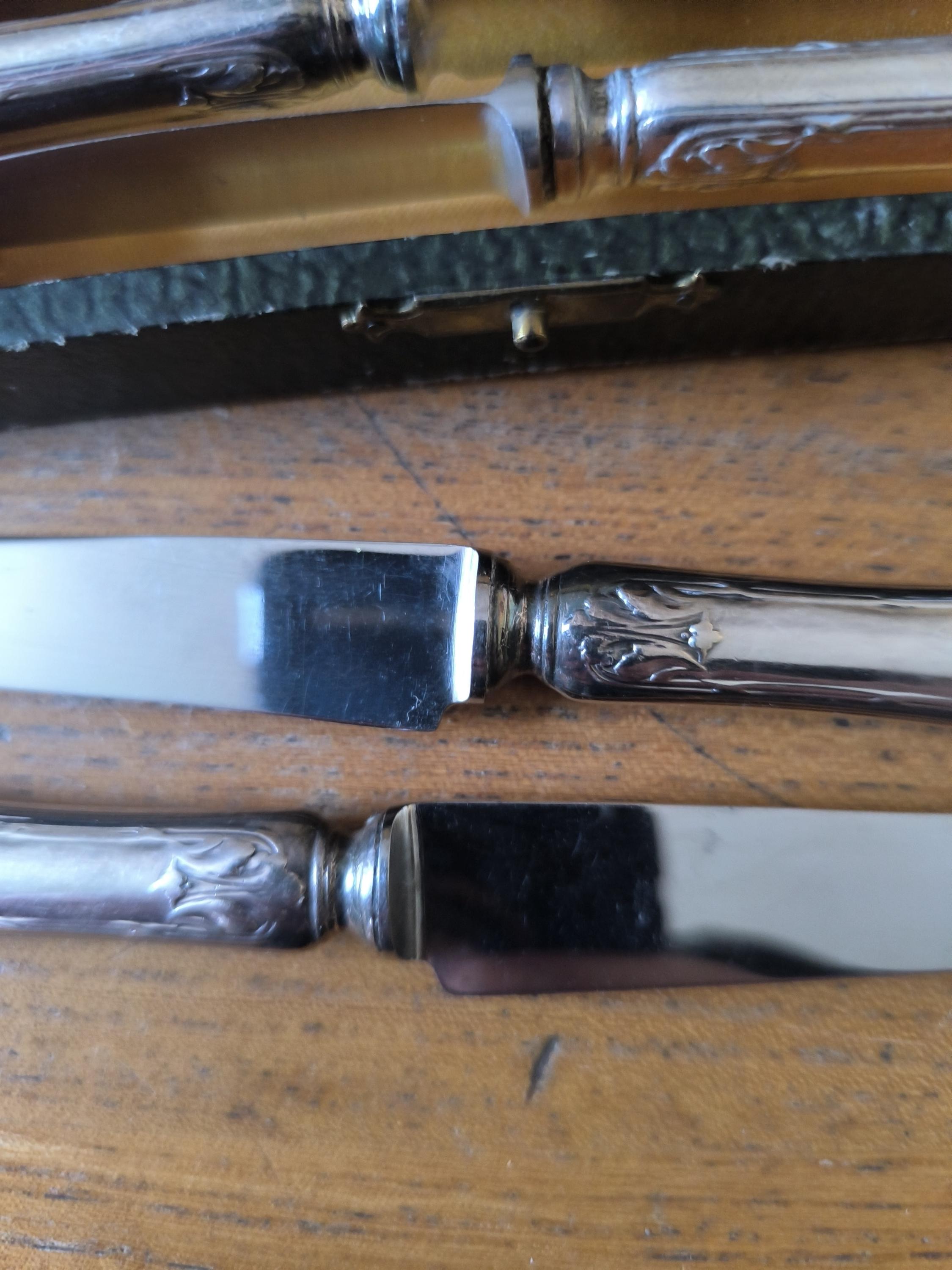 Part of a 12-piece silver-plated dessert knife set by silversmith Lapparra, presented in a case.