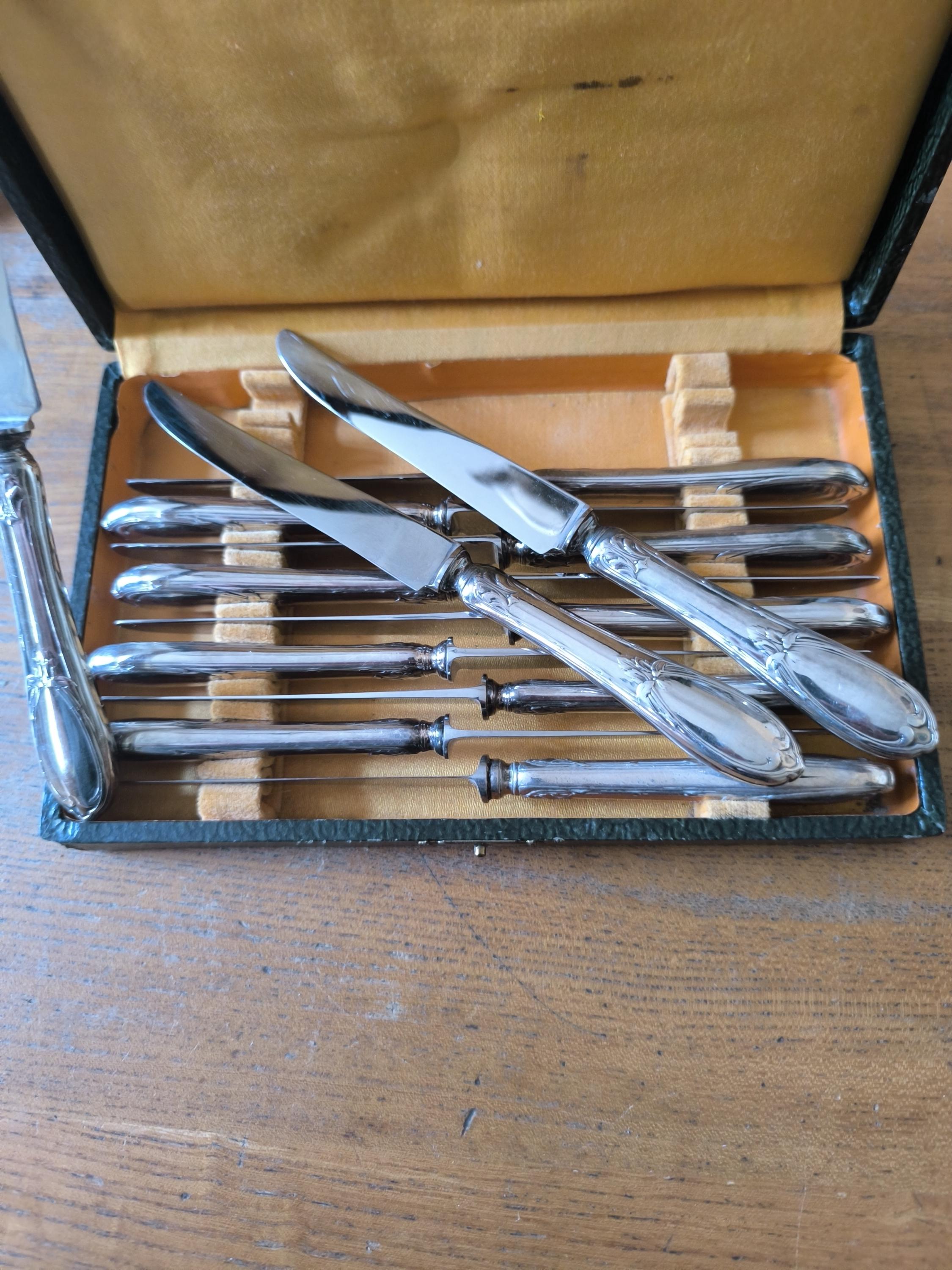 Part of a 12-piece silver-plated dessert knife set by Lapparra silversmiths, presented in a case.