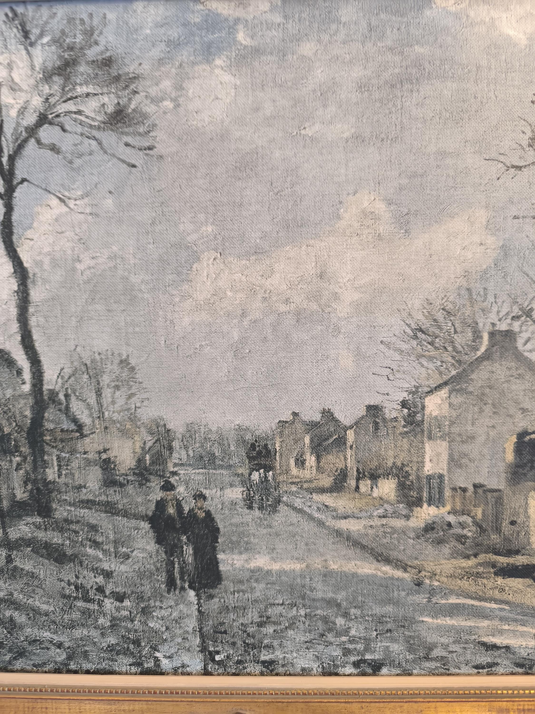The canvas depicts a village scene with houses with pointed roofs lining a winding road. Two figures stroll peacefully, adding a touch of life to this tranquil winter landscape. The bare trees, with their thin, graphic branches, stand proudly beneath a cloudy sky, typical of Pissarro's style. The texture of the painting, although reproduced on canvas, retains a visual richness reminiscent of the original.