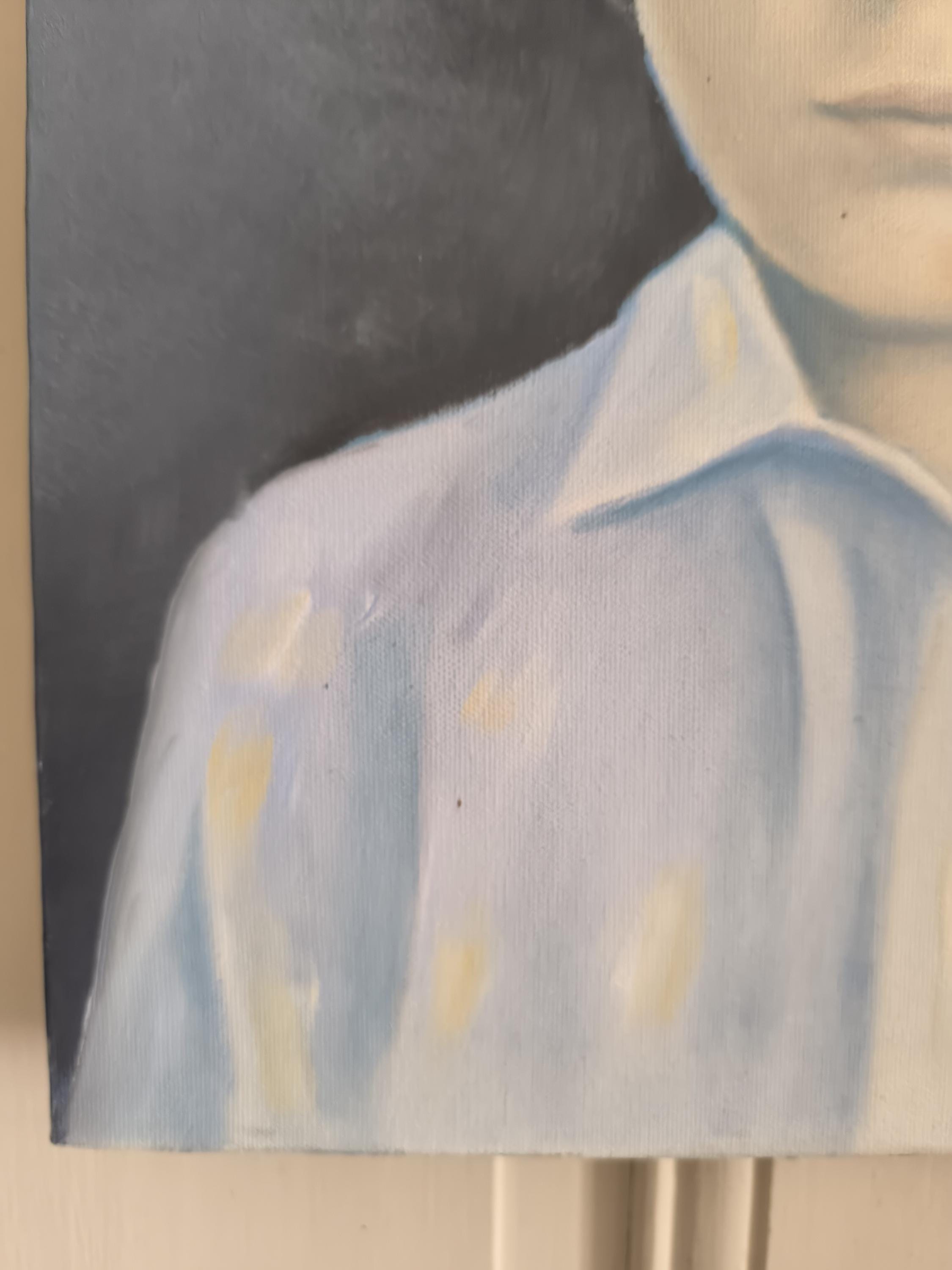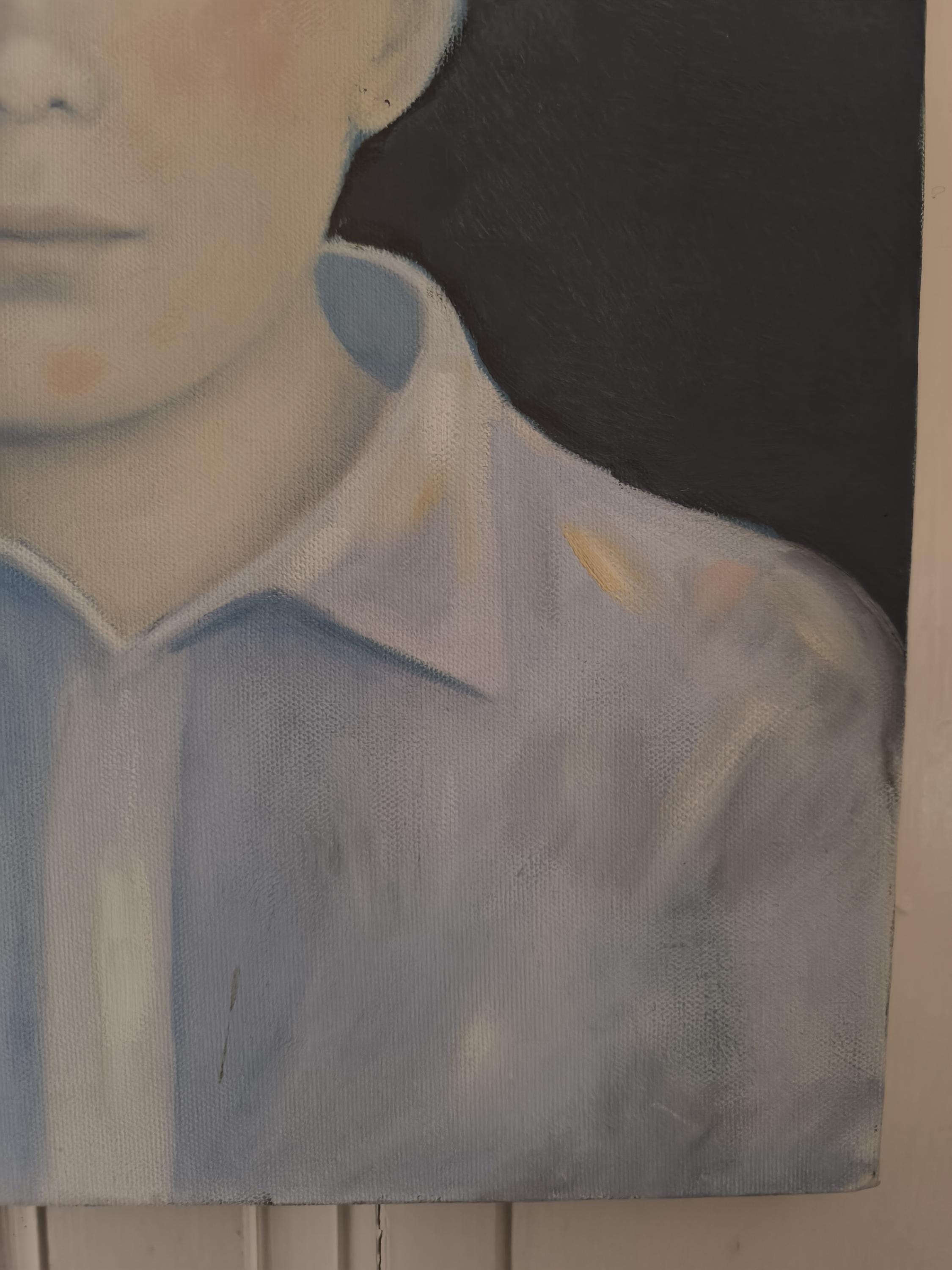 This oil painting on canvas is a realistic portrait of a young boy with blond hair swept to one side. His light blue eyes look directly at the viewer with a calm, thoughtful expression. The boy's cheeks are slightly flushed, adding a touch of vitality to his pale complexion. He wears a light blue shirt unbuttoned at the collar, painted with soft strokes that suggest the texture of the fabric. The background is a solid, dark blue, which makes the subject stand out and focuses attention on his face. The realistic style of the portrait captures the subject's youthfulness and purity with great finesse.
