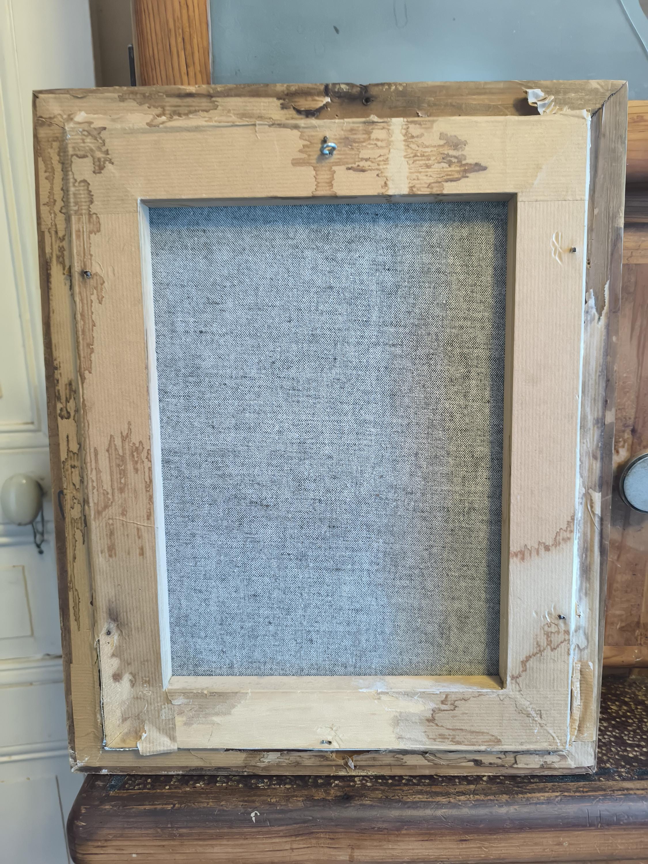 This high-quality reproduction, with some wear, captures the essence of the original, with its rich colors and fine details. The painting is presented in a gilt stucco frame, adding a touch of elegance and sophistication to the overall effect. The frame, with its intricate patterns and patinated finish, perfectly complements the painting's colonial and period style.