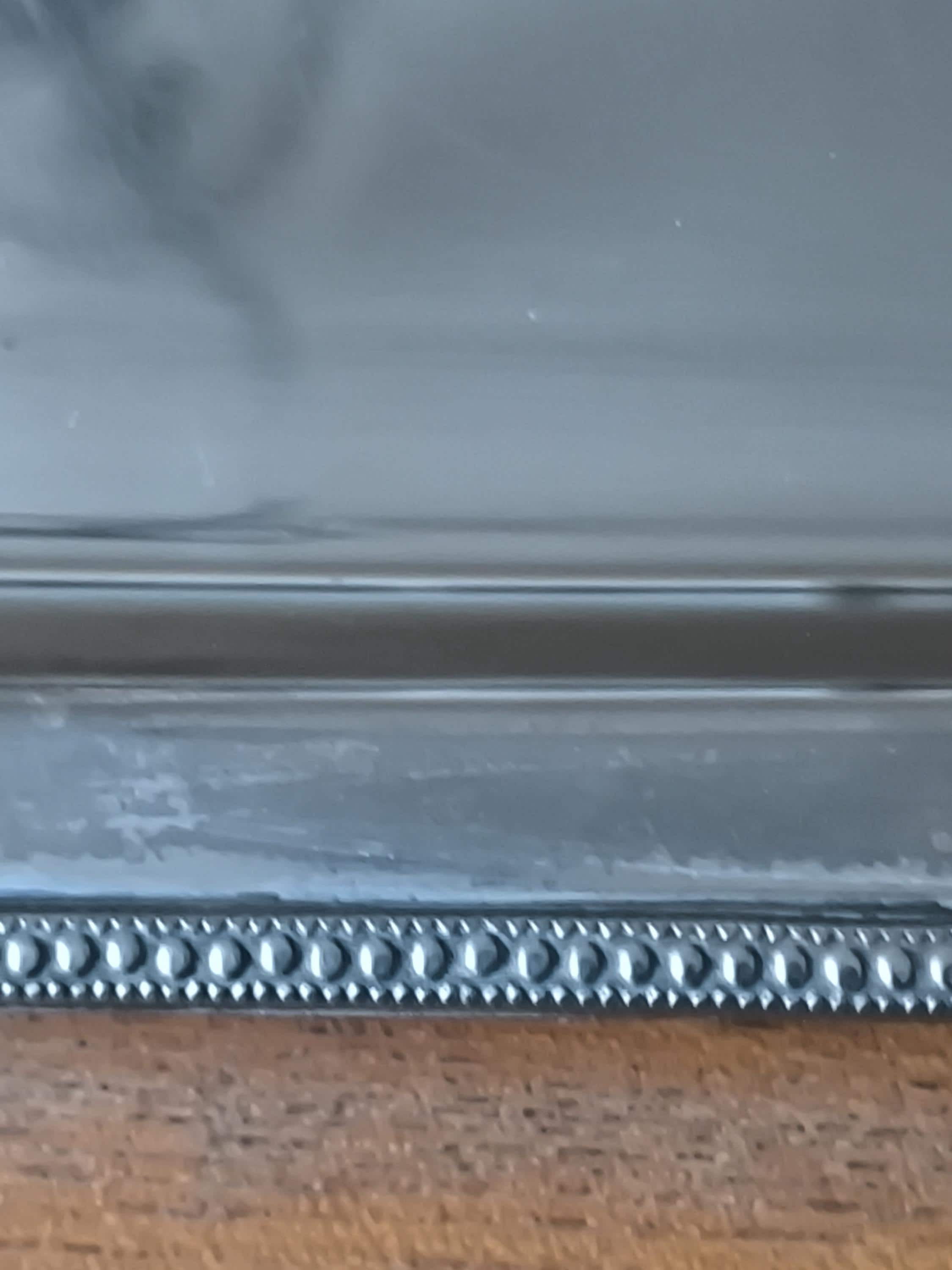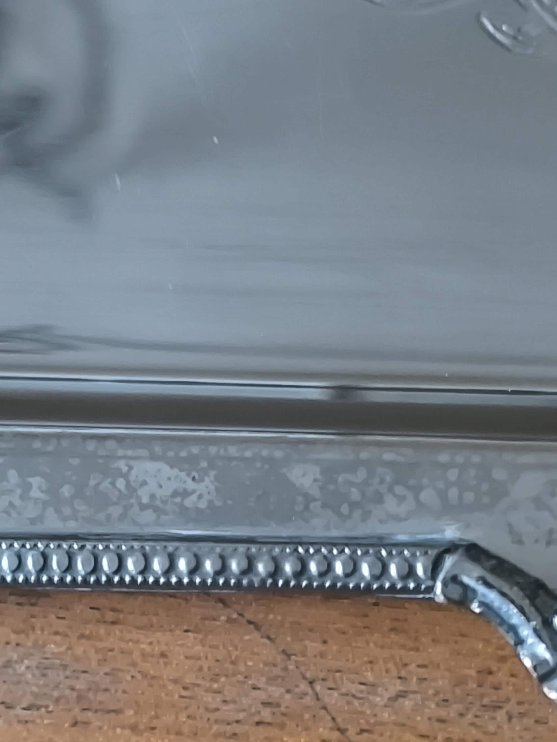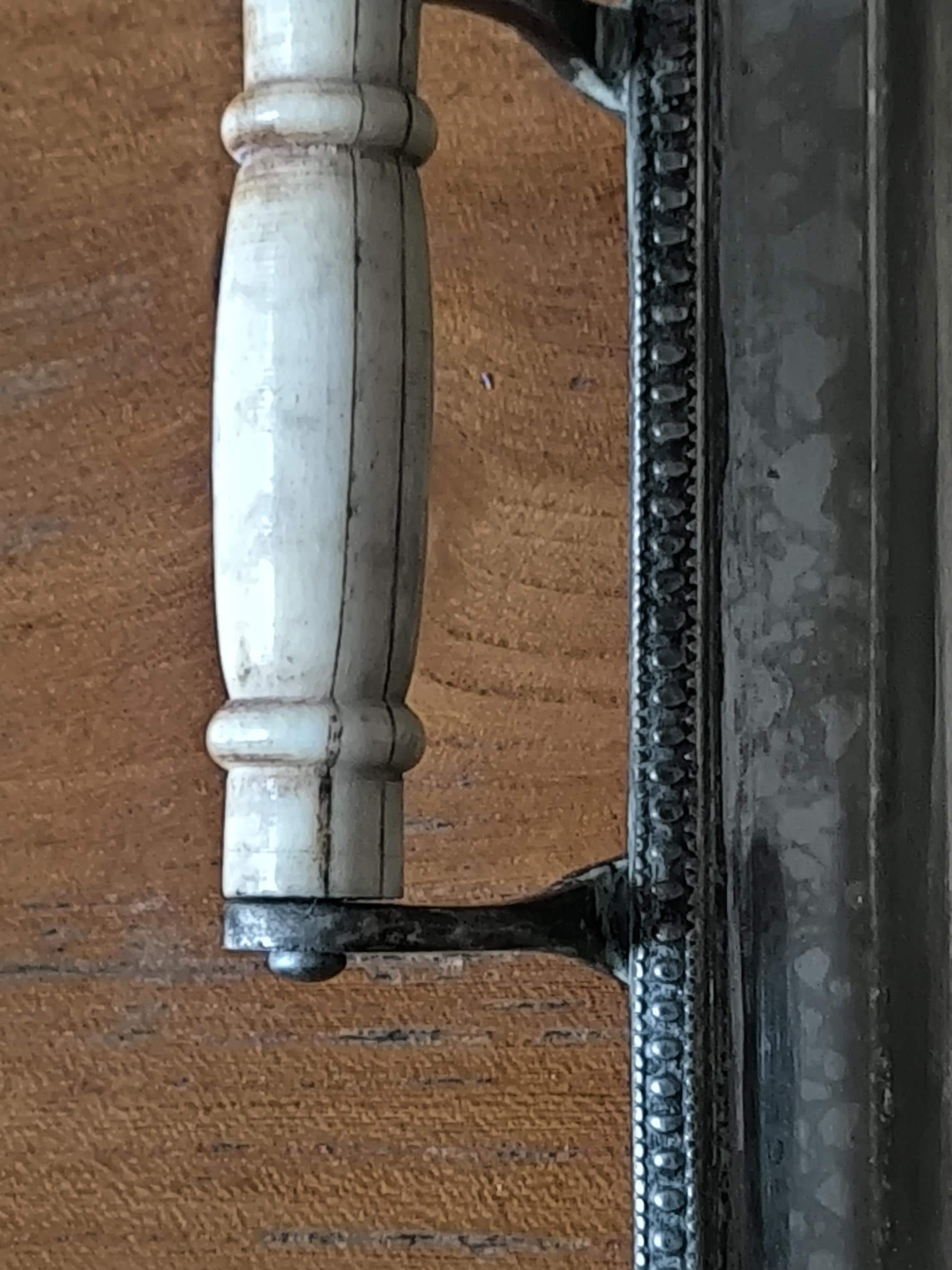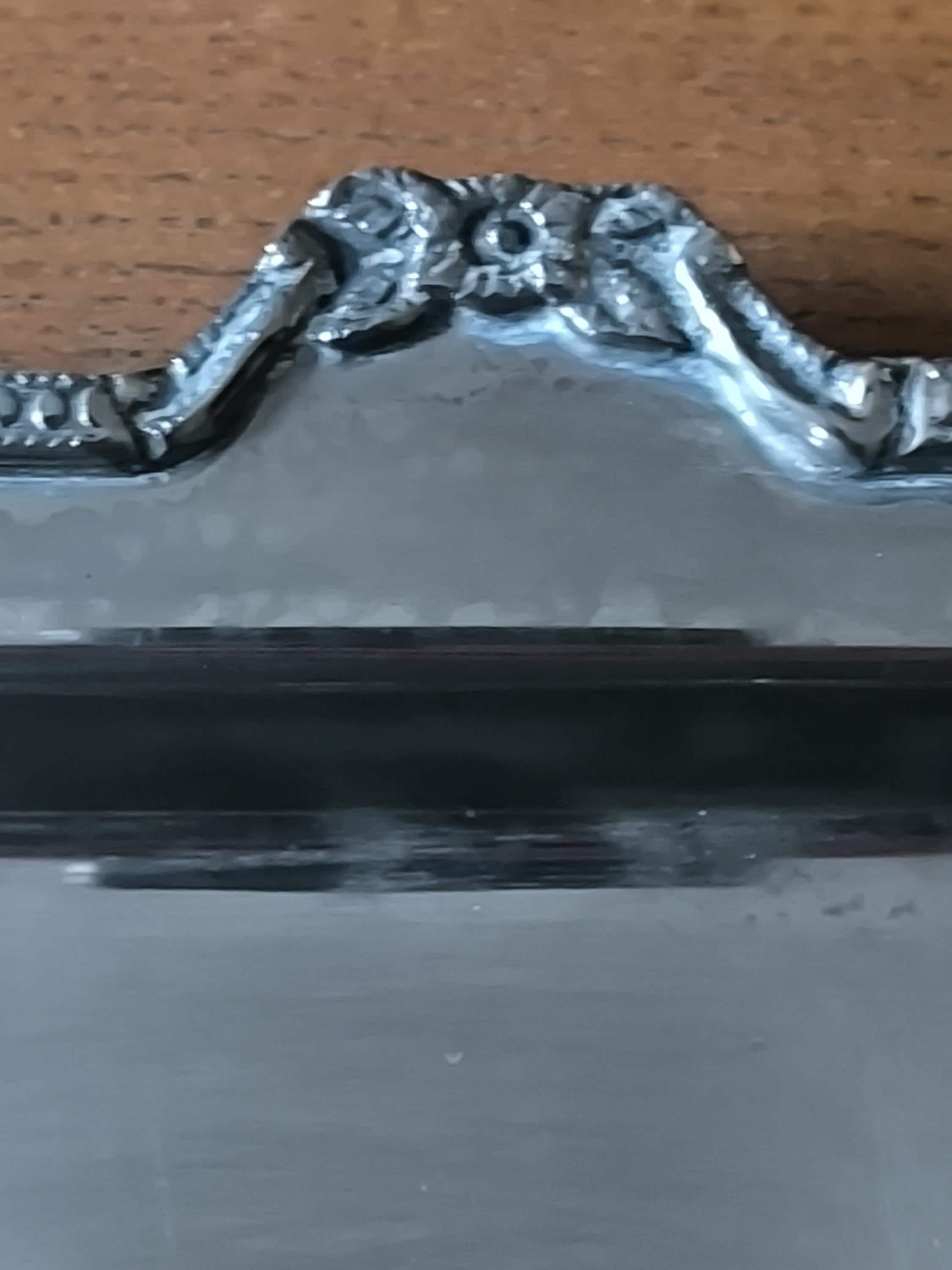 Its flat, reflective surface is adorned with an elegant interlacing pattern, possibly an engraved monogram, adding a touch of history and character. The delicately crafted edges, adorned with floral motifs and a pearl finish, demonstrate quality craftsmanship. The side handles, made of light-colored material, likely bovine bone or another natural material, provide a comfortable grip and complete the design with a touch of authenticity.