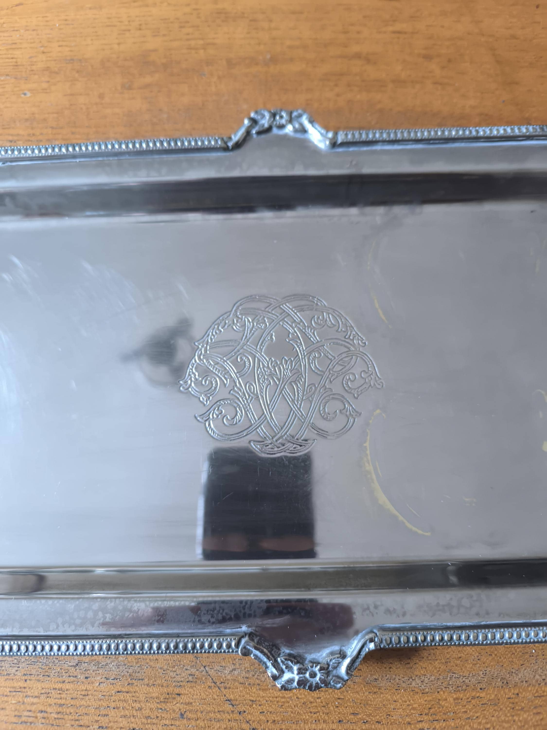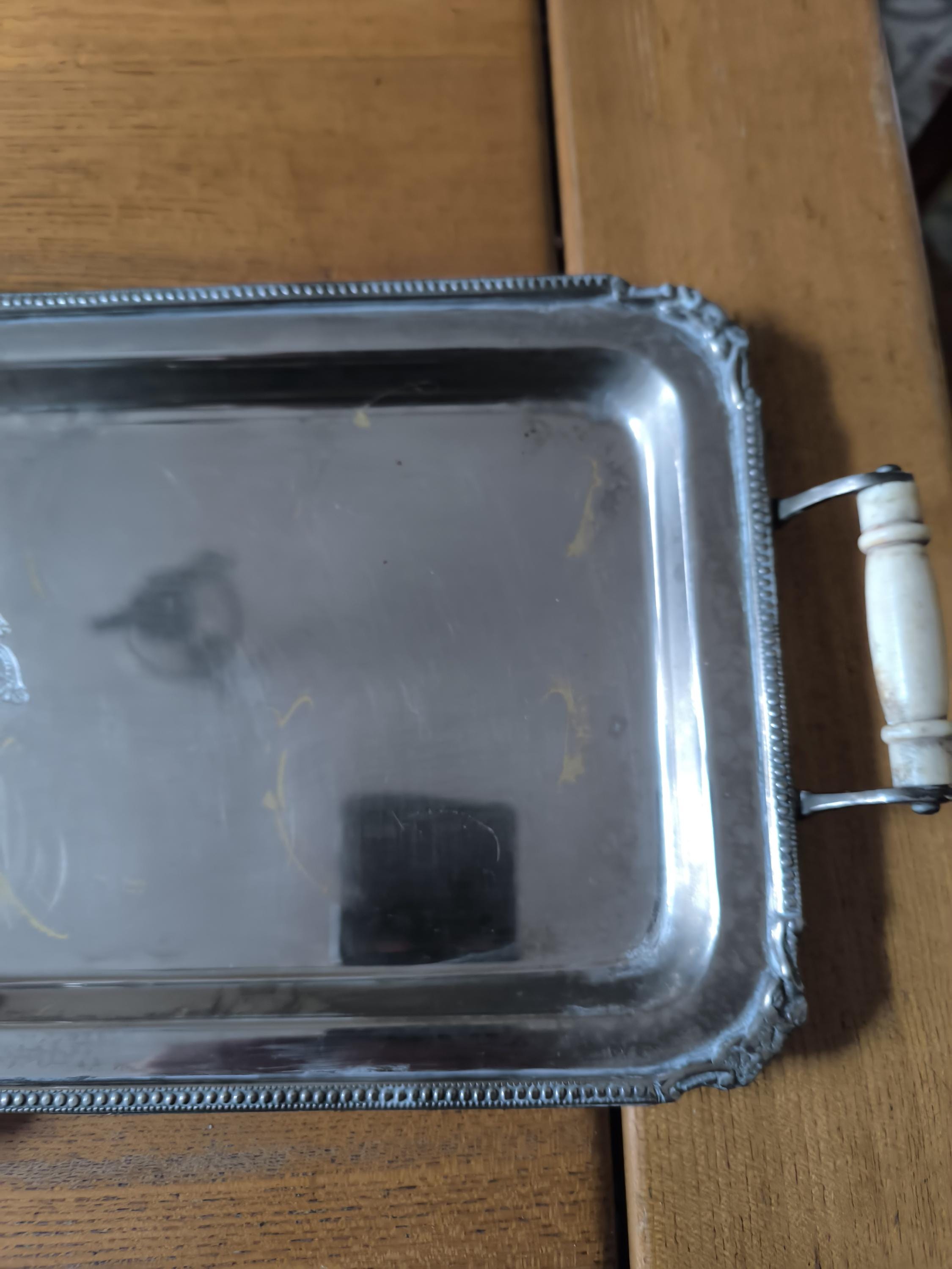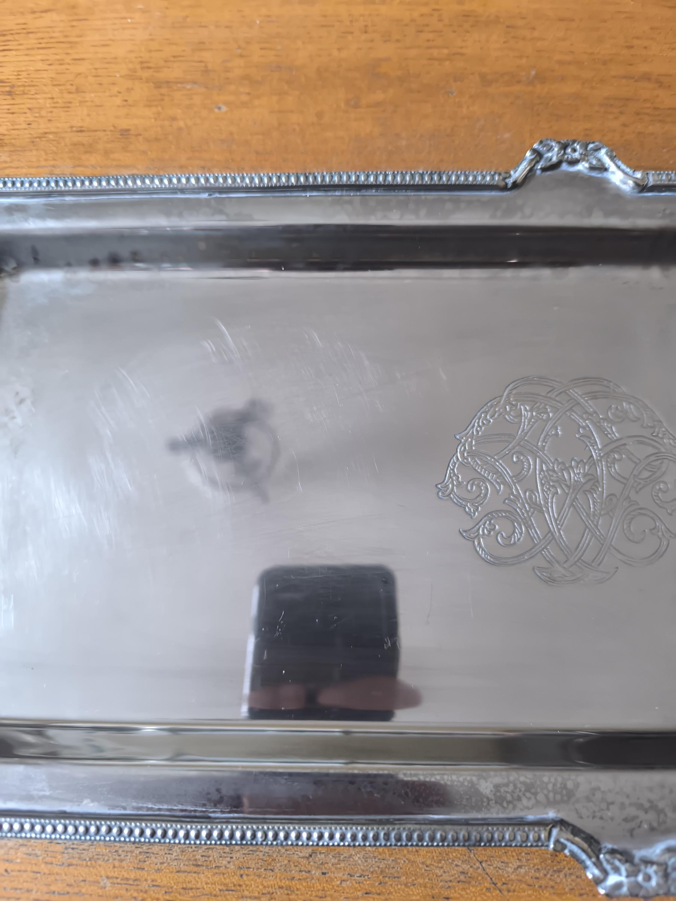 Antique Silver Metal Serving Tray with Monogram - Vintage Elegance