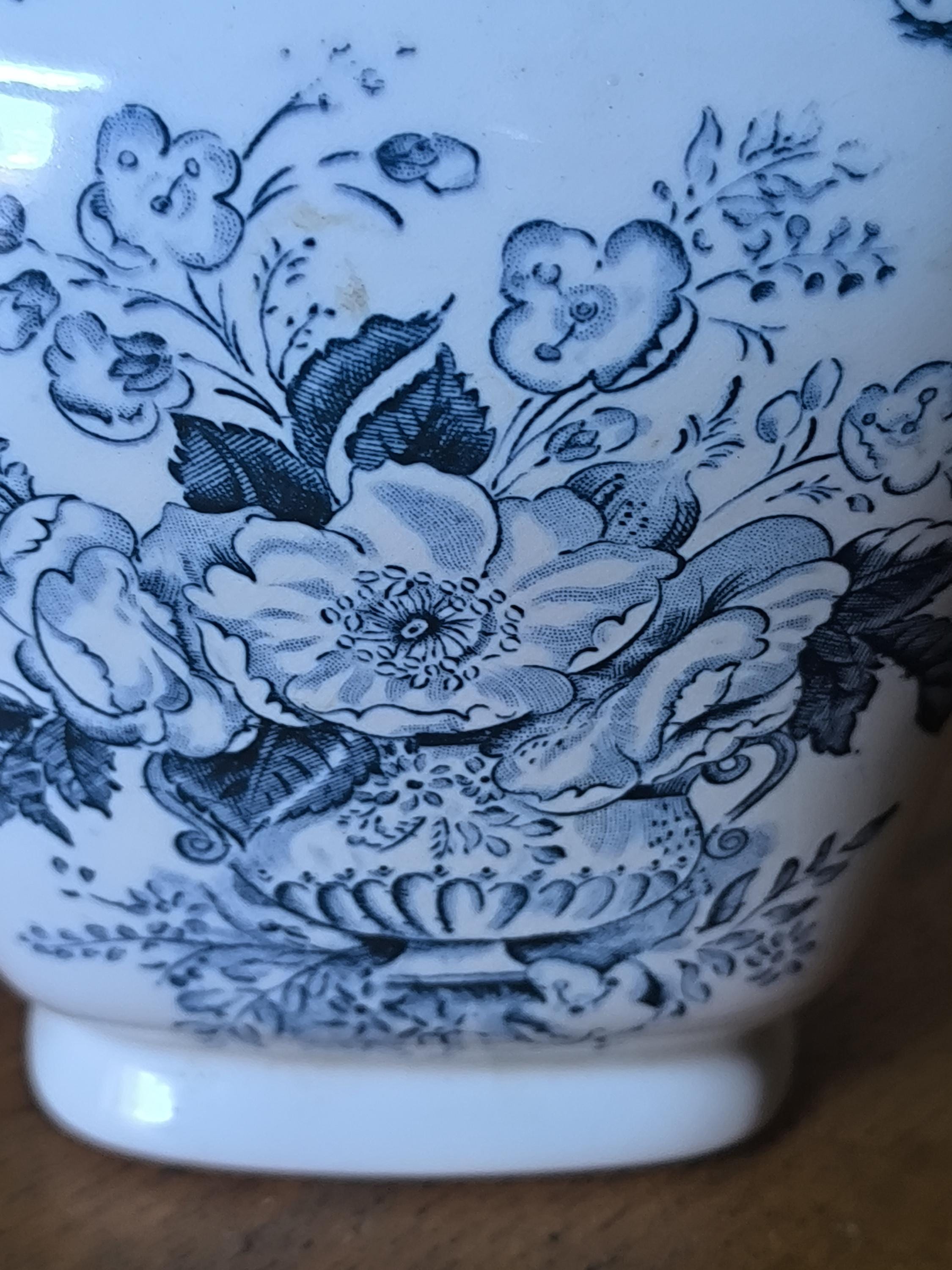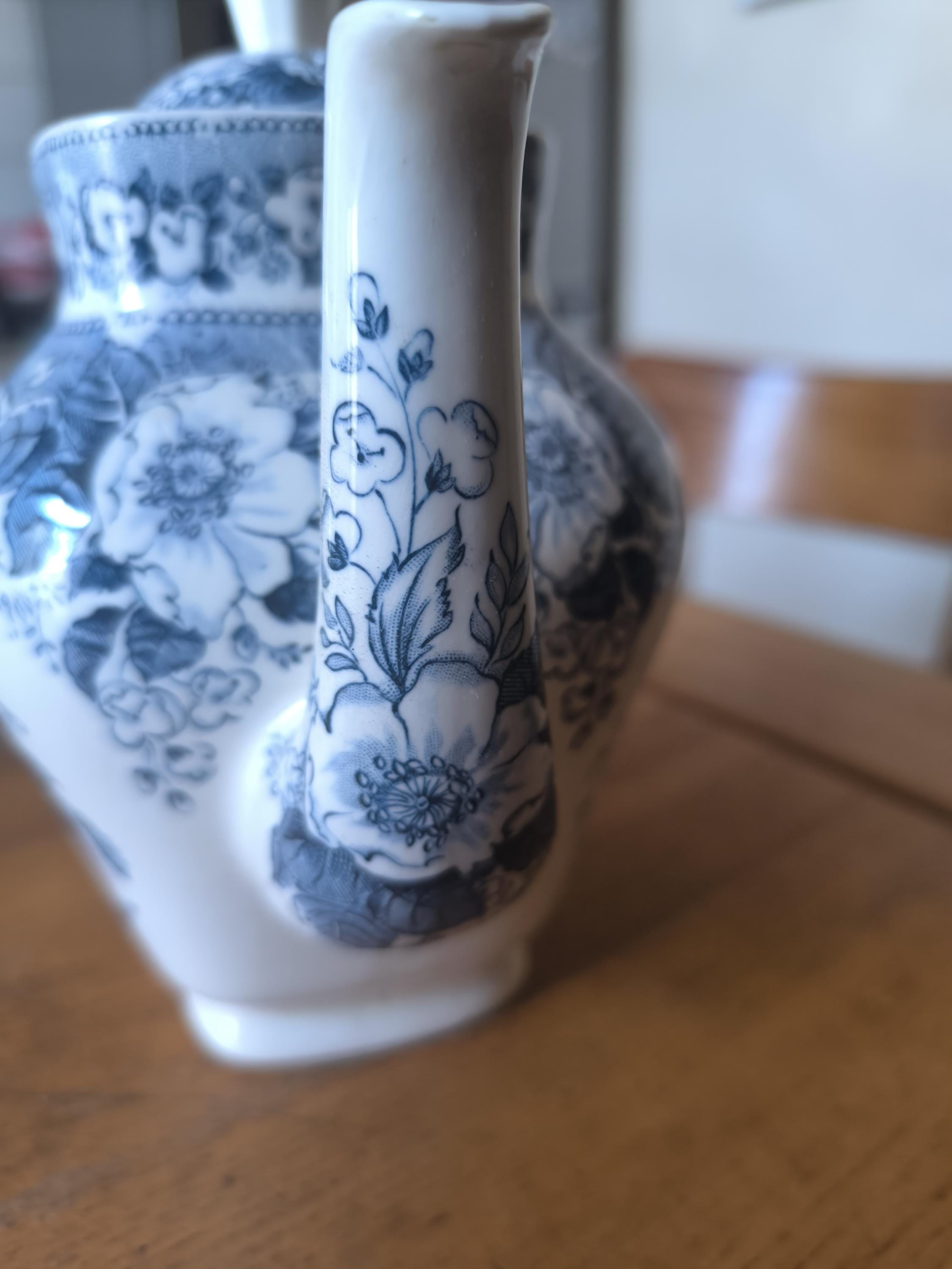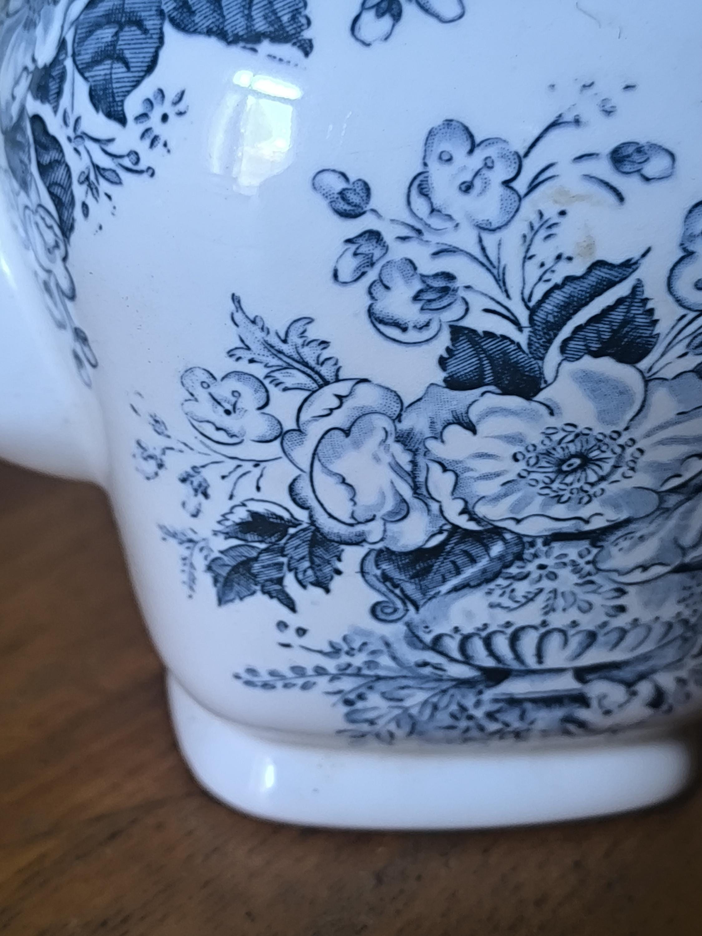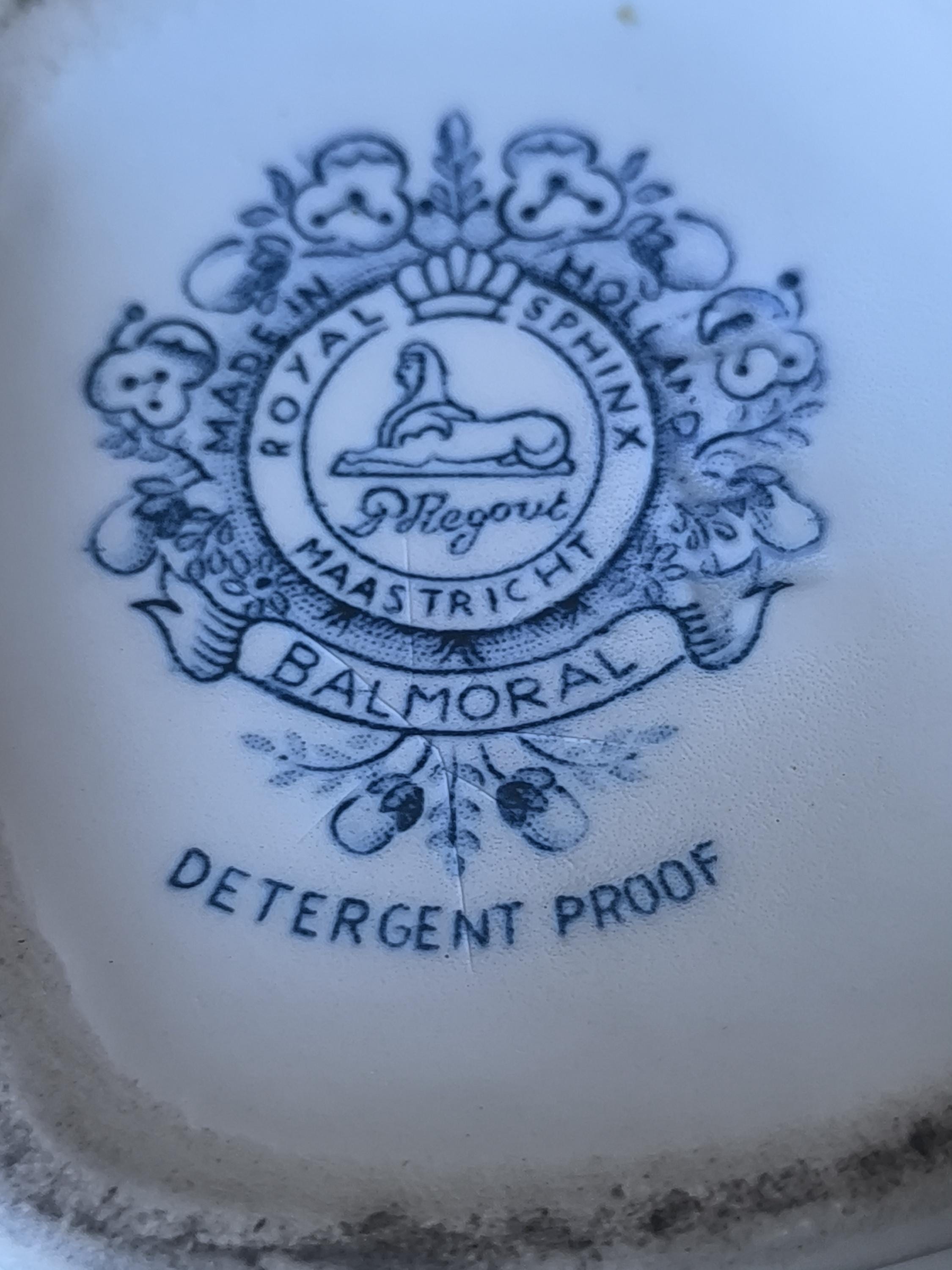 This beautiful vintage teapot from Royal Sphinx, Petrus Regout, made in Maastricht, Holland, is a magnificent example of Balmoral pattern earthenware. Its main color is white, enhanced by a detailed floral design in cobalt blue. The pattern features roses, foliage, and other flowers in a classic and timeless style. The teapot has an elegant shape with a curved handle, a slender spout, and a lid topped with a decorative knob. The base of the teapot is adorned with the brand's seal, inscribed "Made in Holland," "Royal Sphinx," "Maastricht," "Balmoral," and "Detergent Proof." This seal is surrounded by a stylized crown and a reclining sphinx, symbols of the manufacturer. The quality of the earthenware and the exquisite decoration make it an attractive collector's item for lovers of antique porcelain and interior design.