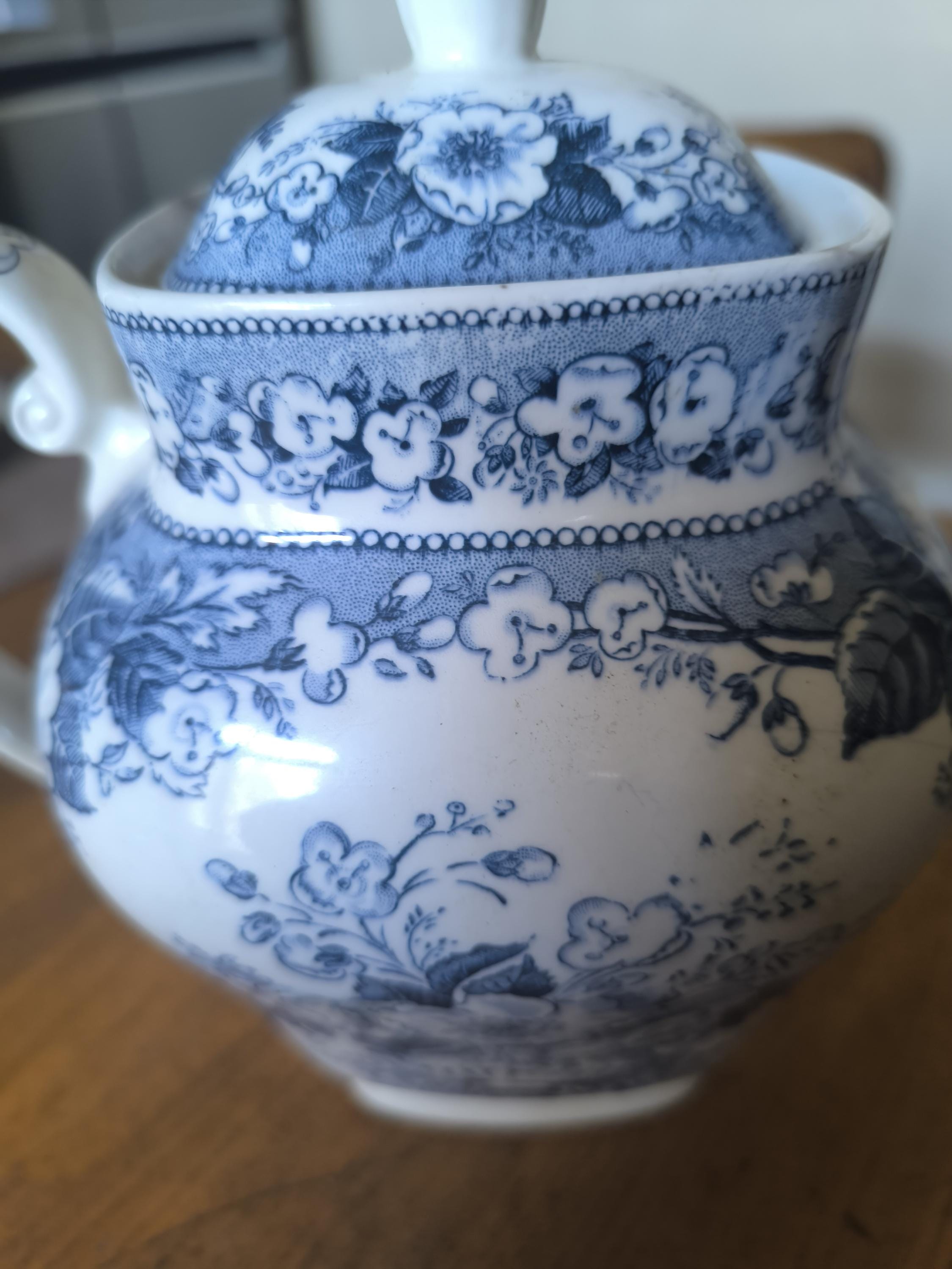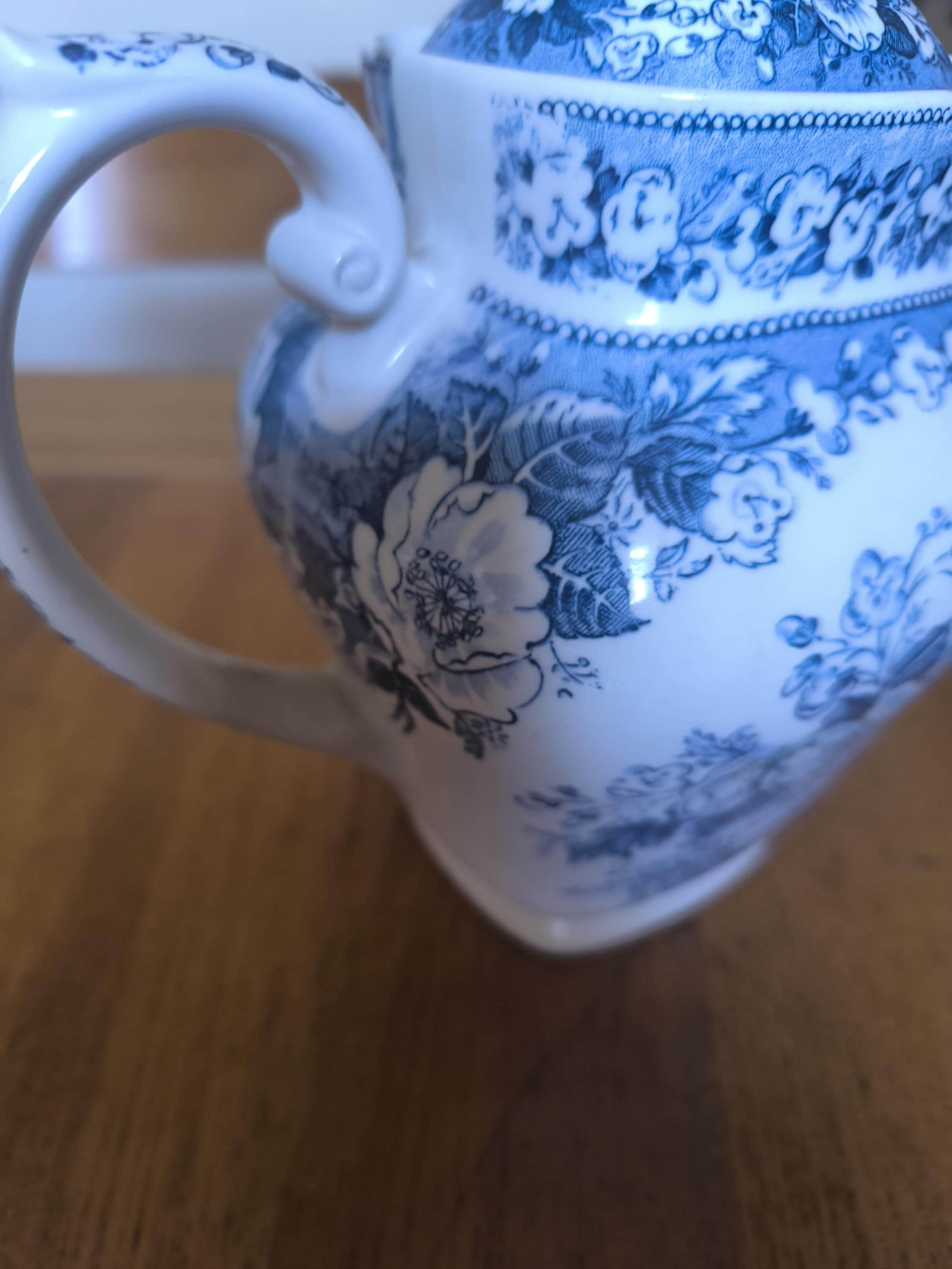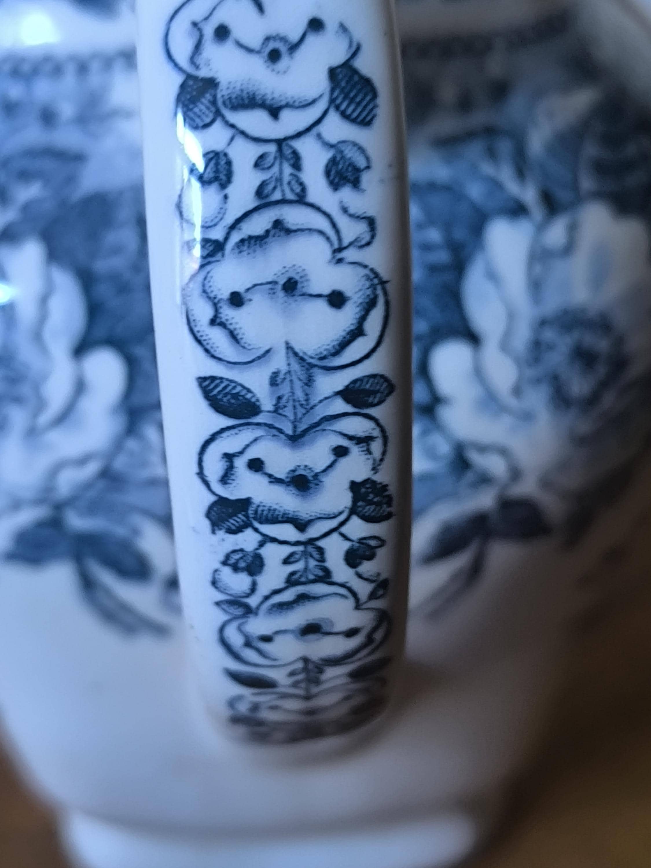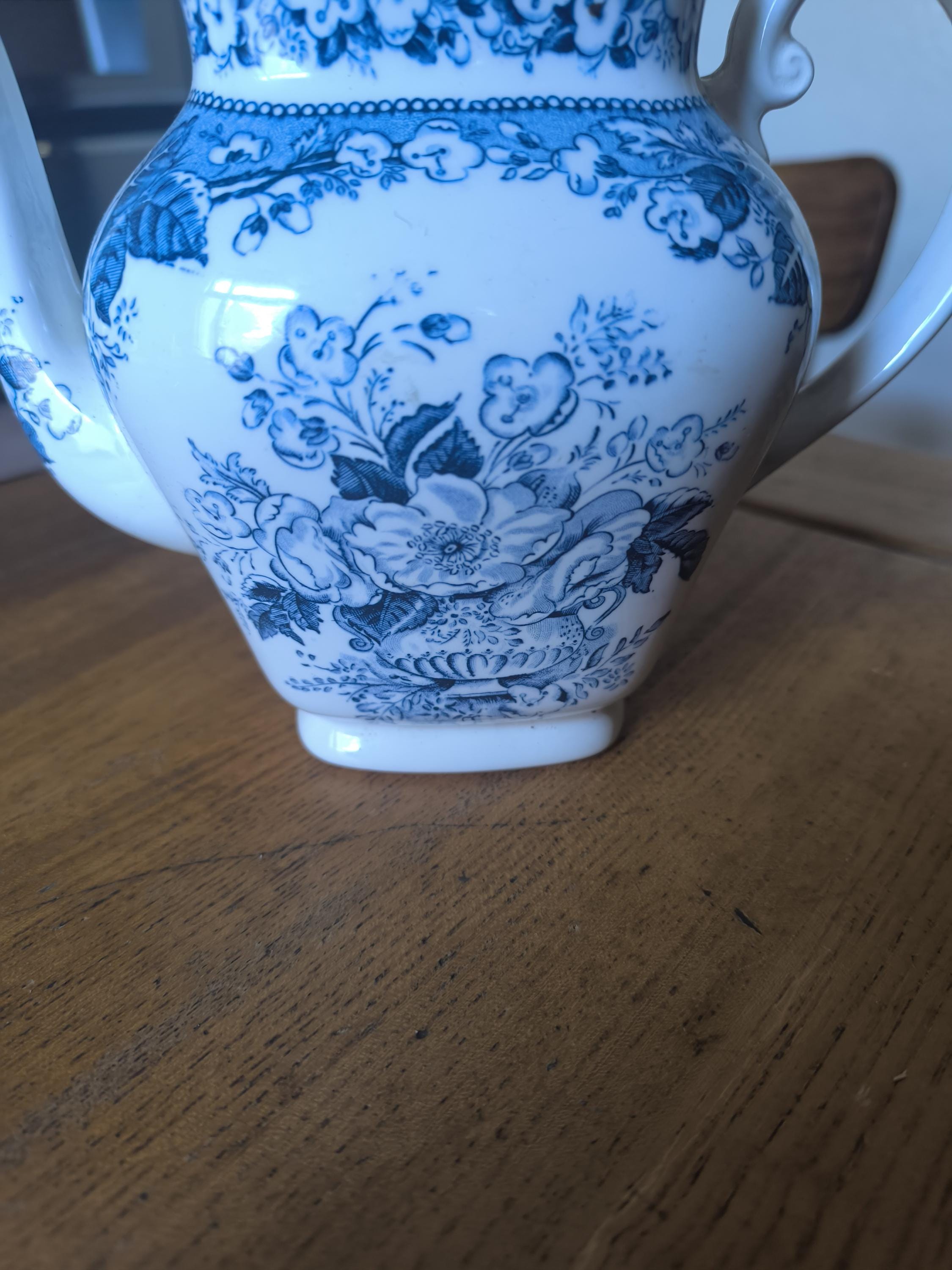 This beautiful vintage teapot from Royal Sphinx, Petrus Regout, made in Maastricht, Holland, is a magnificent example of Balmoral pattern earthenware. Its main color is white, enhanced by a detailed floral design in cobalt blue. The pattern features roses, foliage, and other flowers in a classic and timeless style. The teapot has an elegant shape with a curved handle, a slender spout, and a lid topped with a decorative knob. The base of the teapot is adorned with the brand's seal, inscribed "Made in Holland," "Royal Sphinx," "Maastricht," "Balmoral," and "Detergent Proof." This seal is surrounded by a stylized crown and a reclining sphinx, symbols of the manufacturer. The quality of the earthenware and the exquisite decoration make it an attractive collector's item for lovers of antique porcelain and interior design.