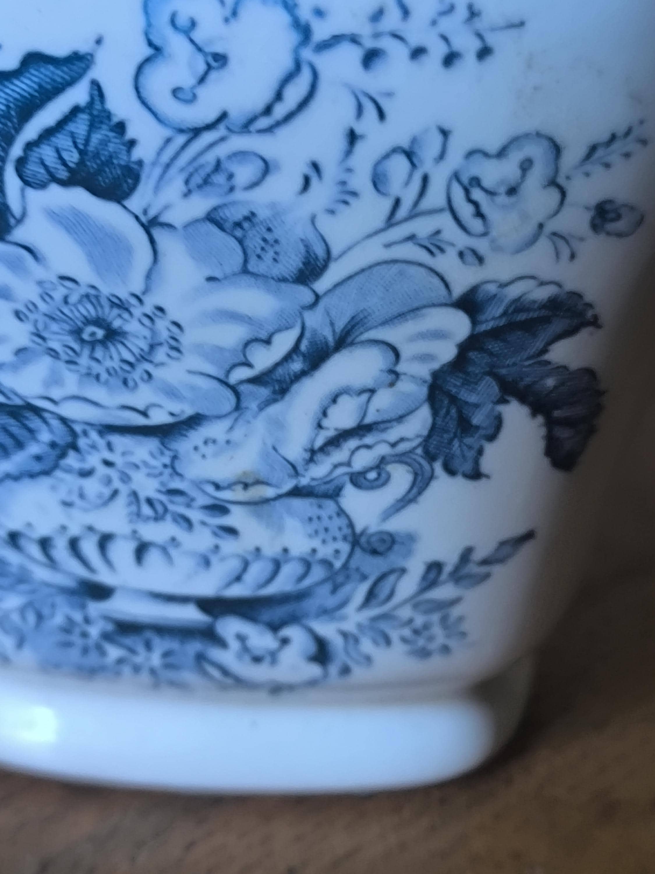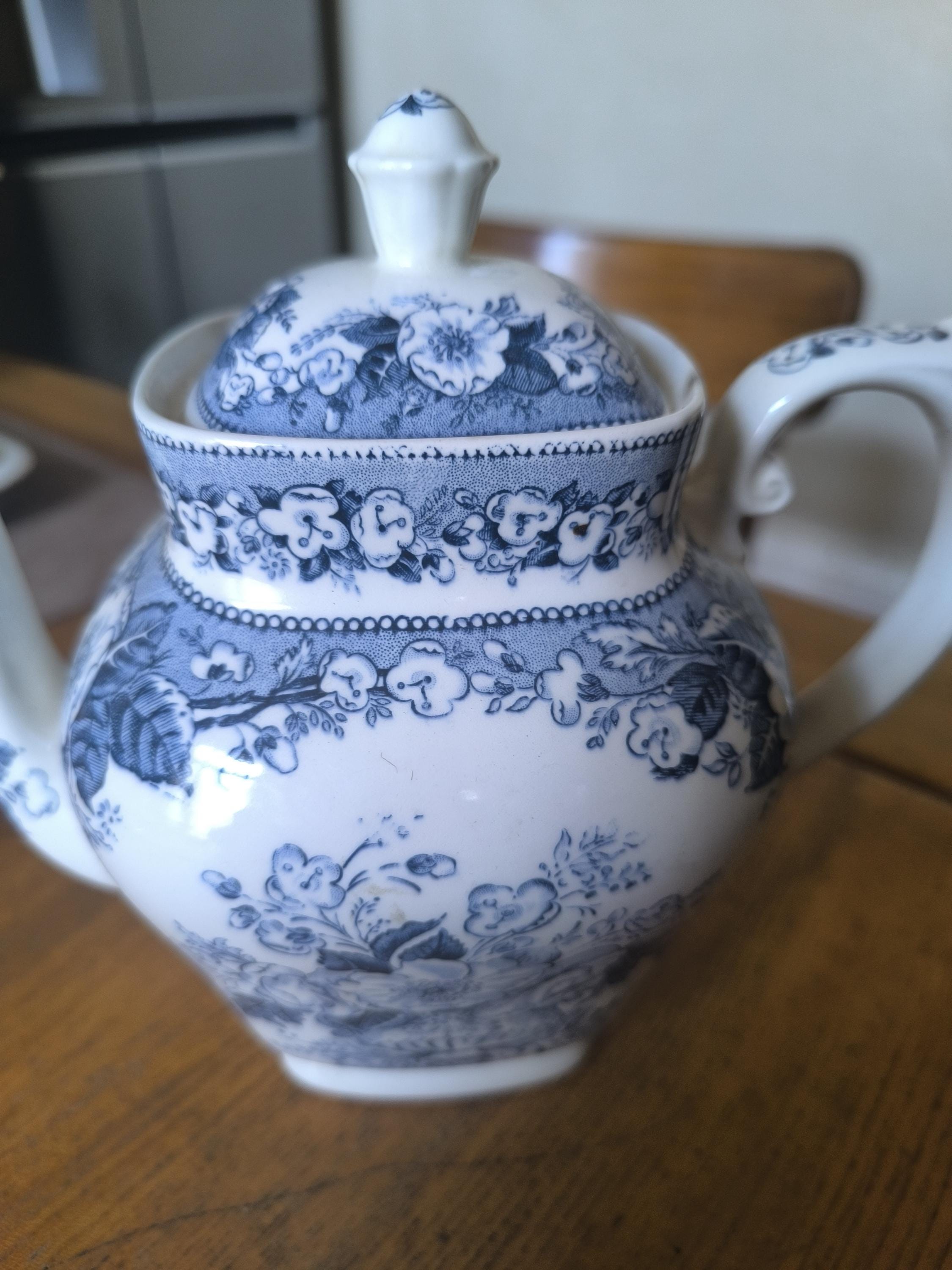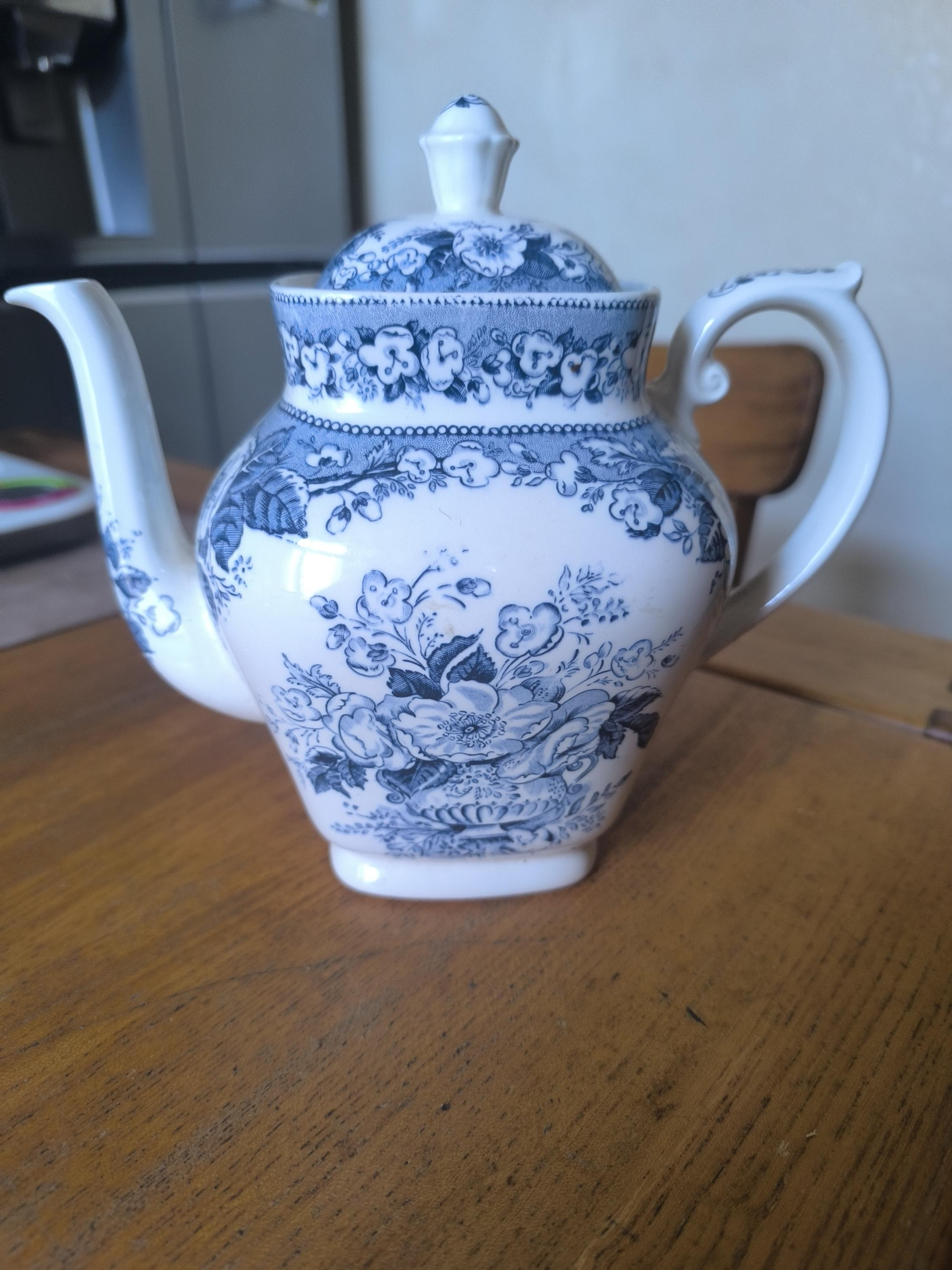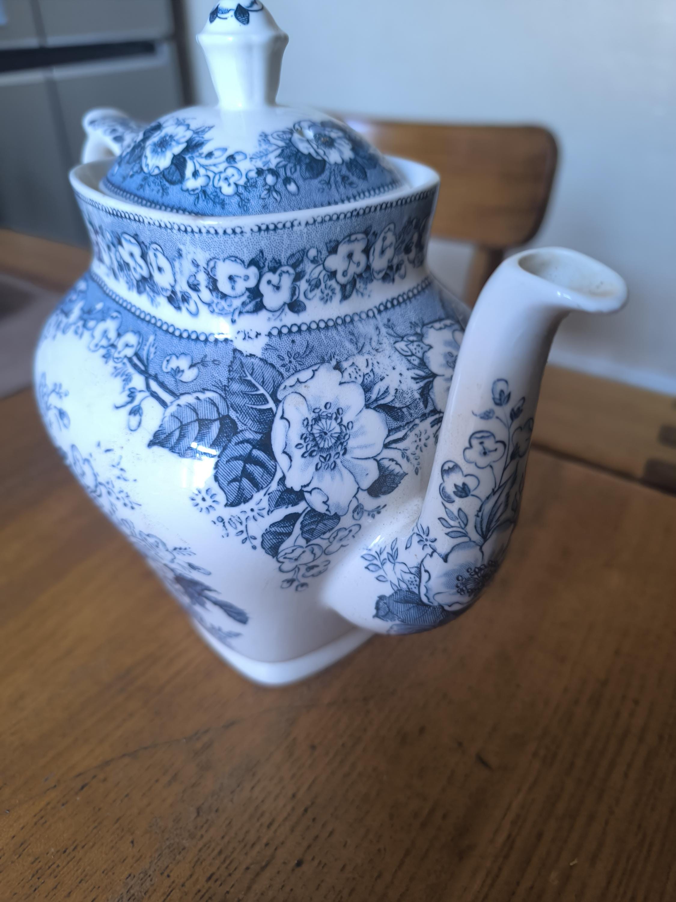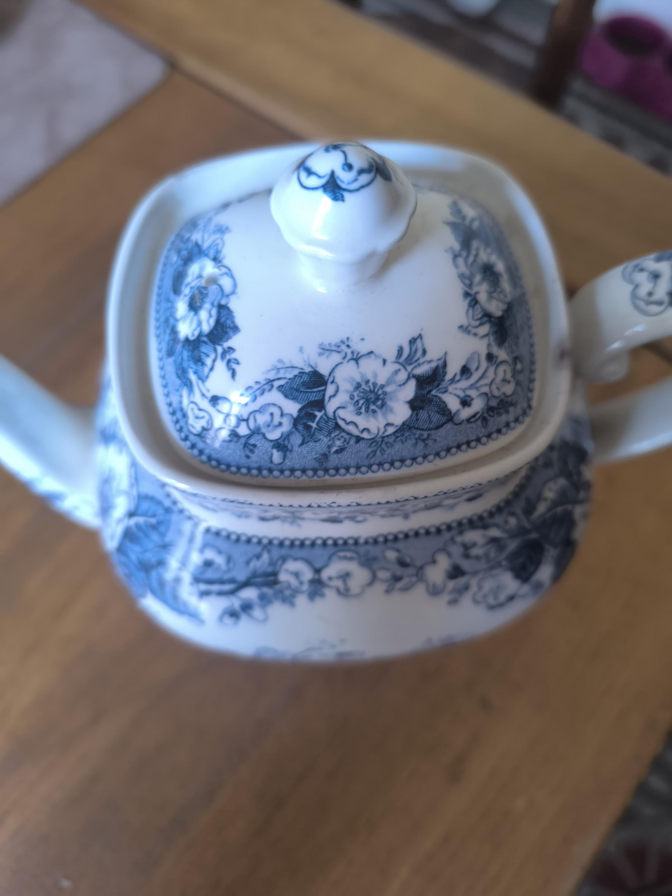 This beautiful vintage teapot from Royal Sphinx, Petrus Regout, made in Maastricht, Holland, is a magnificent example of Balmoral pattern earthenware. Its main color is white, enhanced by a detailed floral design in cobalt blue. The pattern features roses, foliage, and other flowers in a classic and timeless style. The teapot has an elegant shape with a curved handle, a slender spout, and a lid topped with a decorative knob. The base of the teapot is adorned with the brand's seal, inscribed "Made in Holland," "Royal Sphinx," "Maastricht," "Balmoral," and "Detergent Proof." This seal is surrounded by a stylized crown and a reclining sphinx, symbols of the manufacturer. The quality of the earthenware and the exquisite decoration make it an attractive collector's item for lovers of antique porcelain and interior design.