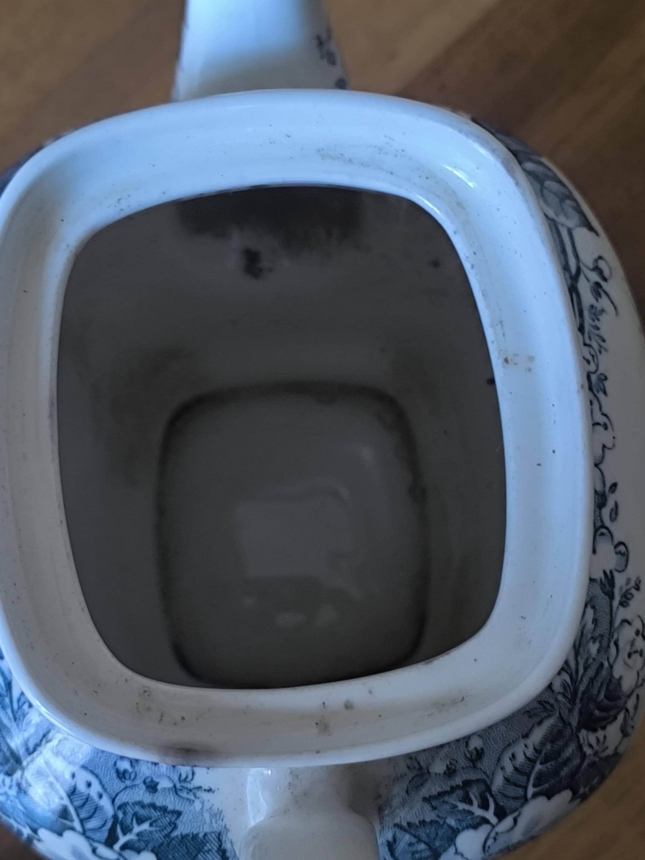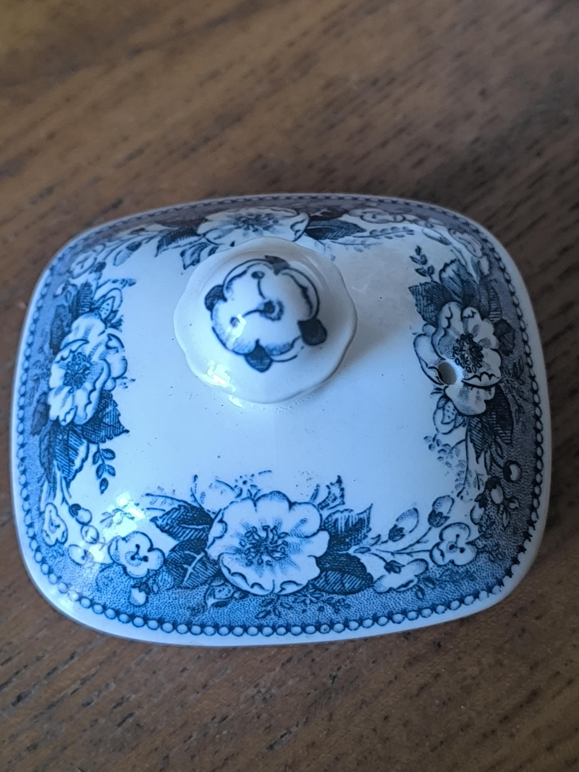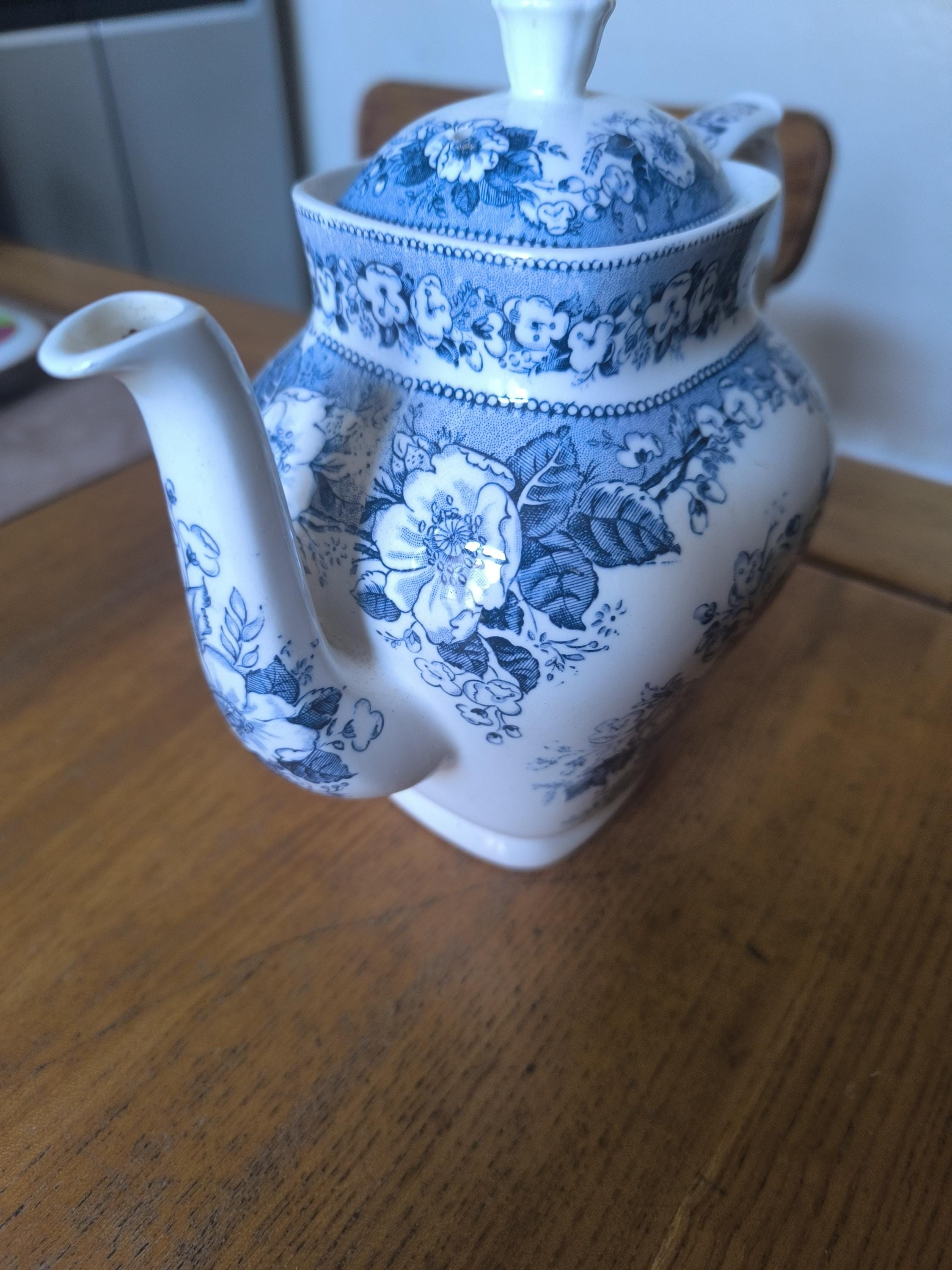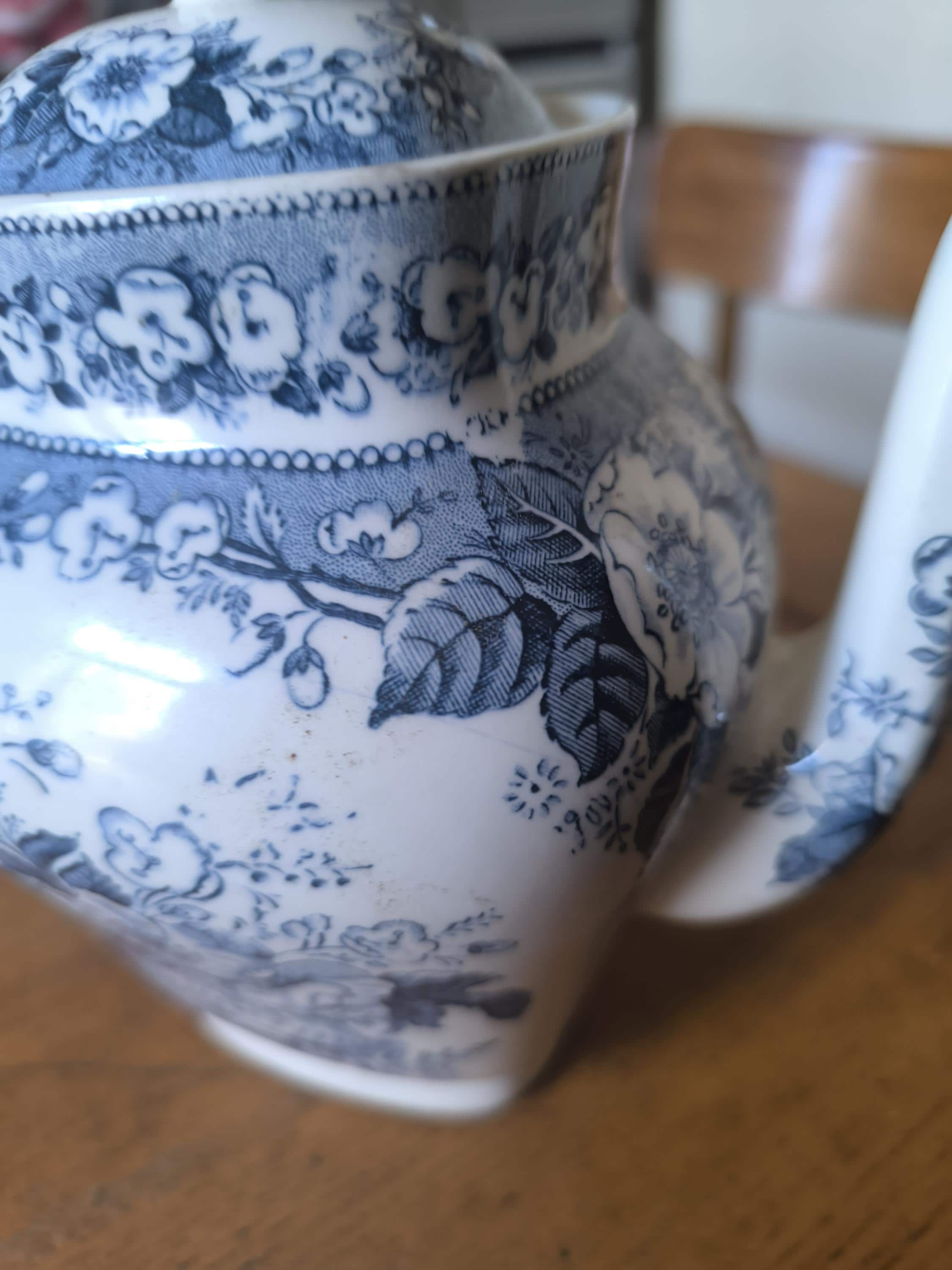 This beautiful vintage teapot from Royal Sphinx, Petrus Regout, made in Maastricht, Holland, is a magnificent example of Balmoral pattern earthenware. Its main color is white, enhanced by a detailed floral design in cobalt blue. The pattern features roses, foliage, and other flowers in a classic and timeless style. The teapot has an elegant shape with a curved handle, a slender spout, and a lid topped with a decorative knob. The base of the teapot is adorned with the brand's seal, inscribed "Made in Holland," "Royal Sphinx," "Maastricht," "Balmoral," and "Detergent Proof." This seal is surrounded by a stylized crown and a reclining sphinx, symbols of the manufacturer. The quality of the earthenware and the exquisite decoration make it an attractive collector's item for lovers of antique porcelain and interior design.