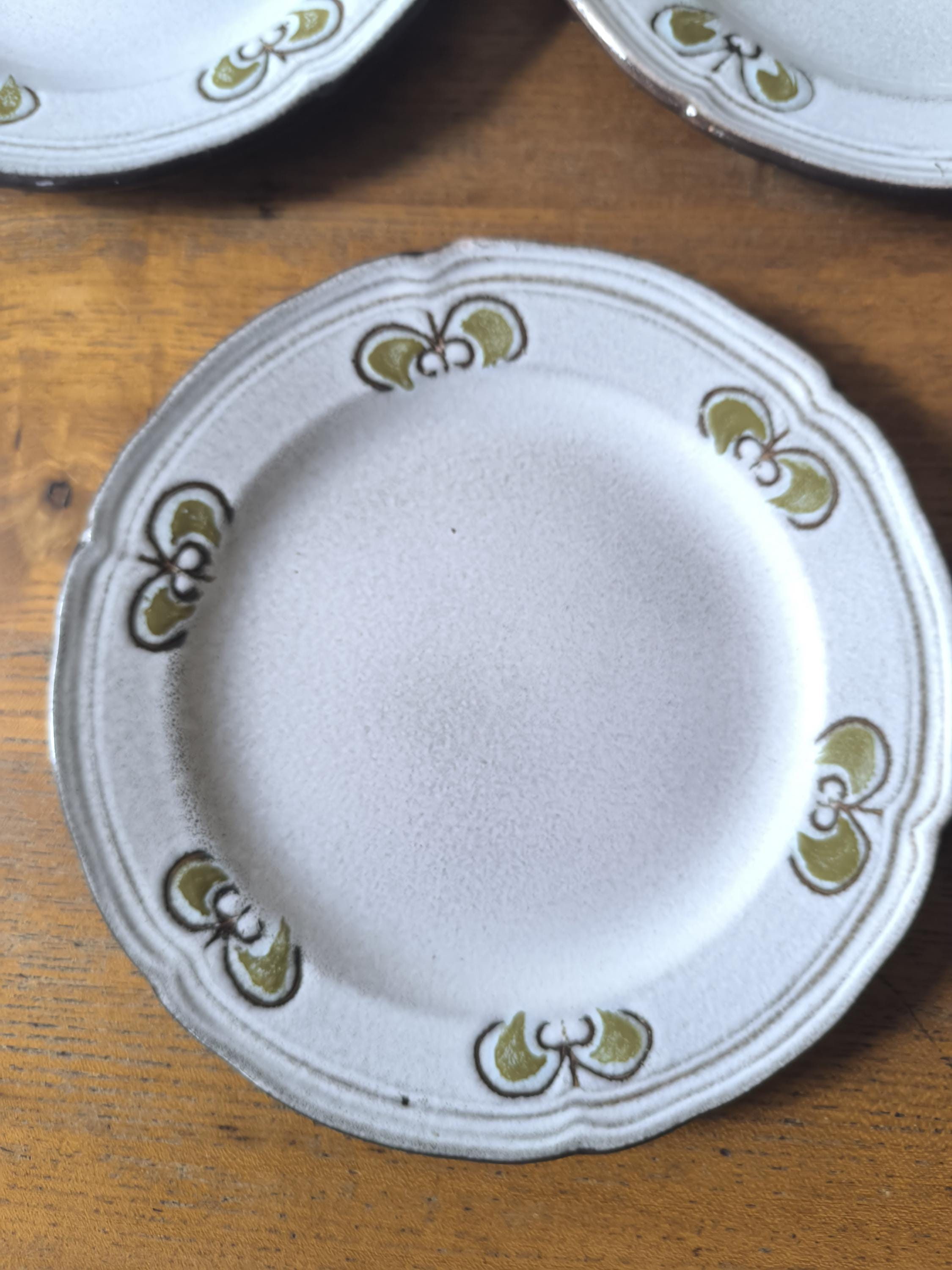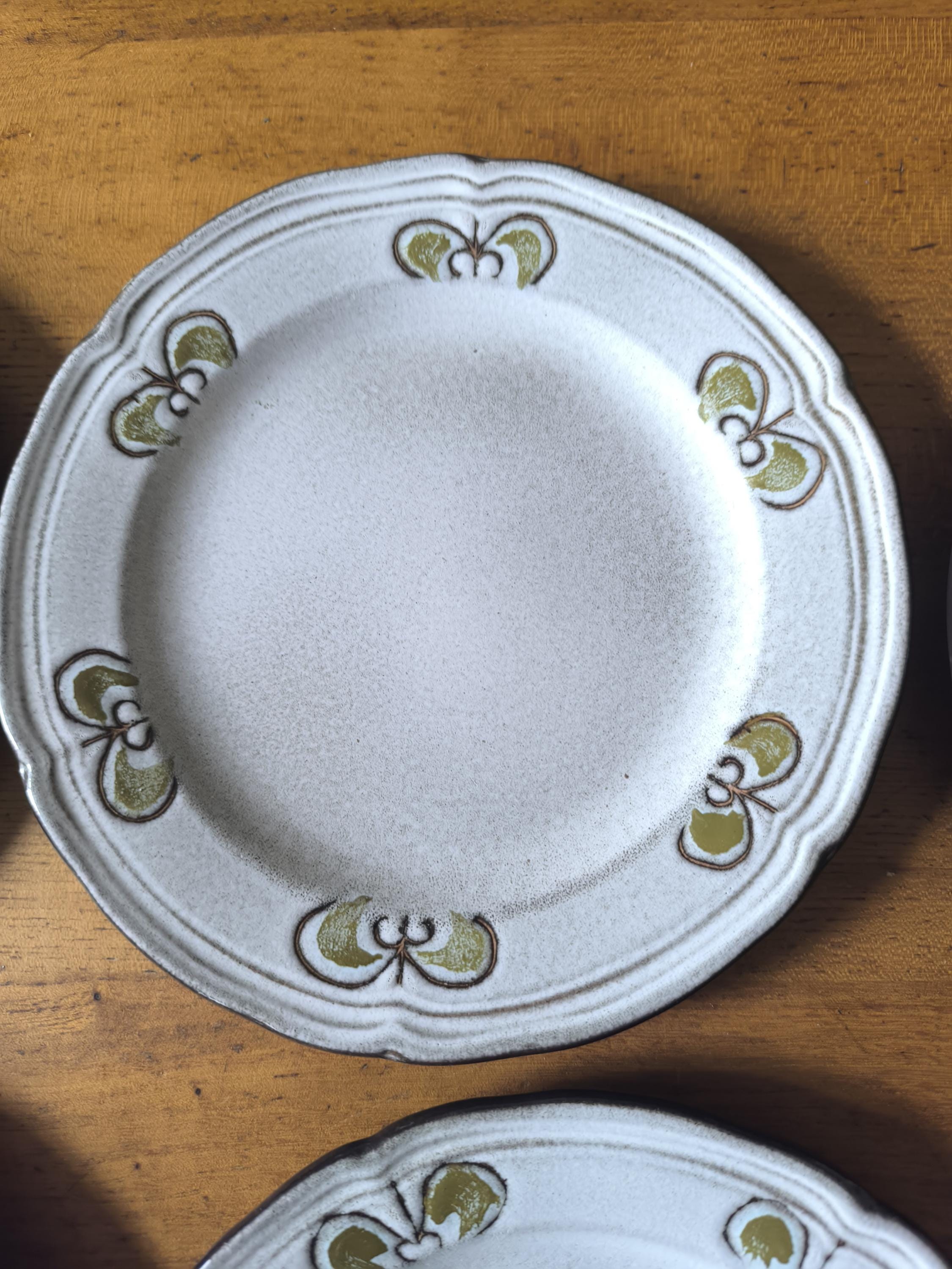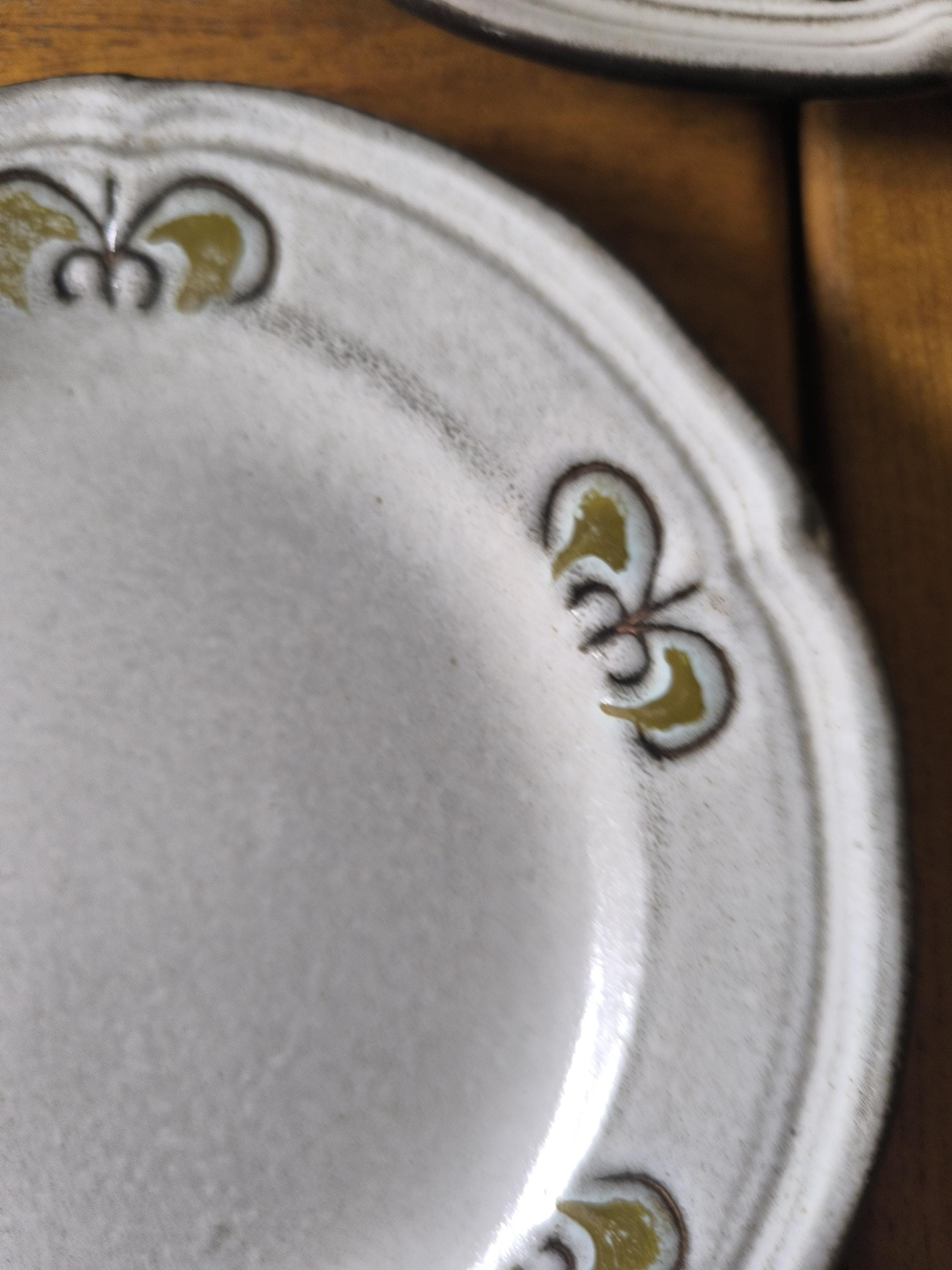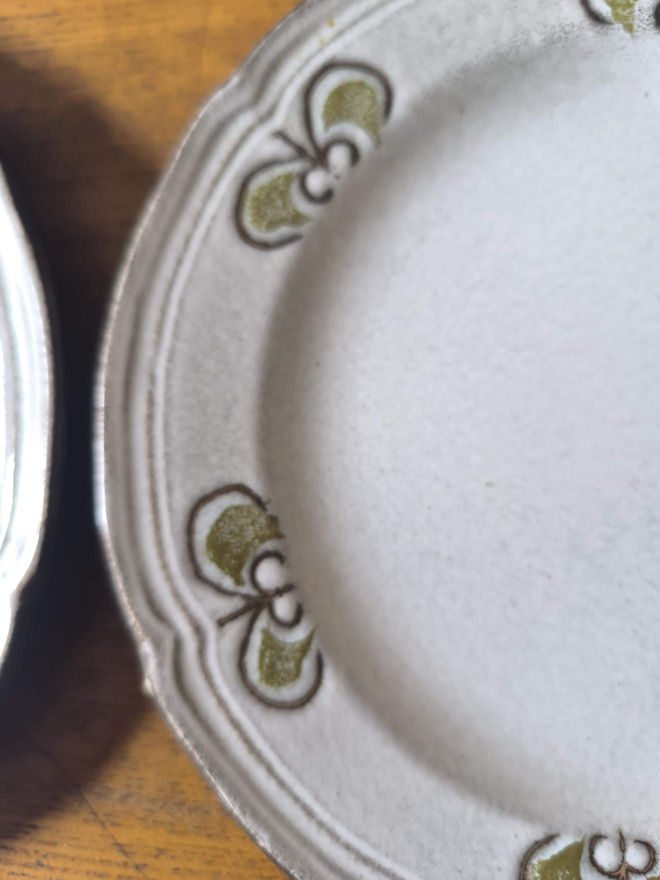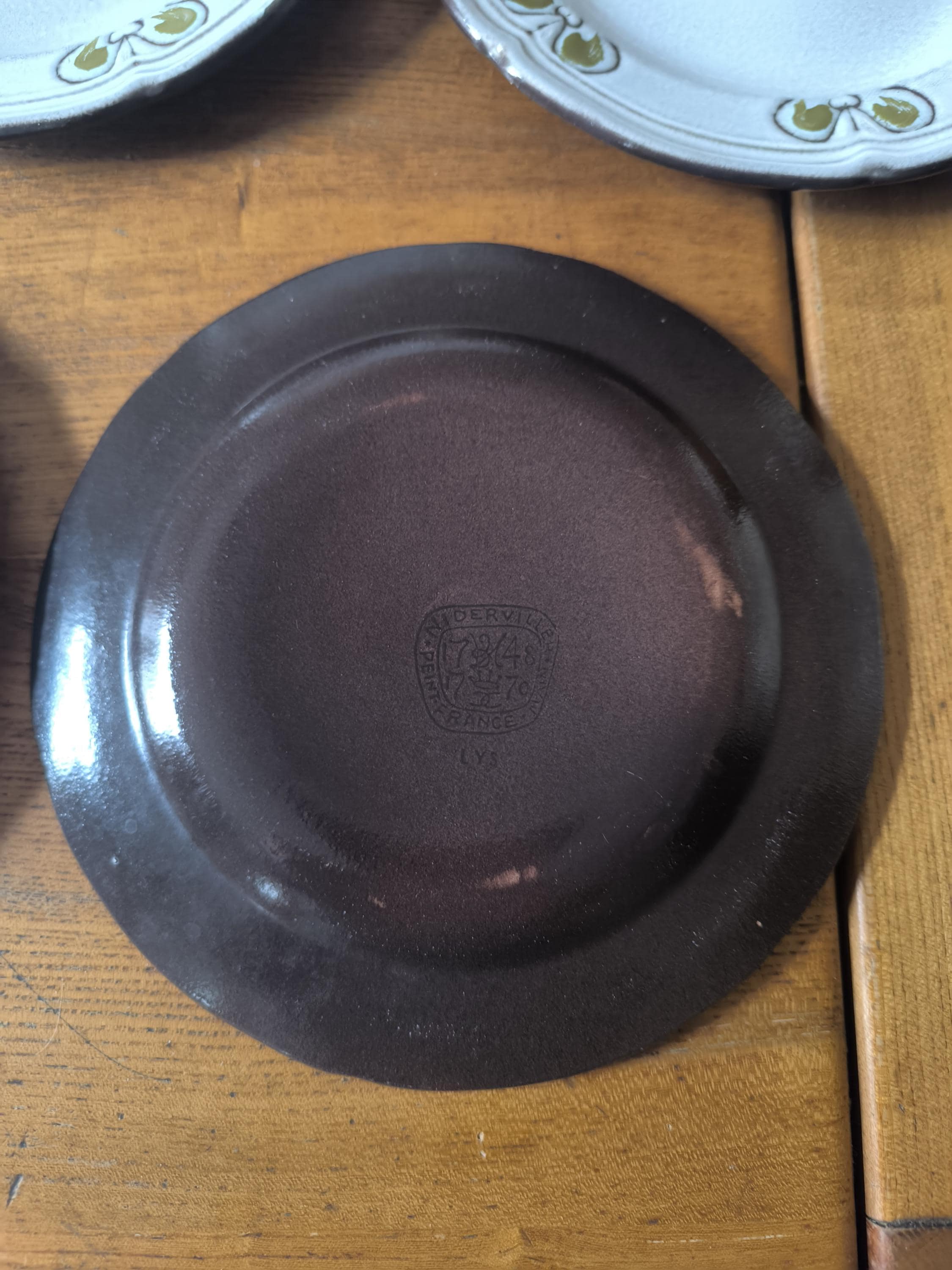 diamètre d'environ 19 cm, une taille parfaite pour les desserts individuels. Le dos de chaque assiette est marqué du sceau de la manufacture, indiquant "Niderviller France", "Lys" attestant de leur authenticité. Ce lot est en excellent état vintage, juste une assiette avec un petit saut d'émail sur la bordure