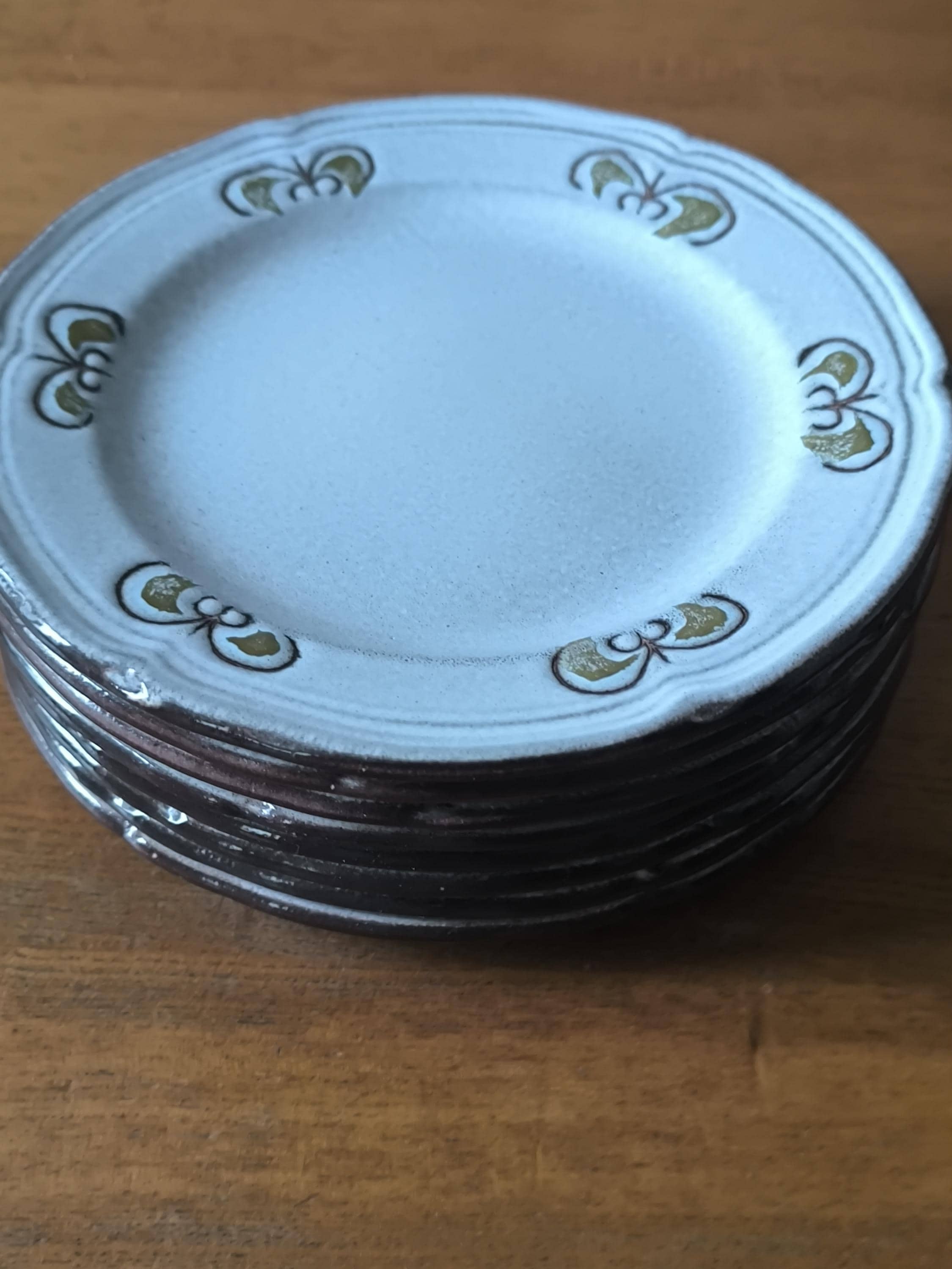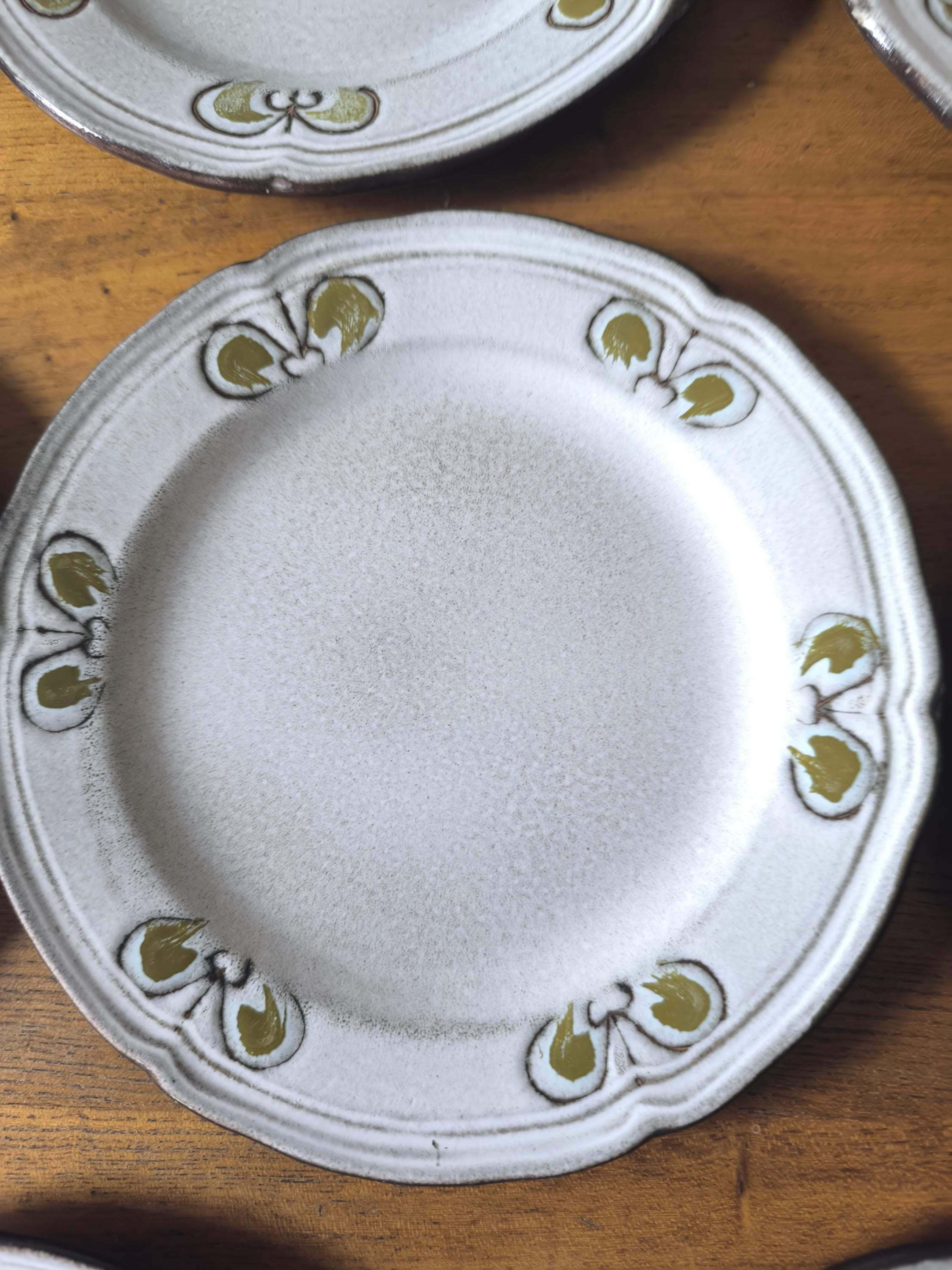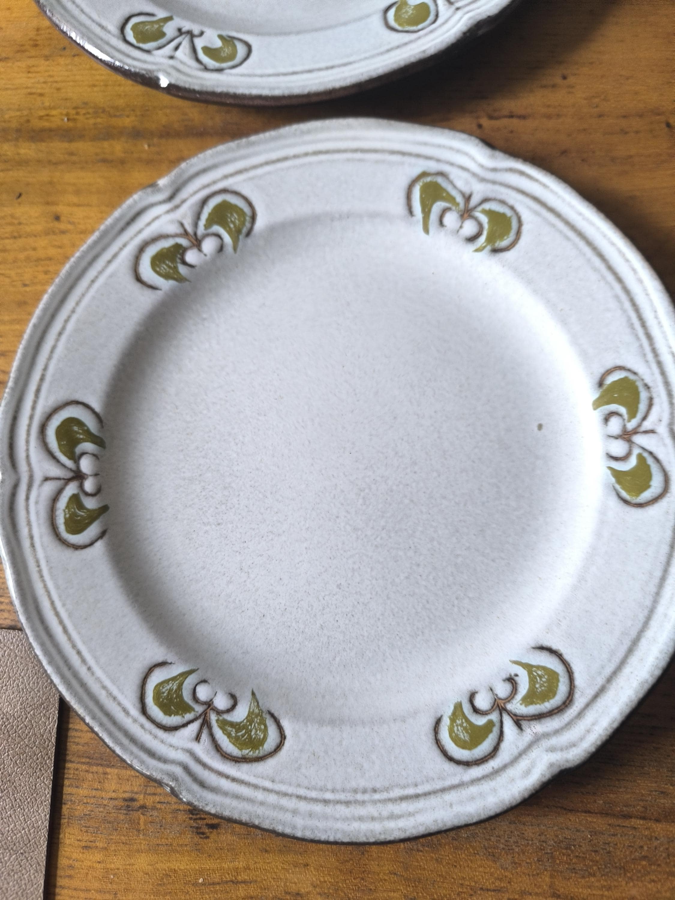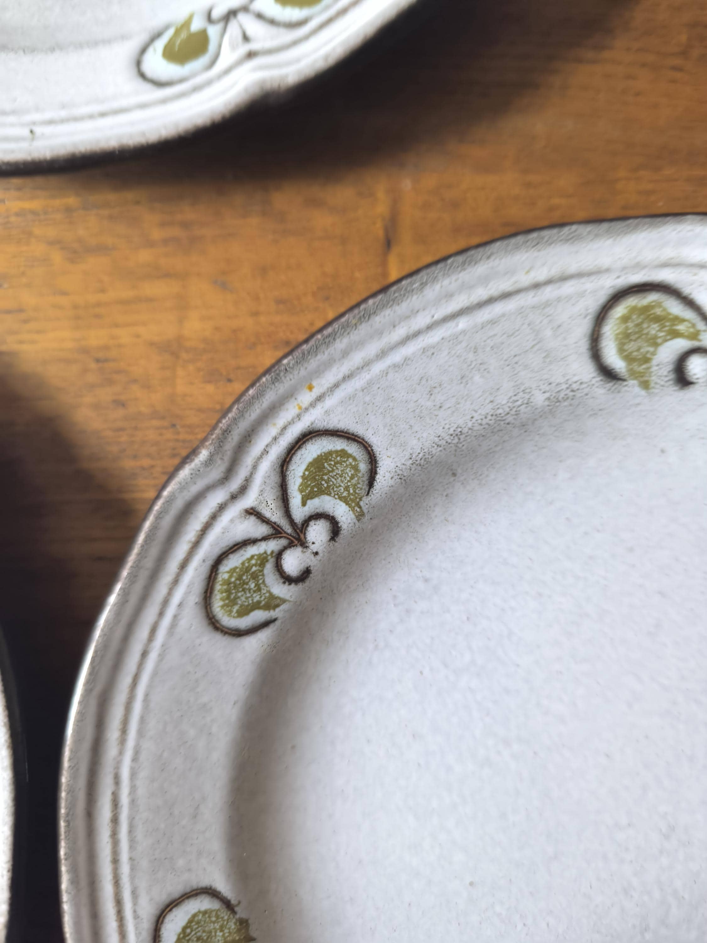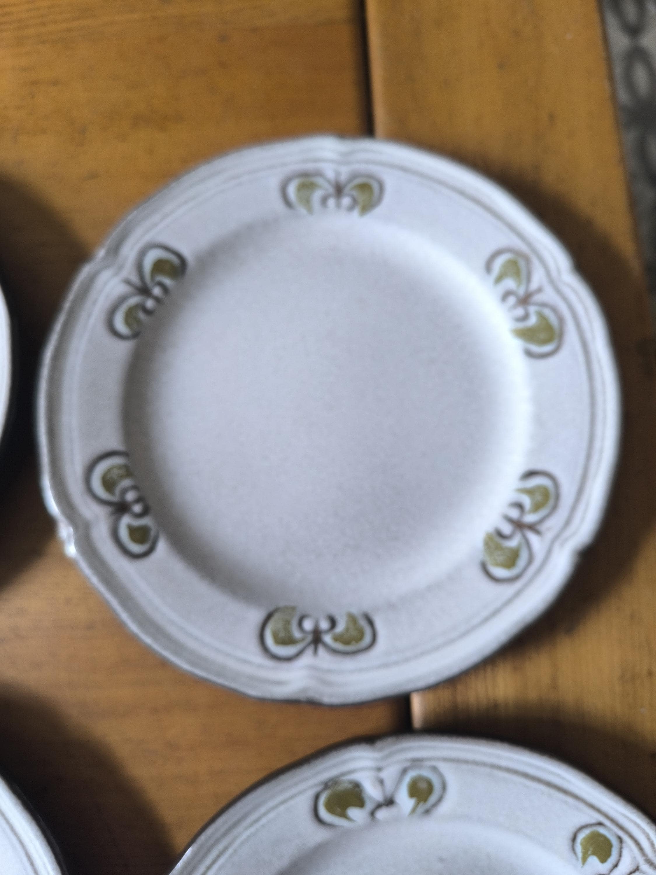 diamètre d'environ 19 cm, une taille parfaite pour les desserts individuels. Le dos de chaque assiette est marqué du sceau de la manufacture, indiquant "Niderviller France", "Lys" attestant de leur authenticité. Ce lot est en excellent état vintage, juste une assiette avec un petit saut d'émail sur la bordure