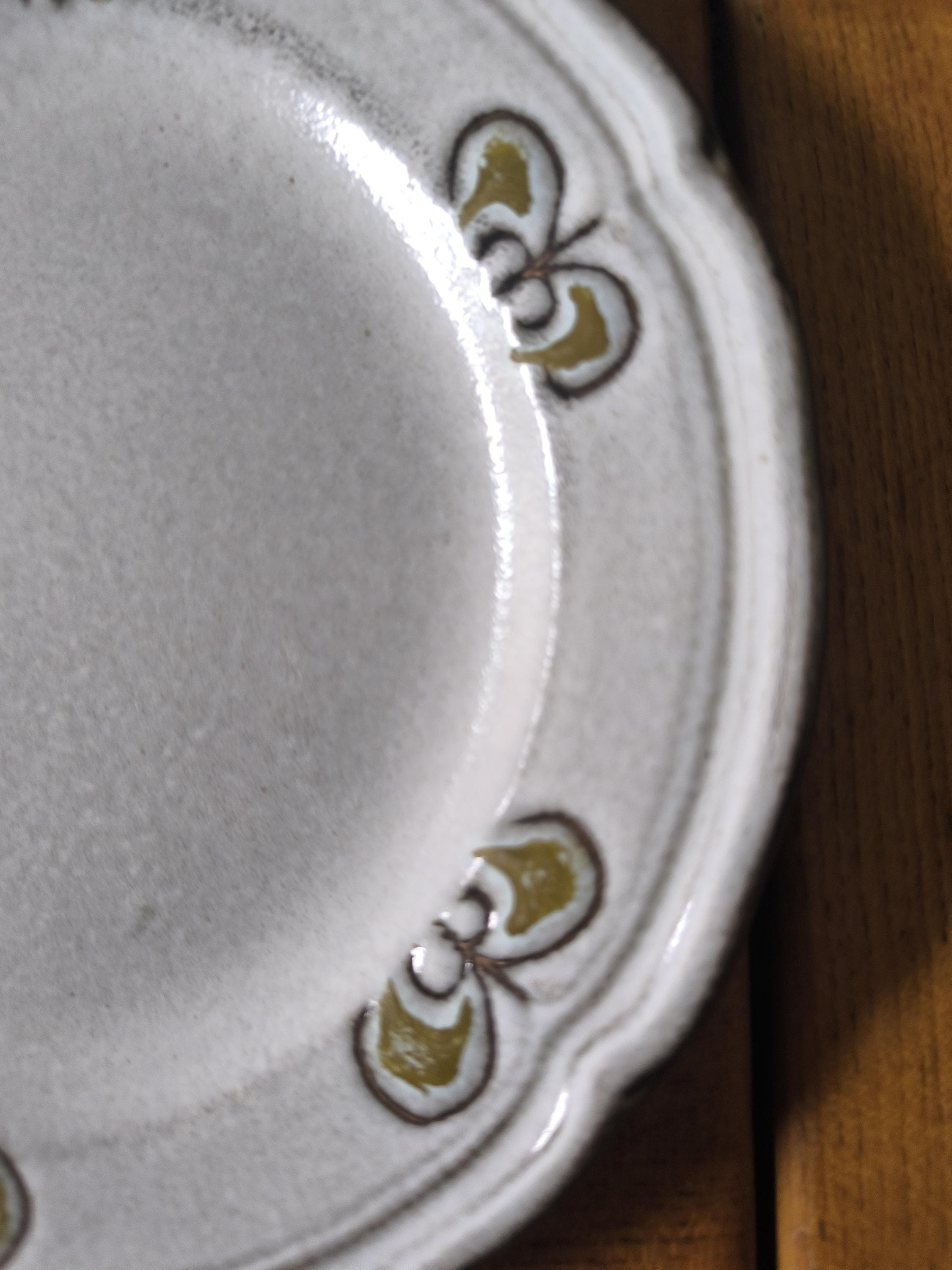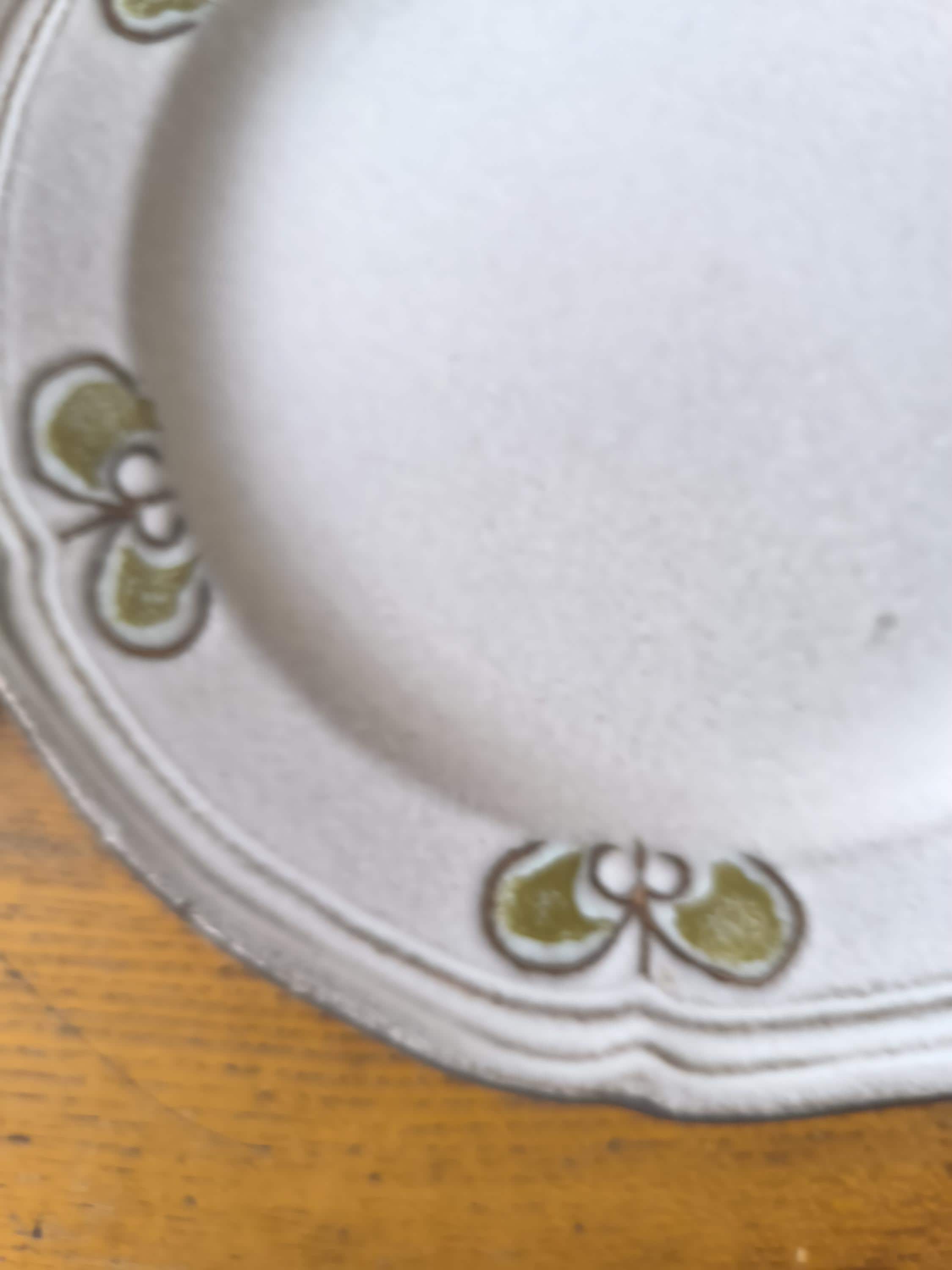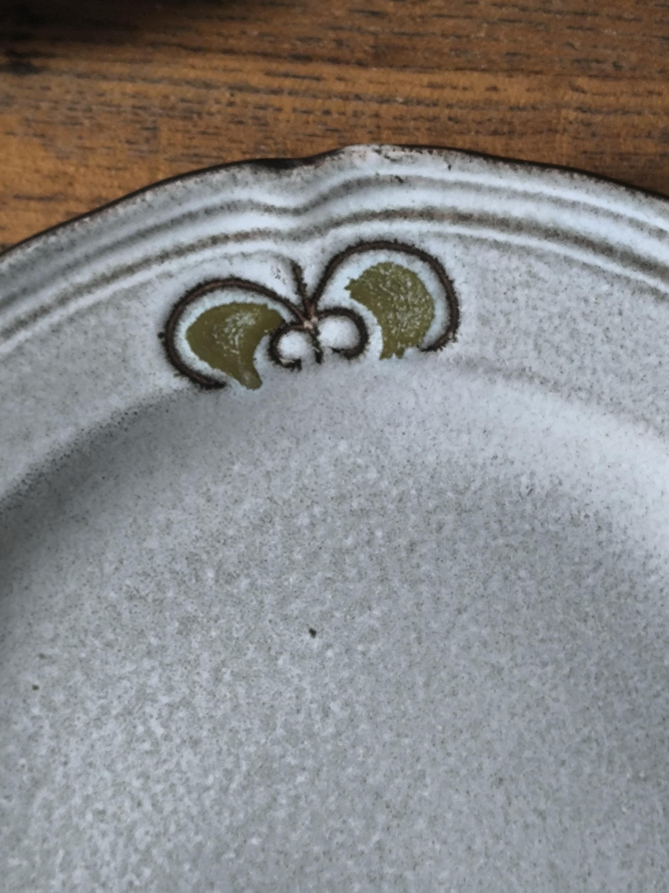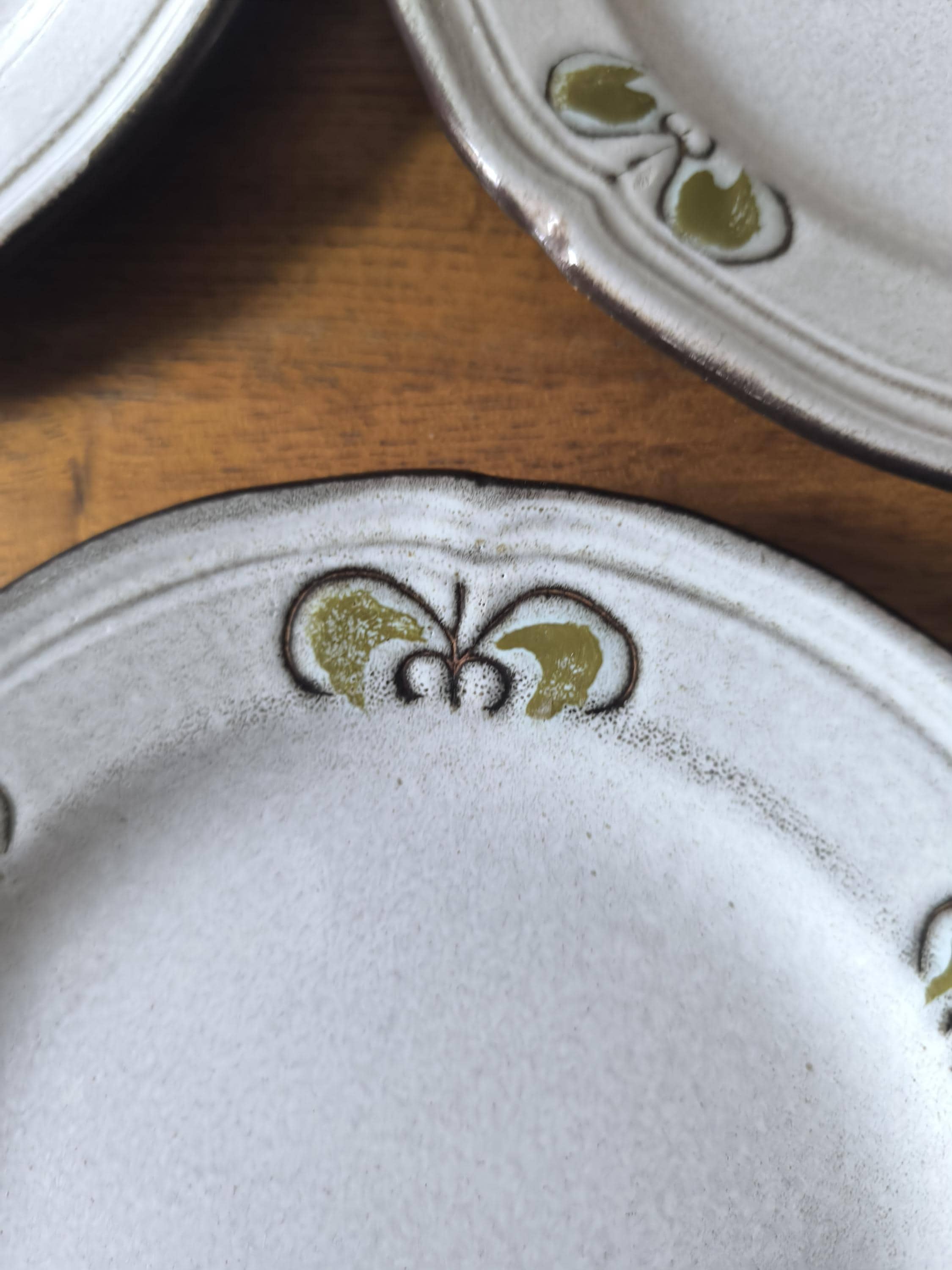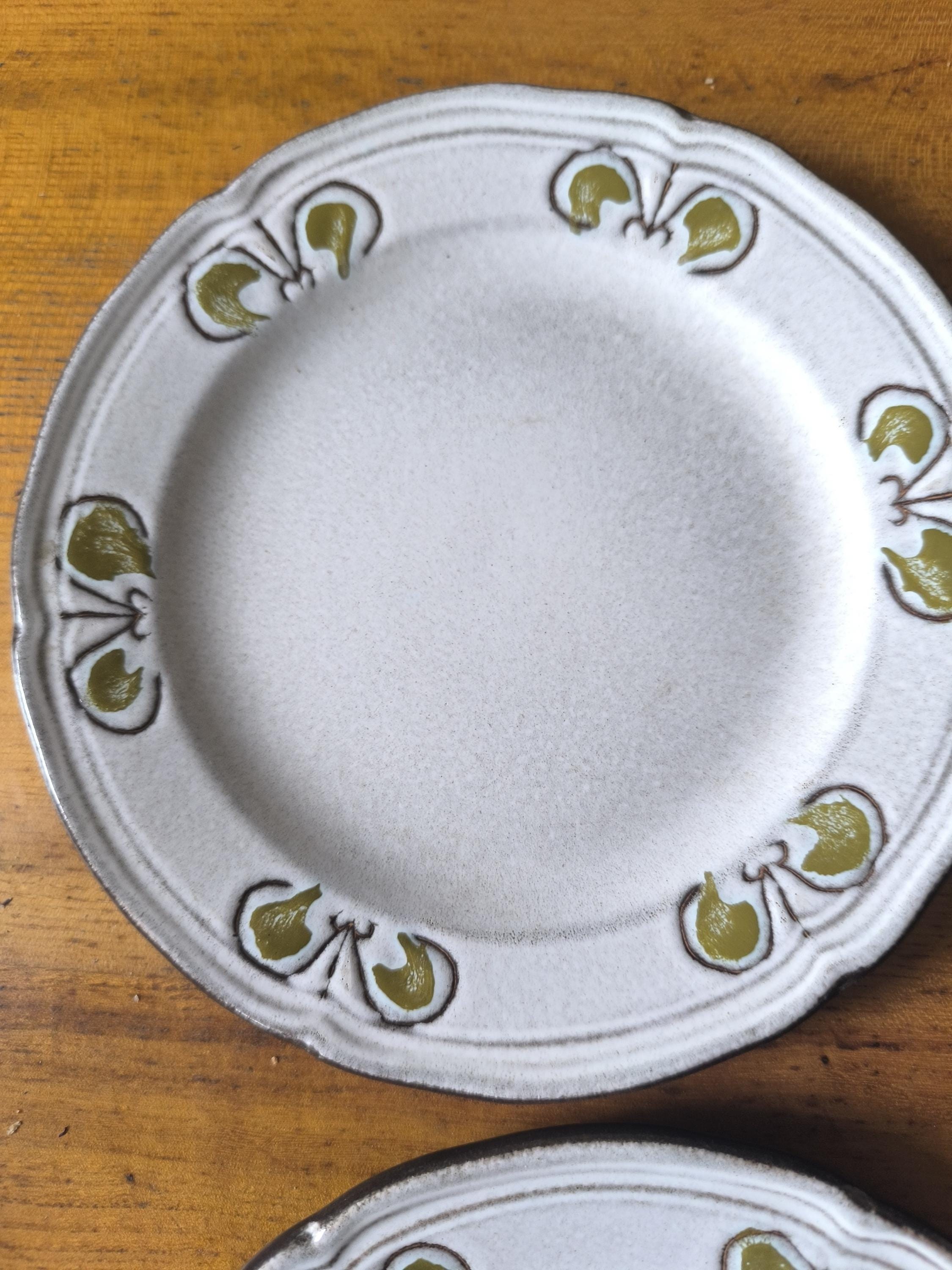 diamètre d'environ 19 cm, une taille parfaite pour les desserts individuels. Le dos de chaque assiette est marqué du sceau de la manufacture, indiquant "Niderviller France", "Lys" attestant de leur authenticité. Ce lot est en excellent état vintage, juste une assiette avec un petit saut d'émail sur la bordure