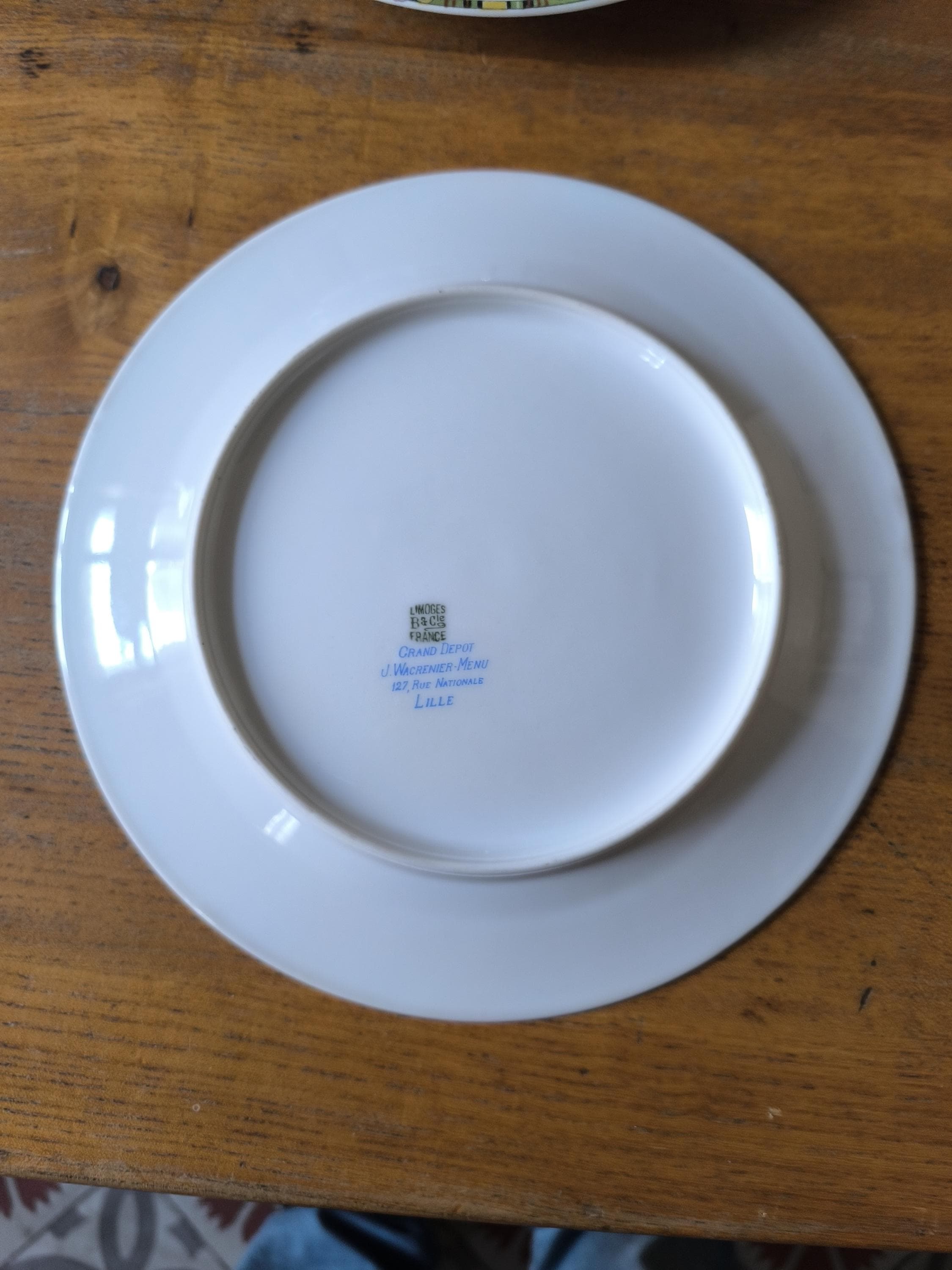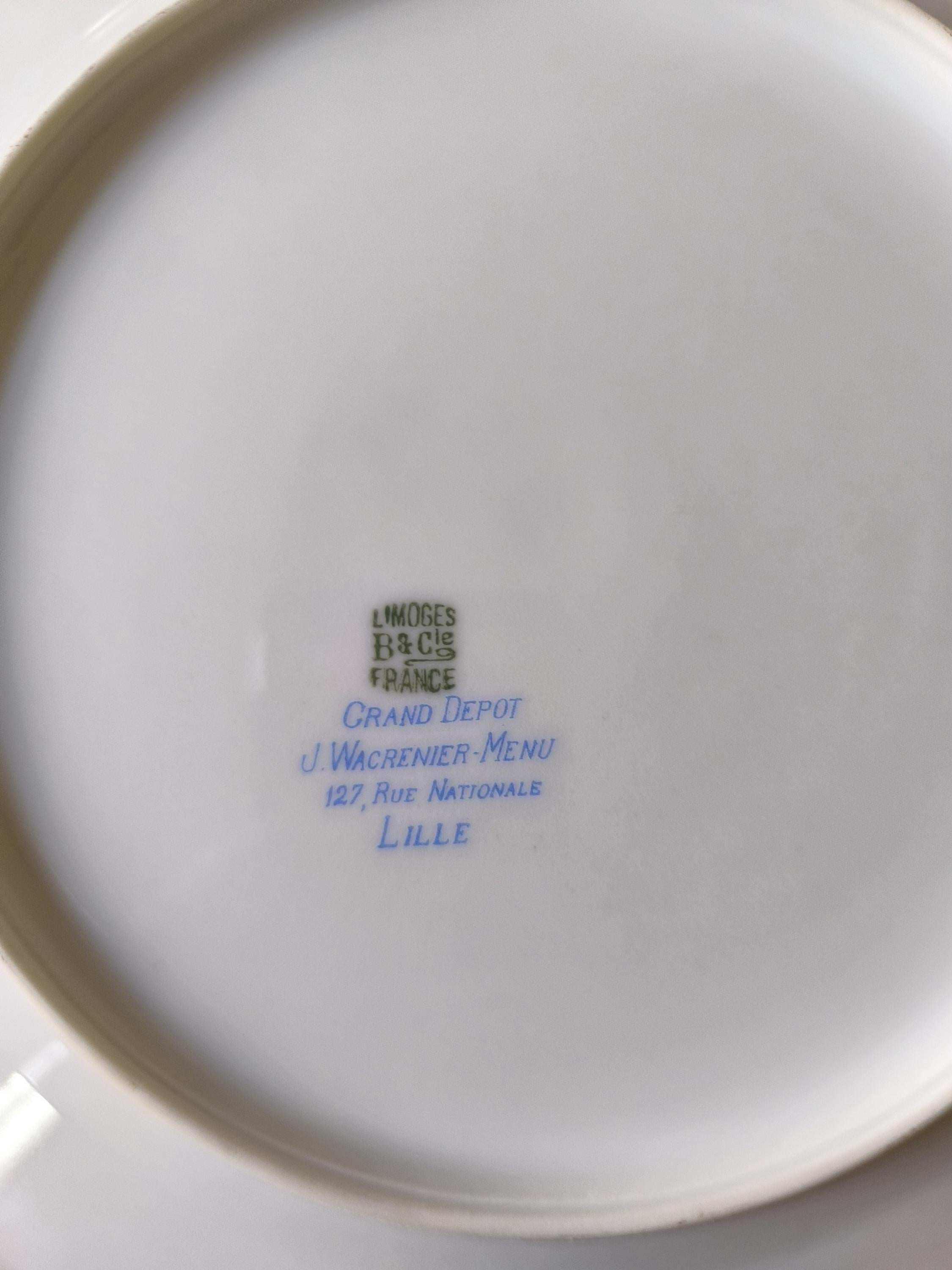 The plates also bear the inscription "GRAND DEPOT, J. WACRENIER-MENU, 127, RUE NATIONALE, LILLE," indicating their commercial origin and original place of sale. These pieces are ideal for antique porcelain collectors, vintage decor enthusiasts, or anyone seeking a unique and characterful serving set. Their size makes them perfect for presenting hors d'oeuvres or desserts.