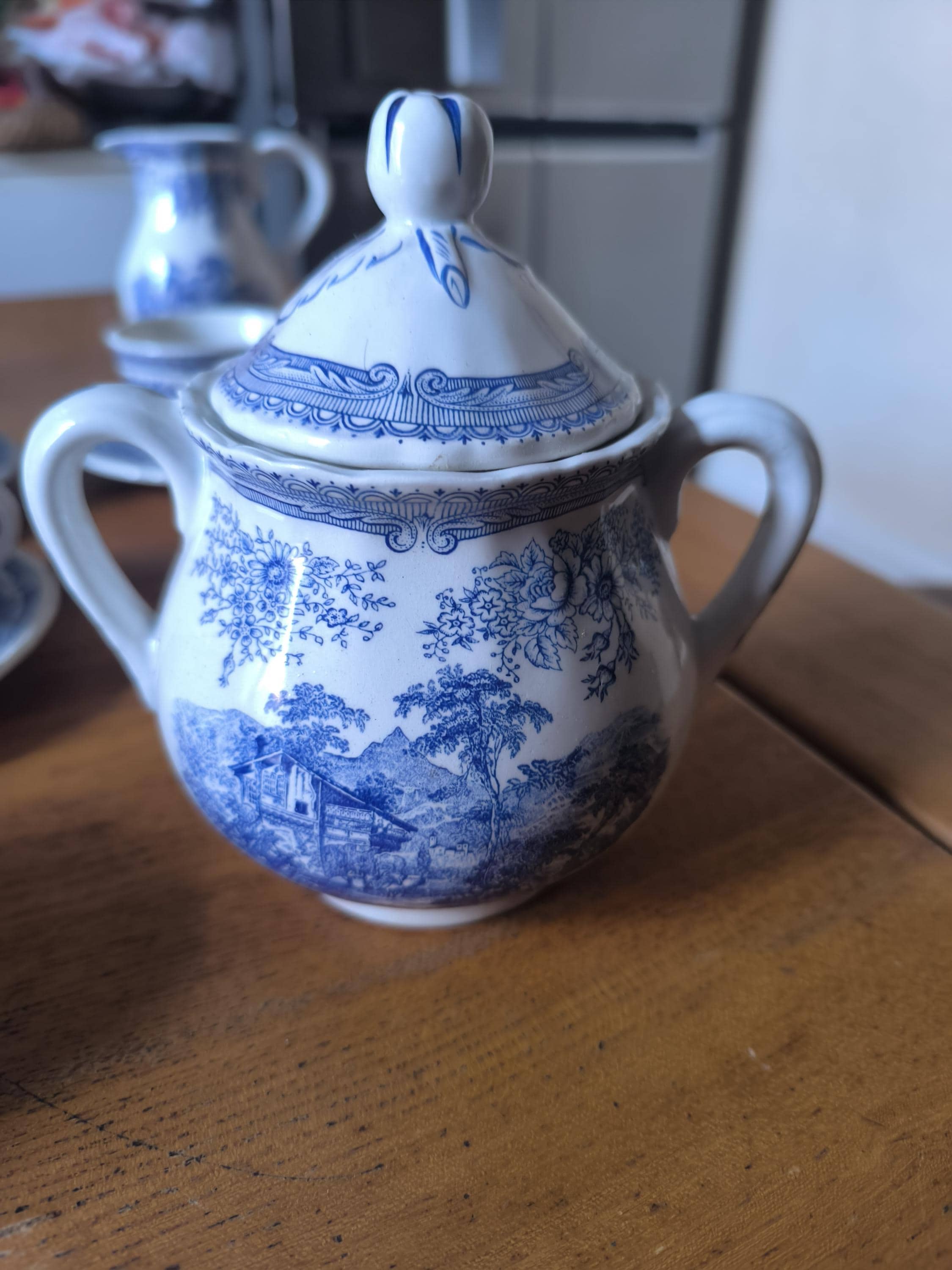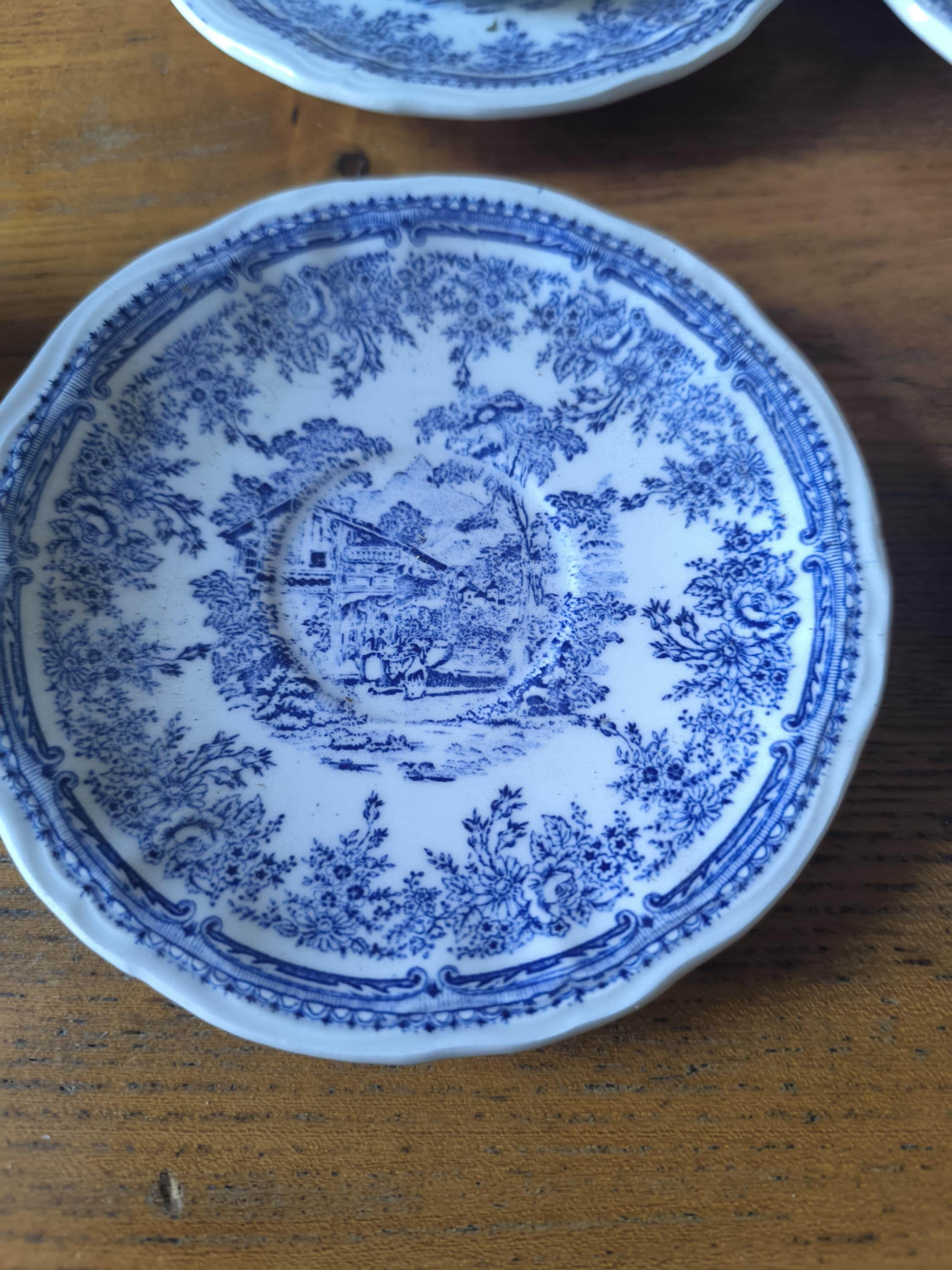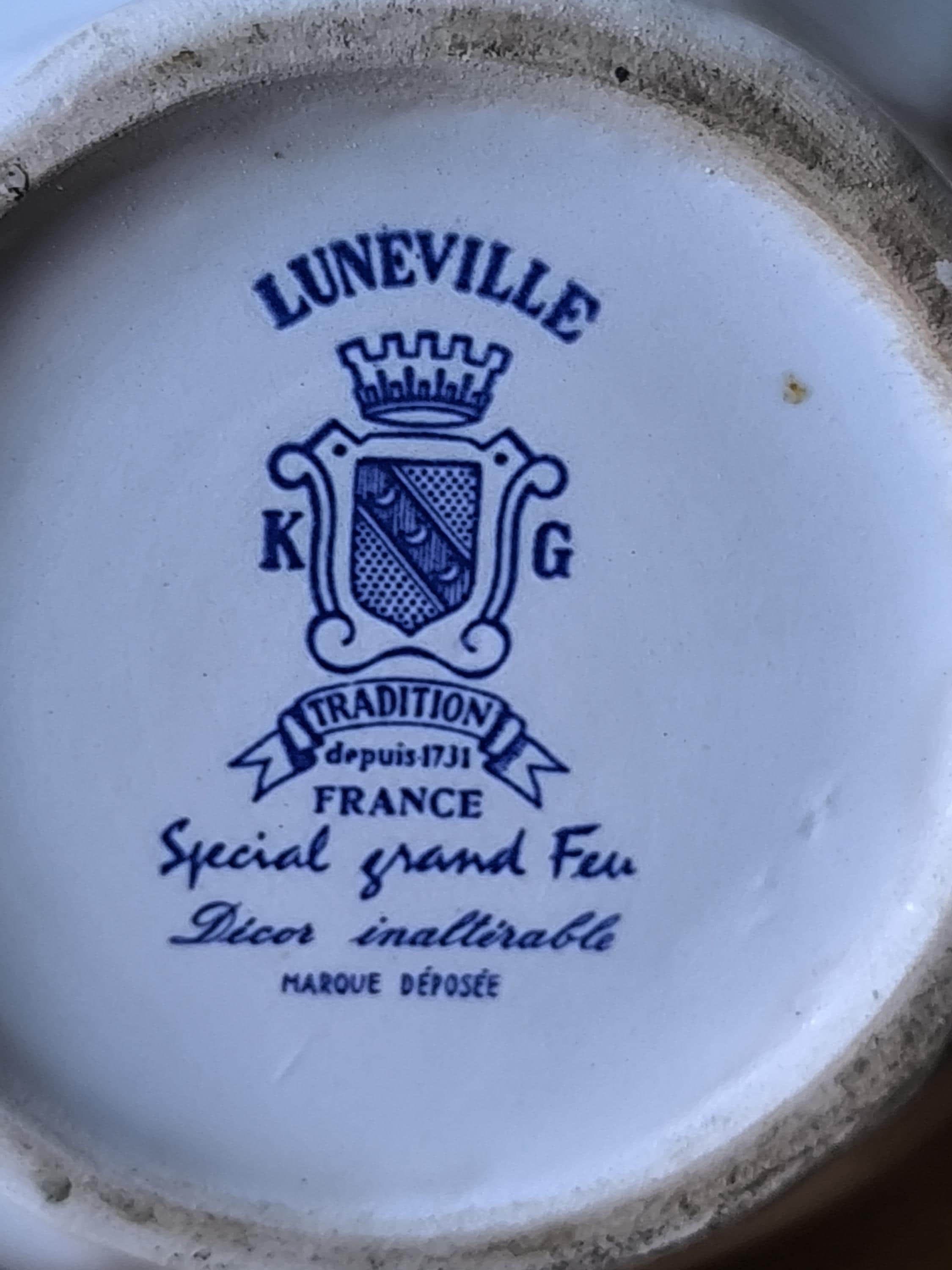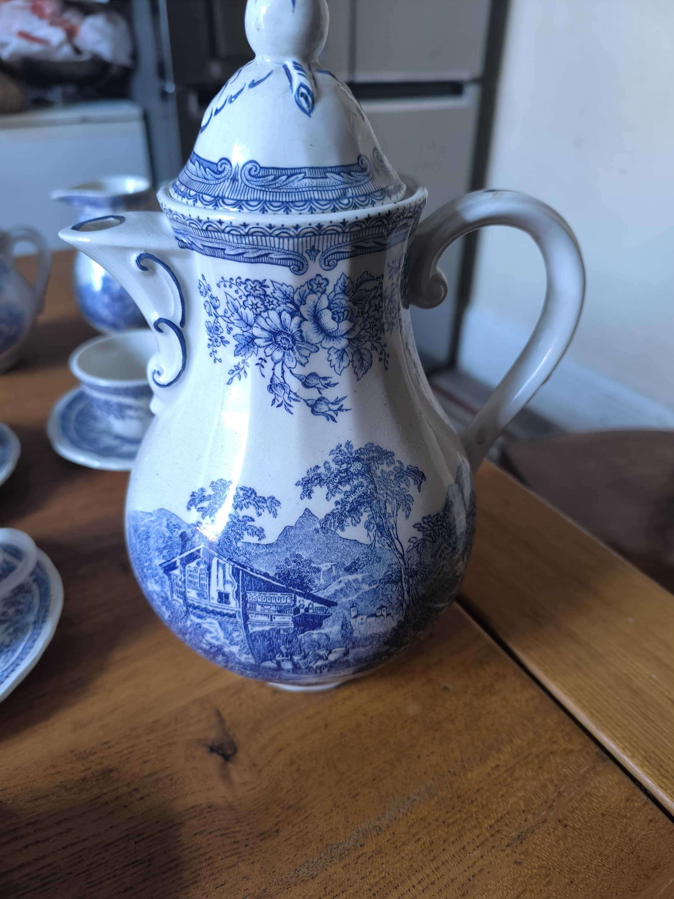 Discover this magnificent Lunéville earthenware coffee service by Keller & Guérin, "English" pattern, an exceptional piece that will bring a touch of timeless elegance to your gatherings. Inspired by the Louis XV style, this service is distinguished by its delicate blue and white motifs, evoking refined pastoral and floral scenes.