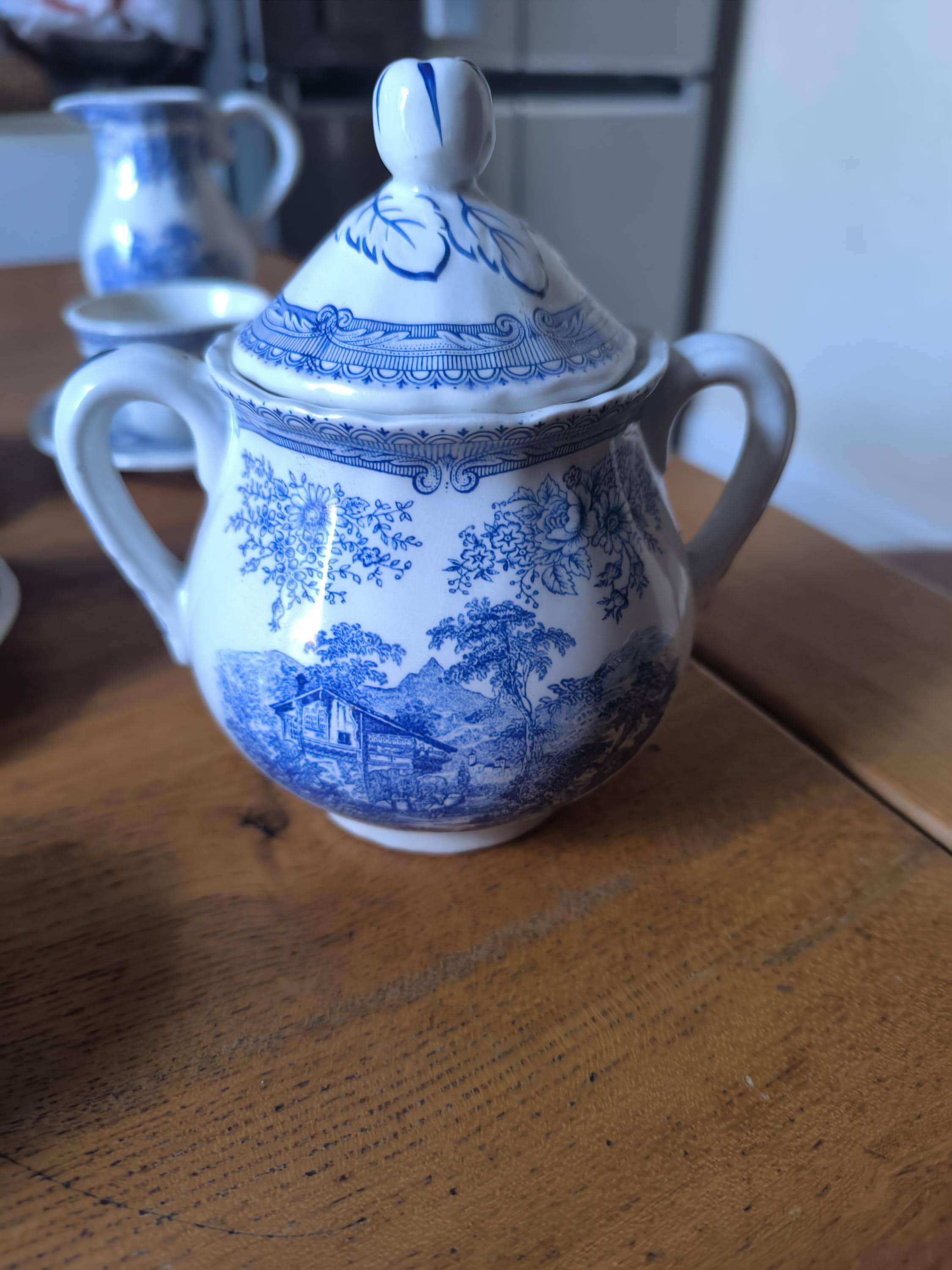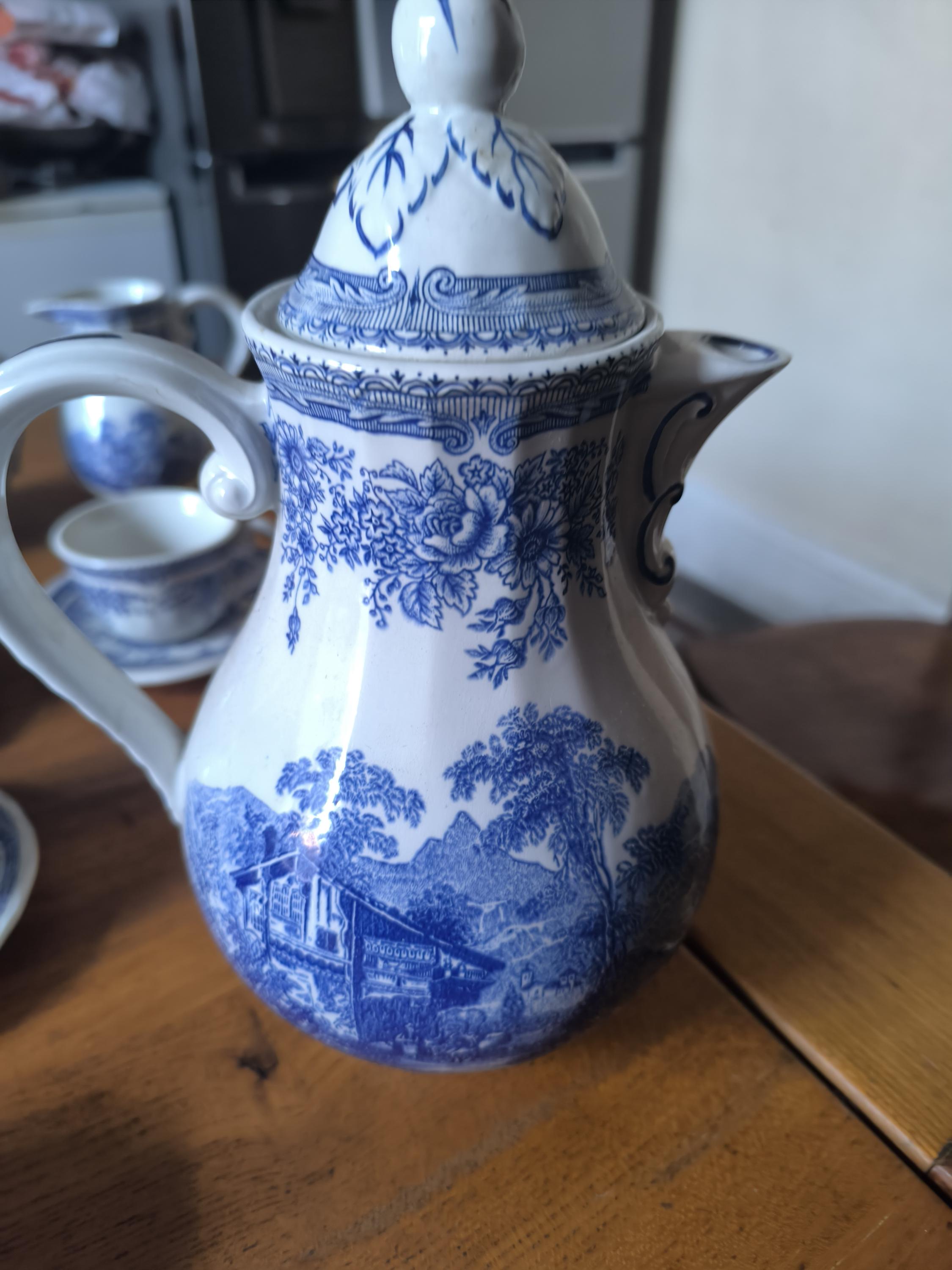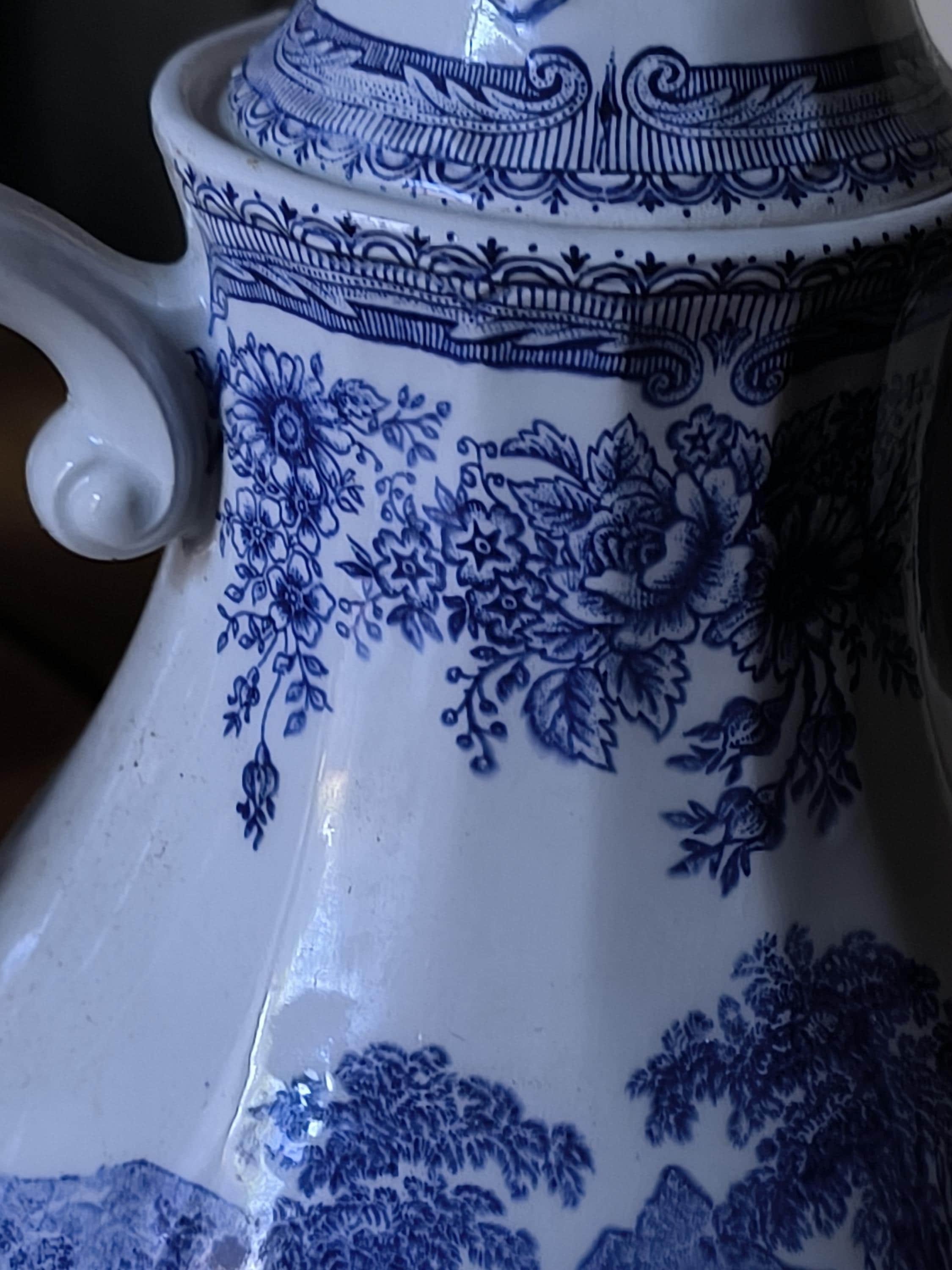 Discover this magnificent Lunéville earthenware coffee service by Keller & Guérin, "English" pattern, an exceptional piece that will bring a touch of timeless elegance to your gatherings. Inspired by the Louis XV style, this service is distinguished by its delicate blue and white motifs, evoking refined pastoral and floral scenes.
