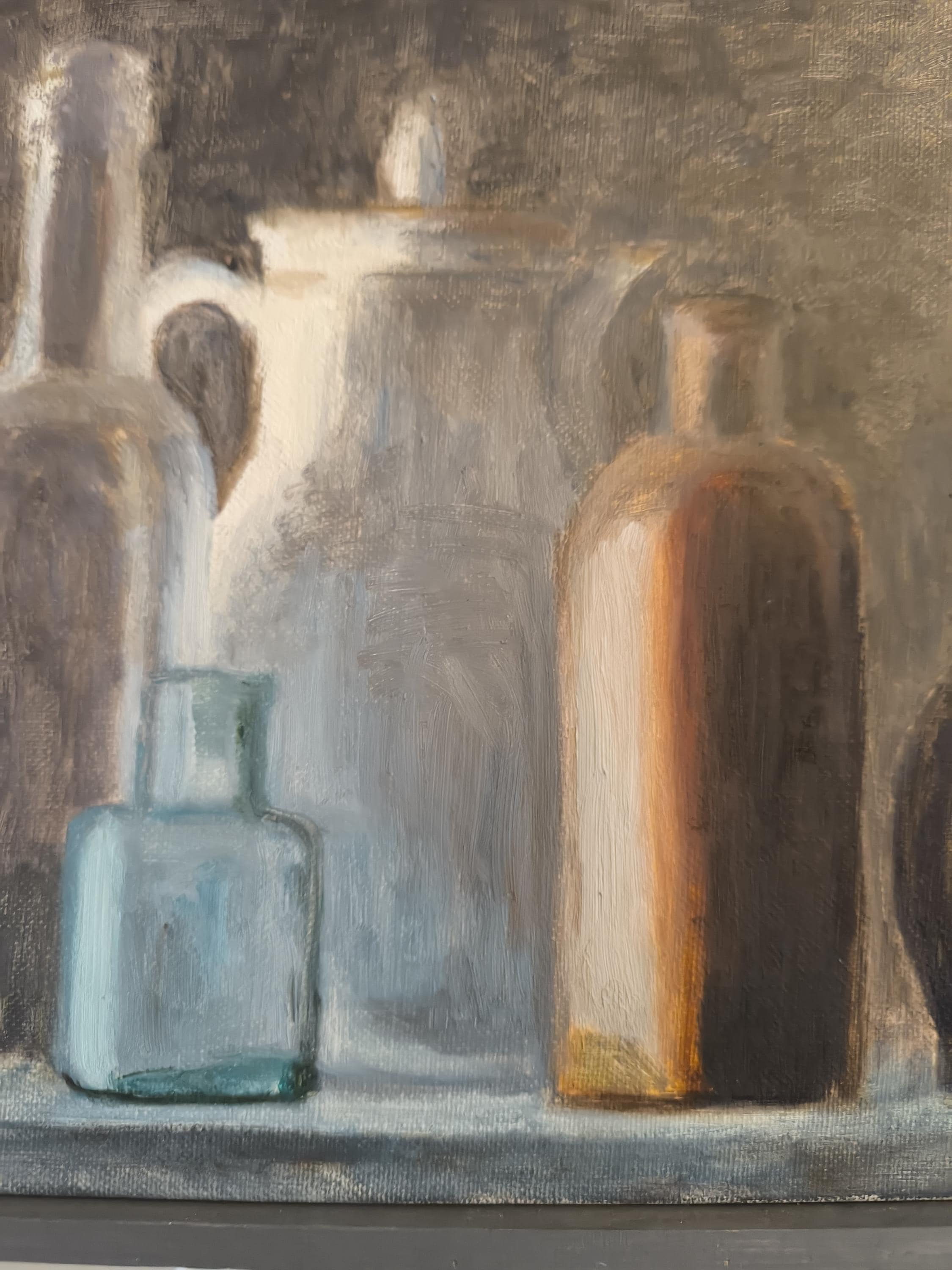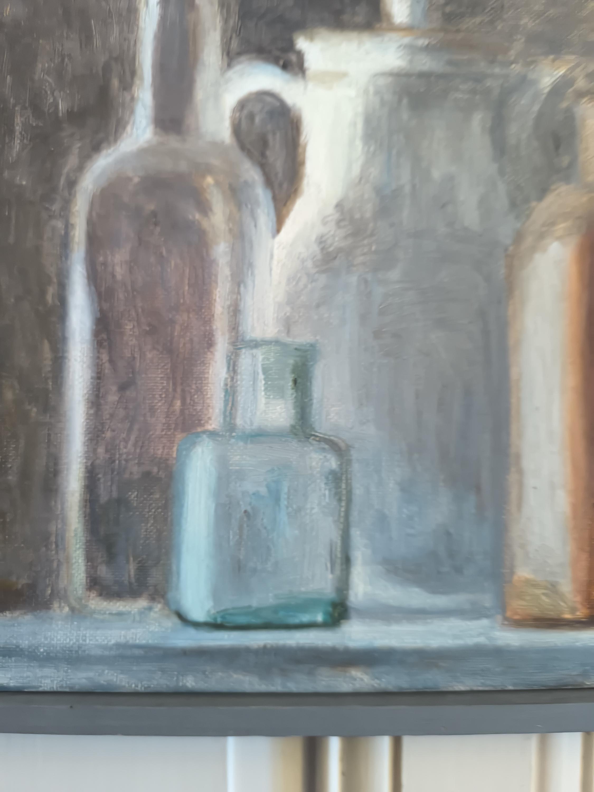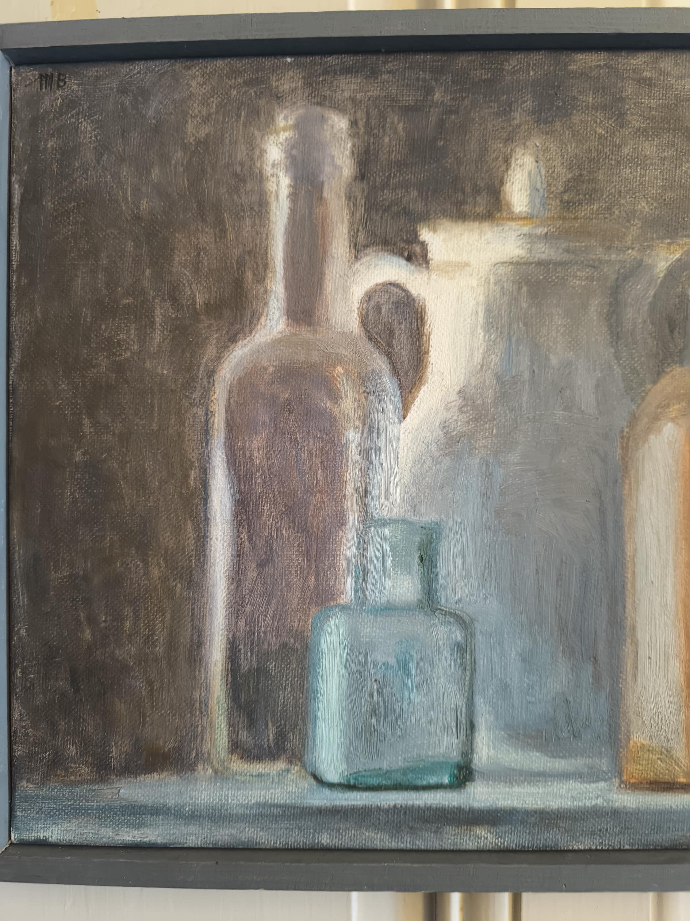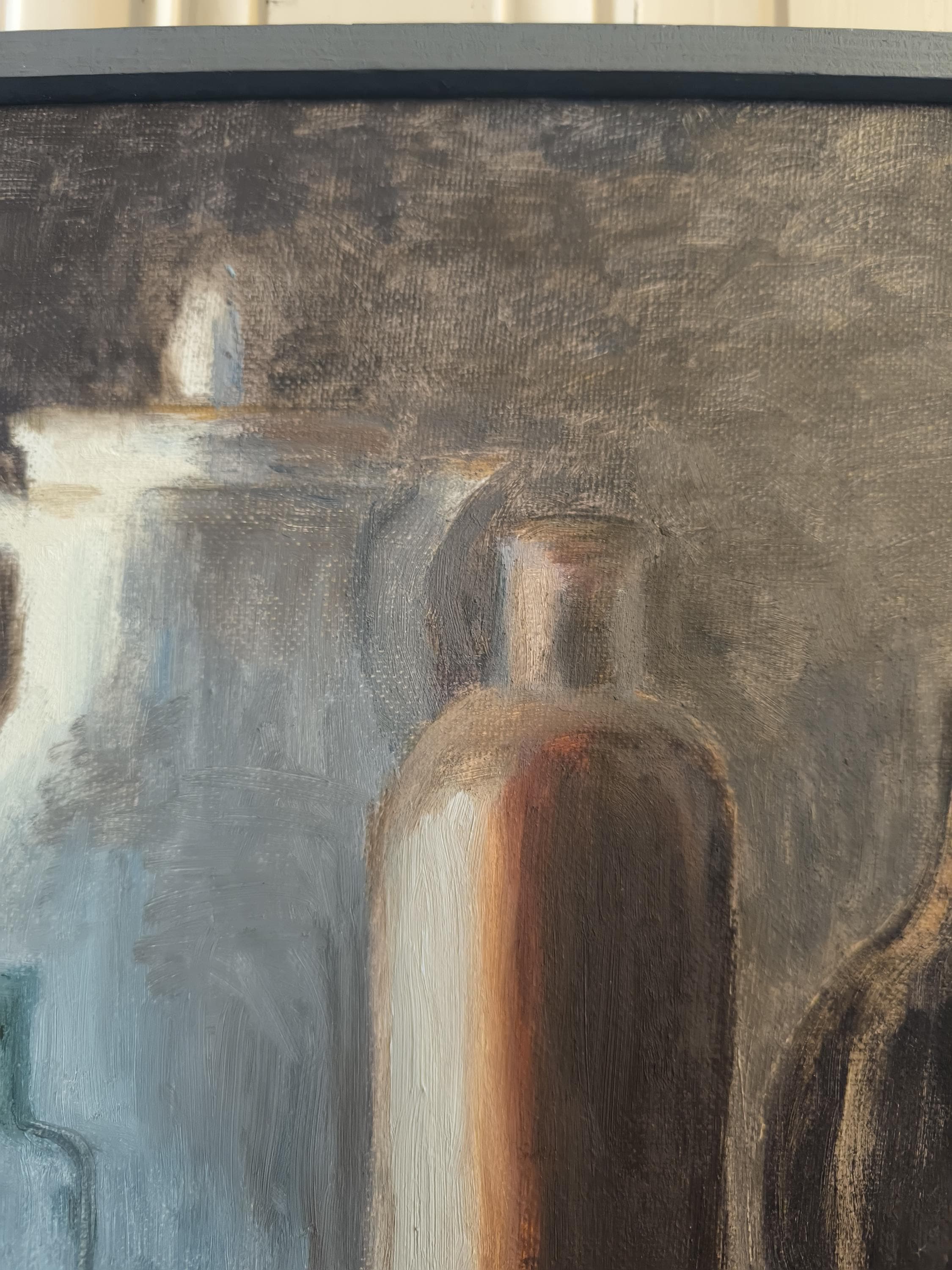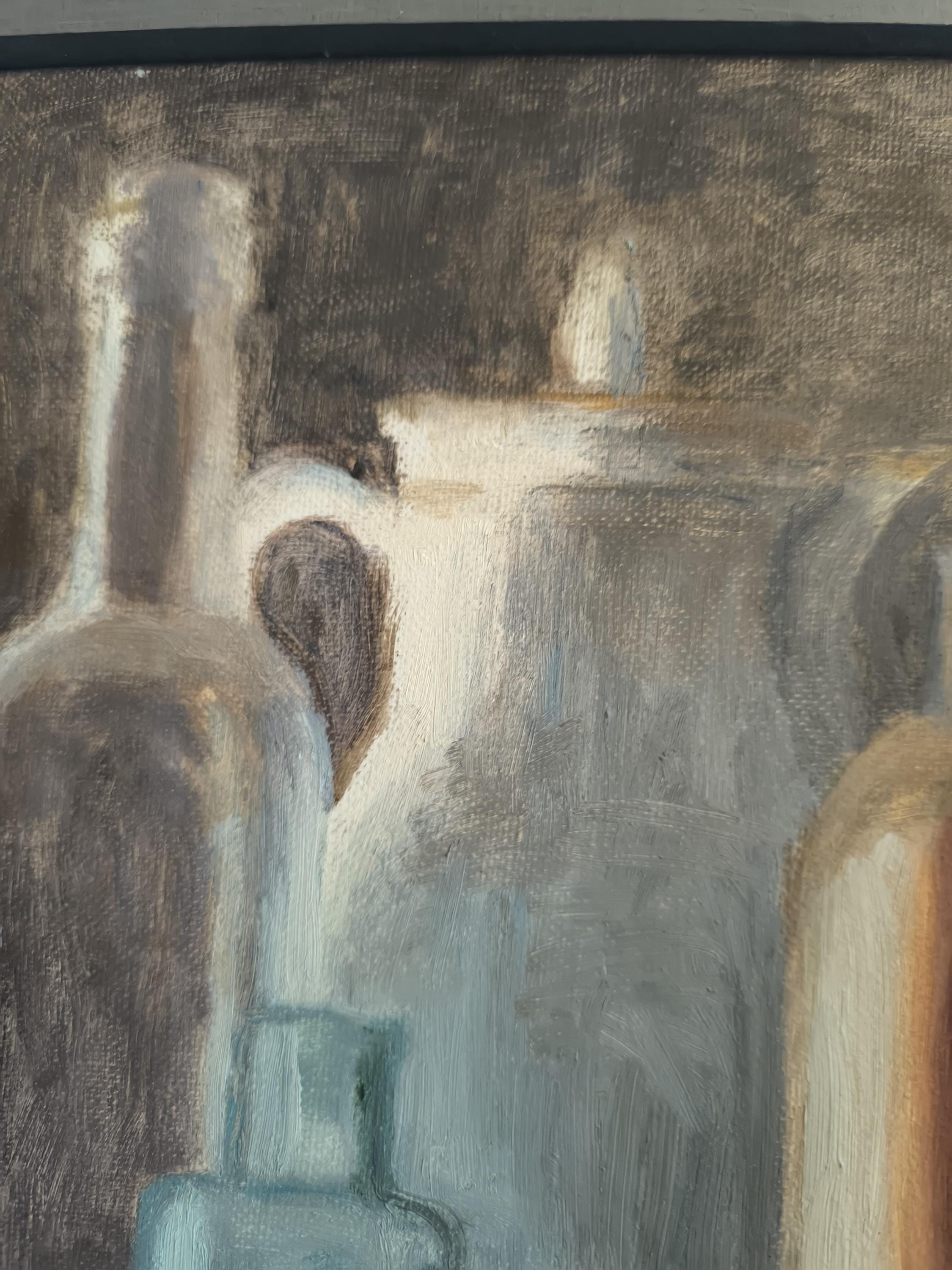 This oil on canvas, titled "Still Life with Coffee Pot" by Mireille Besson, presents a simple yet evocative composition of five containers arranged on a flat surface. The whole exudes an atmosphere of tranquility and familiarity, typical of classical still lifes, but with a touch of modernity brought by the artist's style.