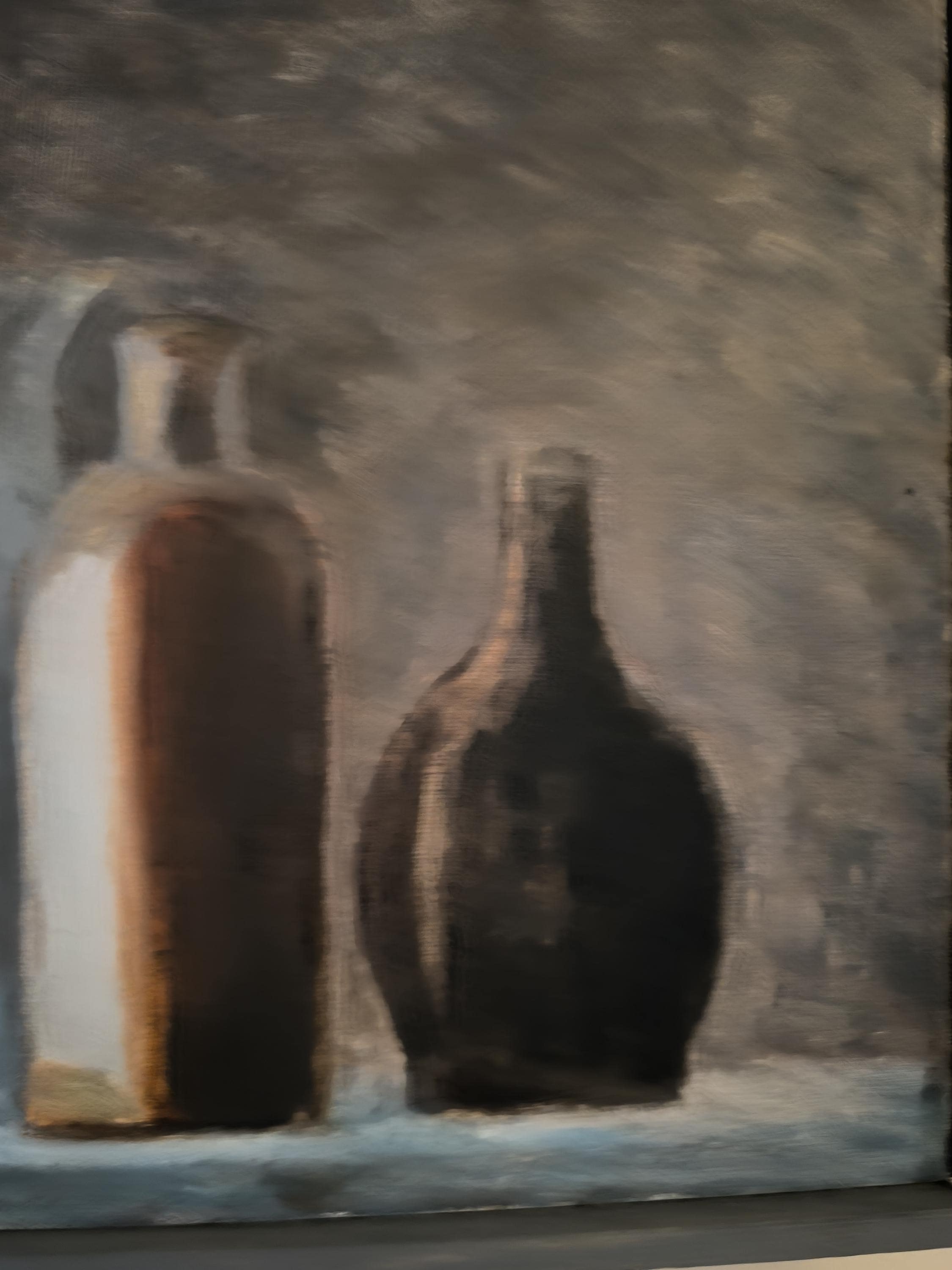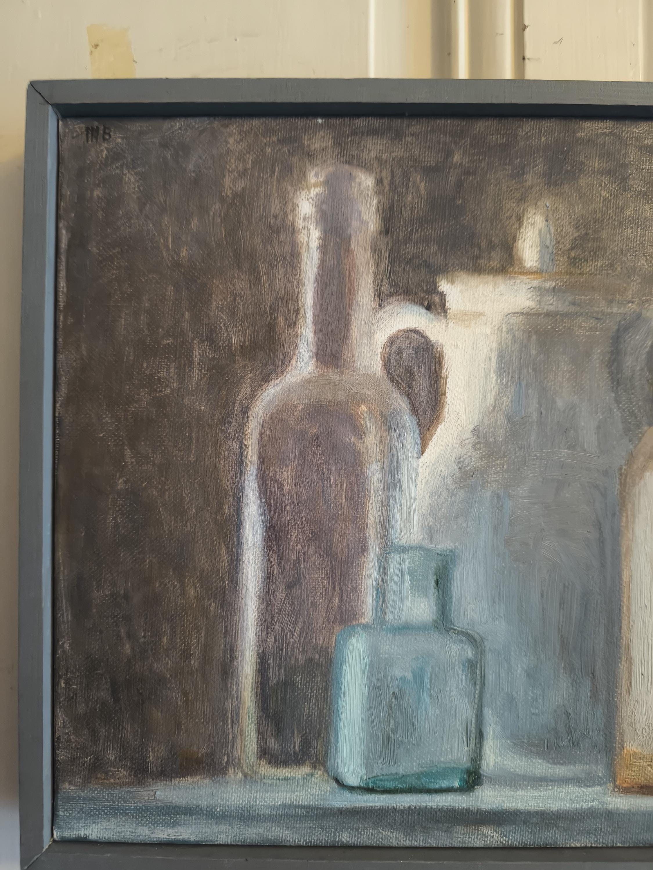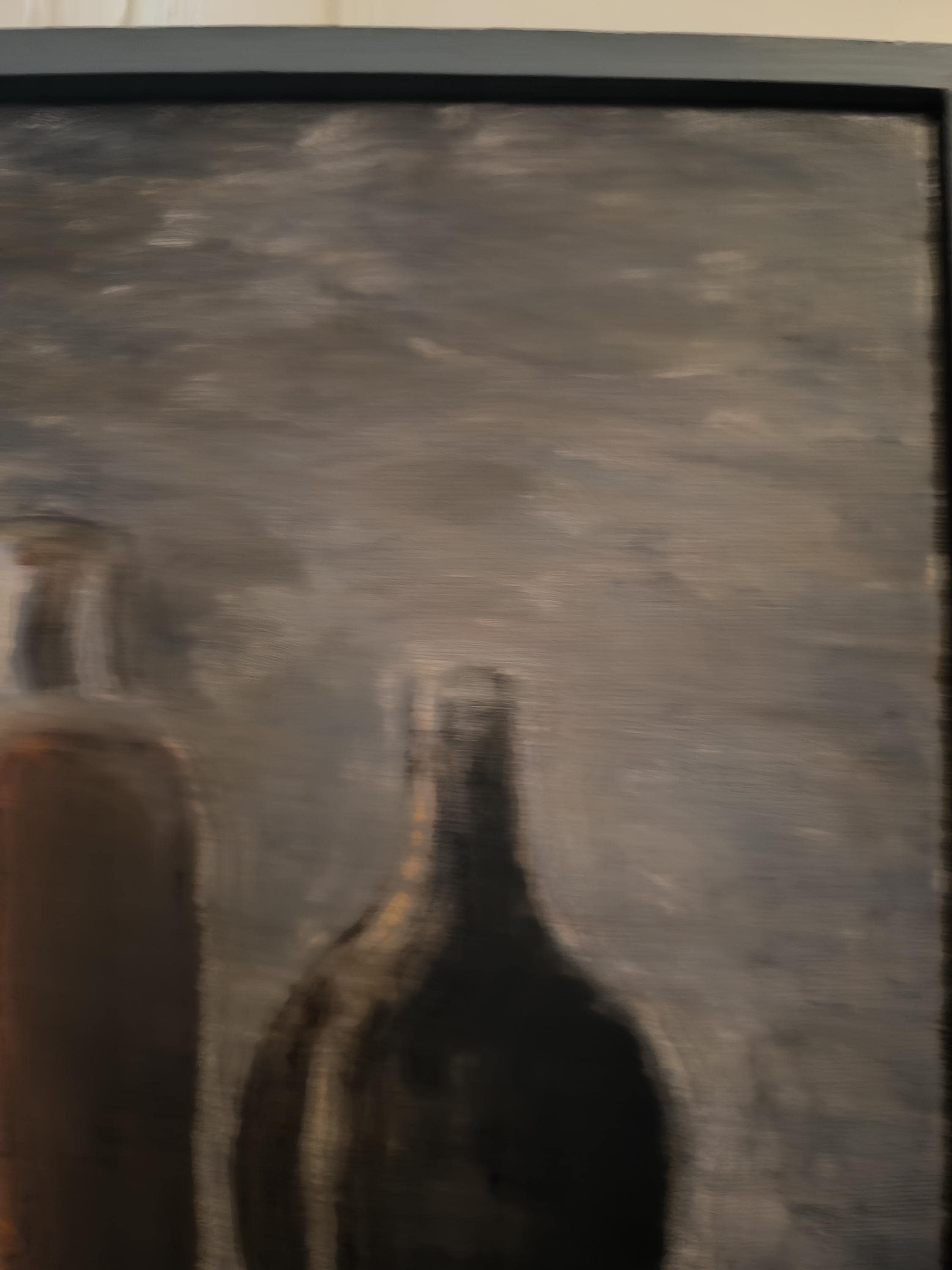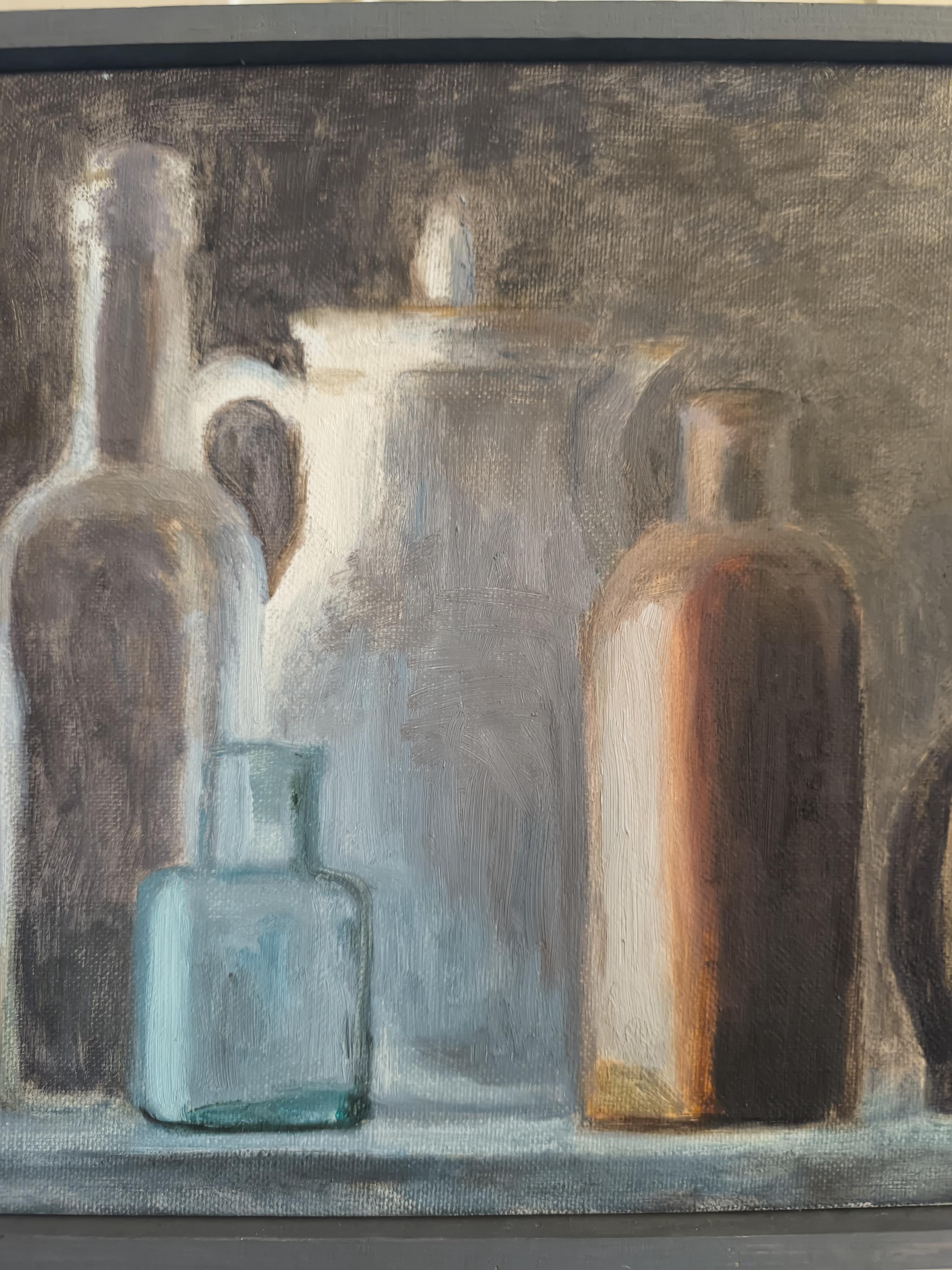 This oil on canvas, titled "Still Life with Coffee Pot" by Mireille Besson, presents a simple yet evocative composition of five containers arranged on a flat surface. The whole exudes an atmosphere of tranquility and familiarity, typical of classical still lifes, but with a touch of modernity brought by the artist's style.