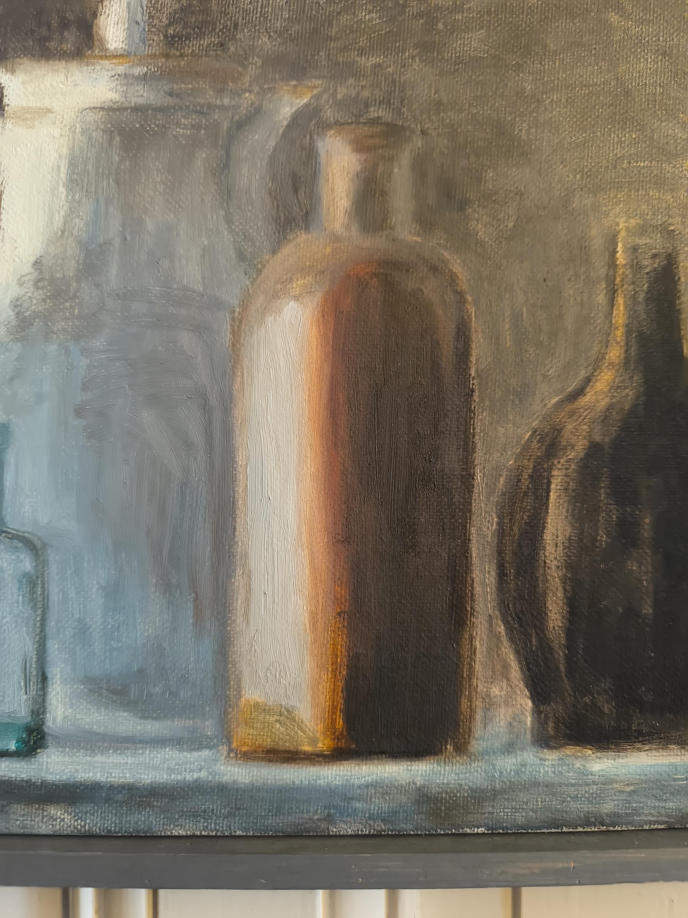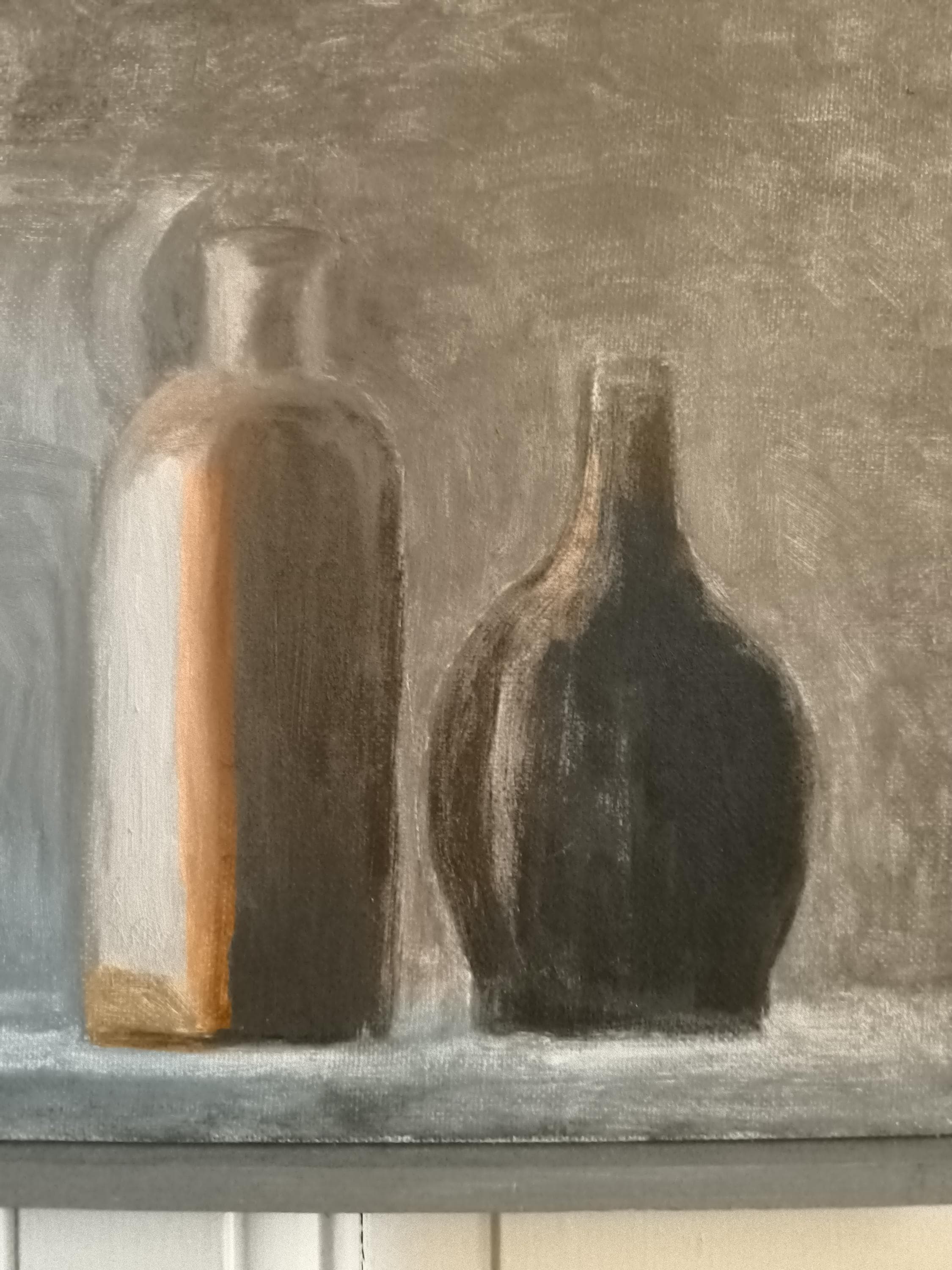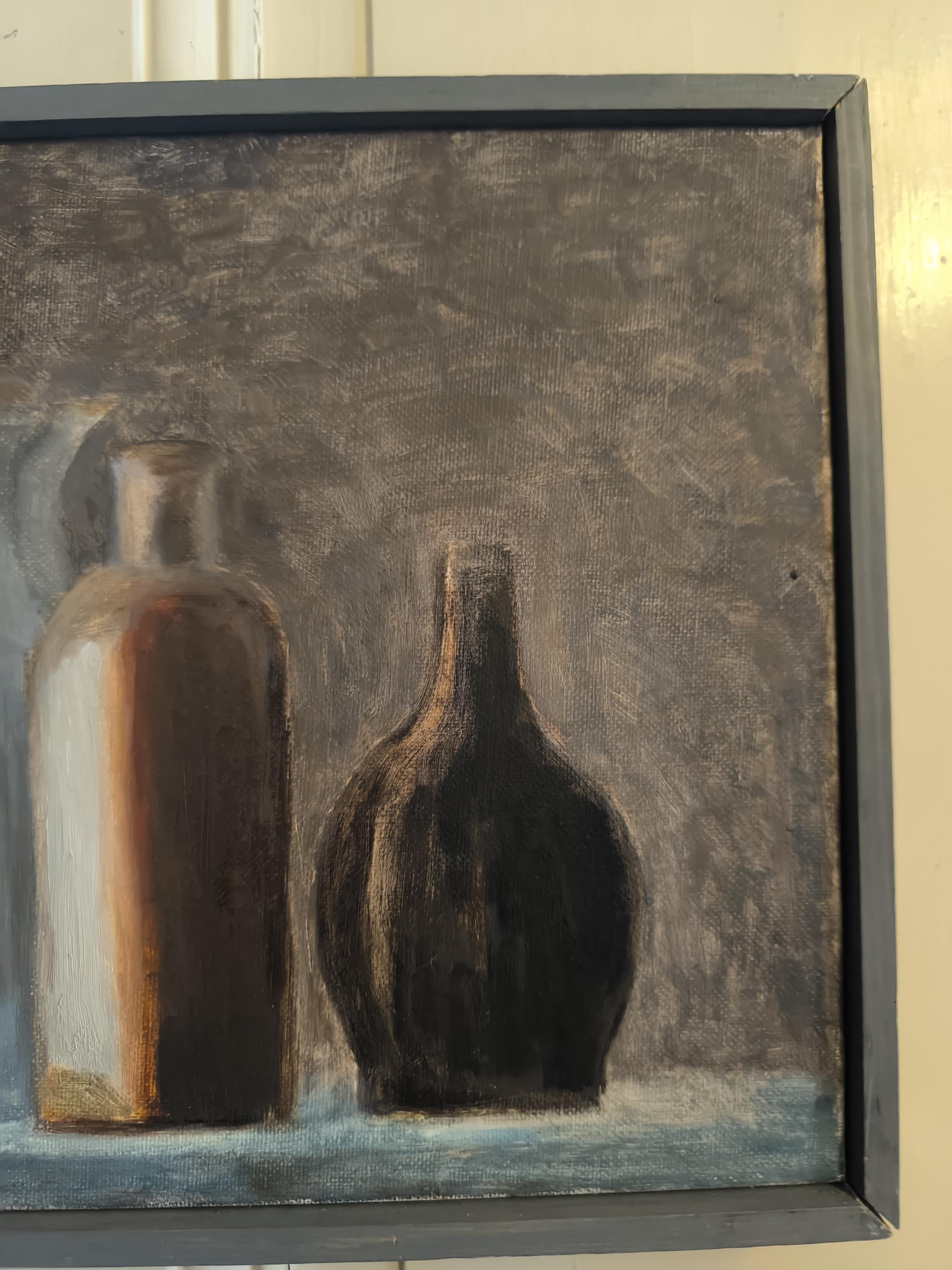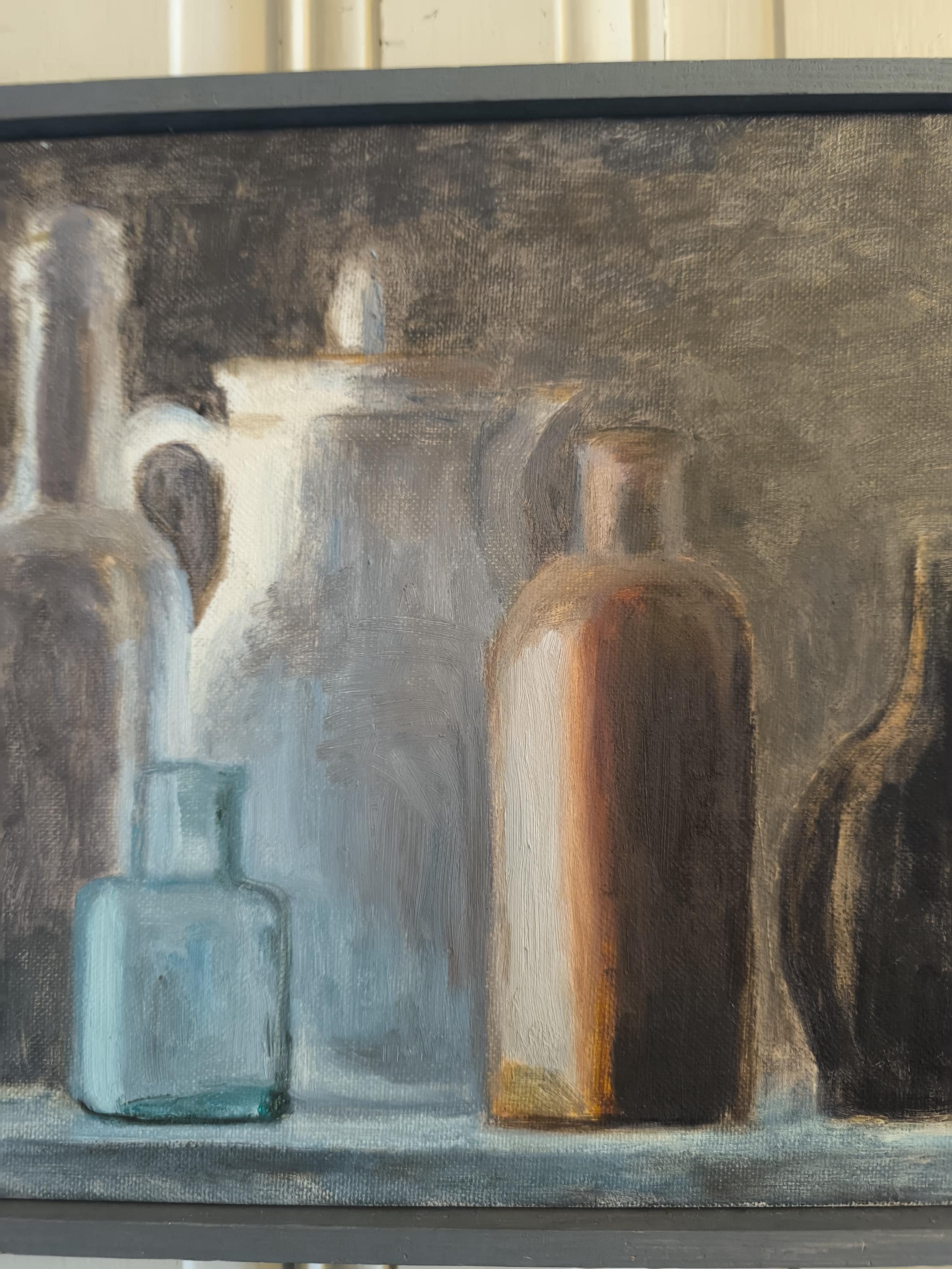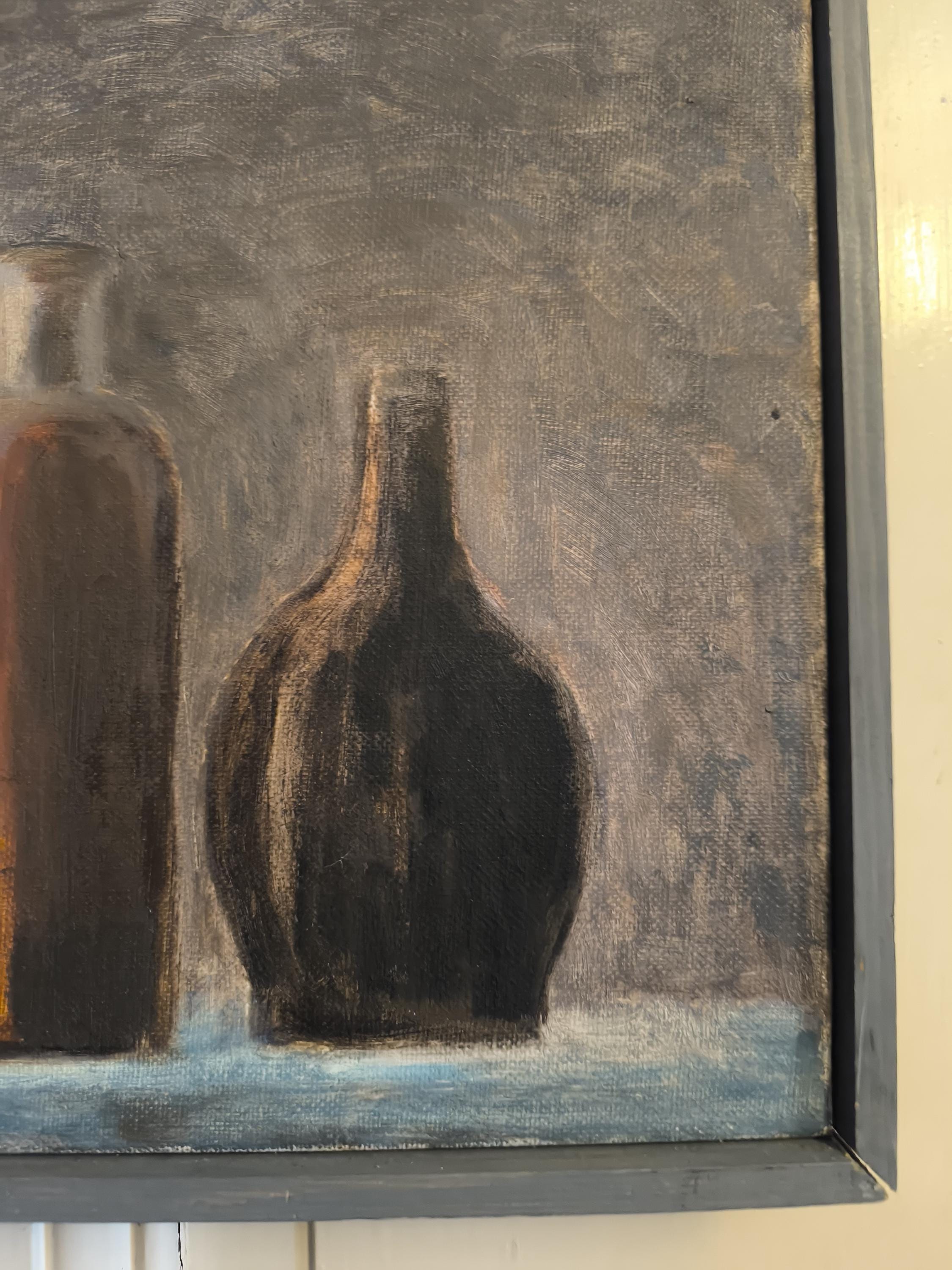 This oil on canvas, titled "Still Life with Coffee Pot" by Mireille Besson, presents a simple yet evocative composition of five containers arranged on a flat surface. The whole exudes an atmosphere of tranquility and familiarity, typical of classical still lifes, but with a touch of modernity brought by the artist's style.