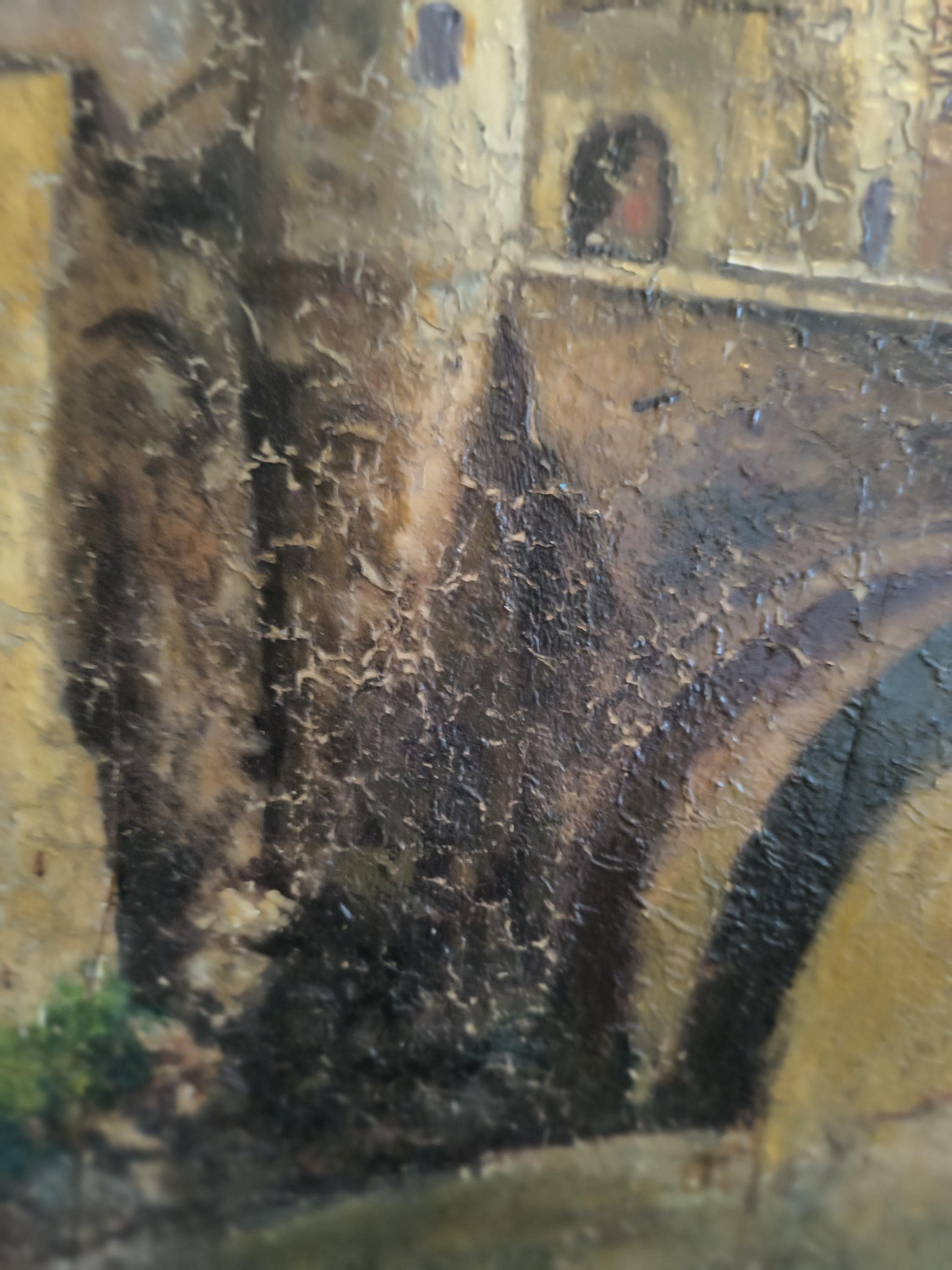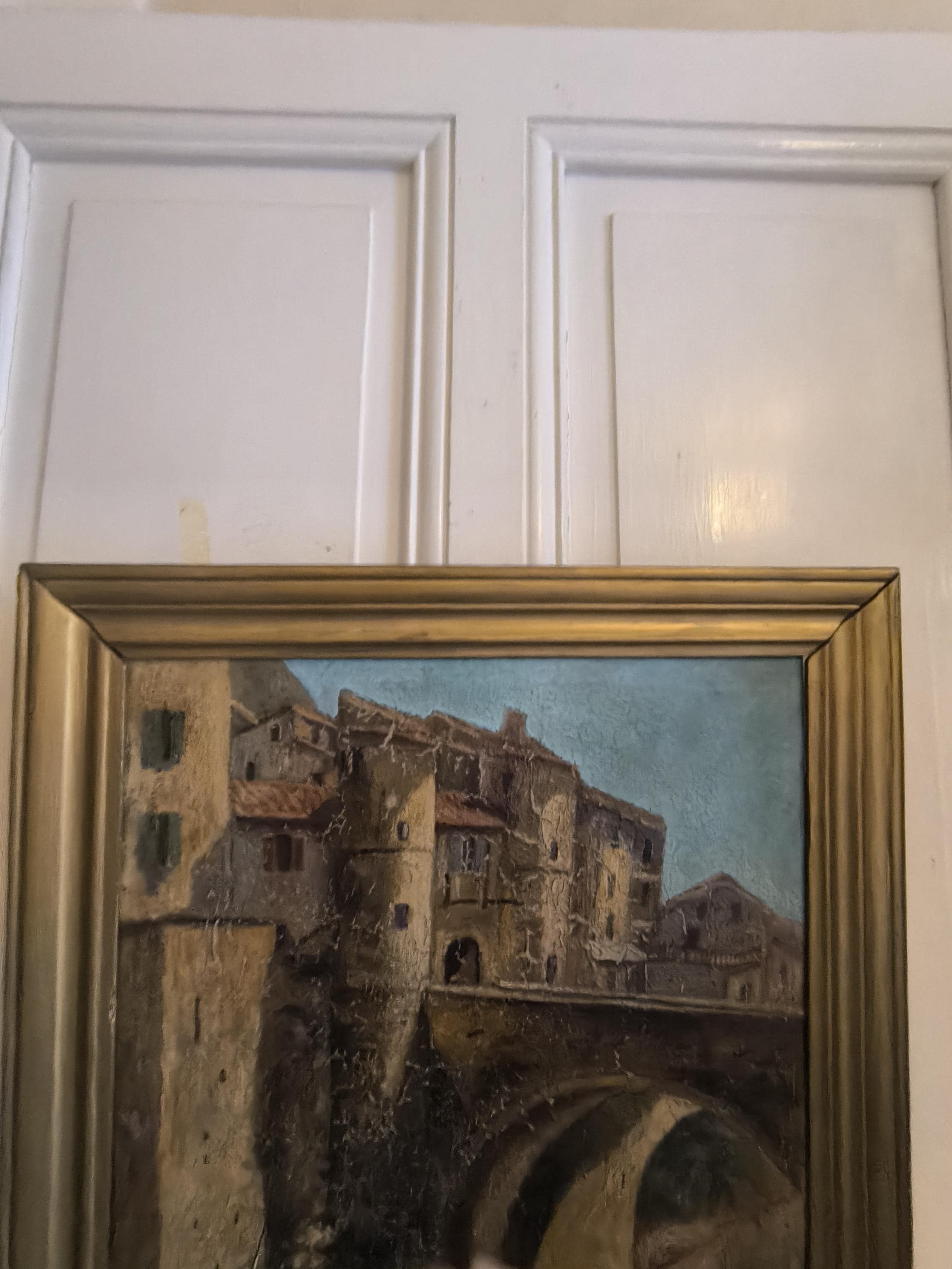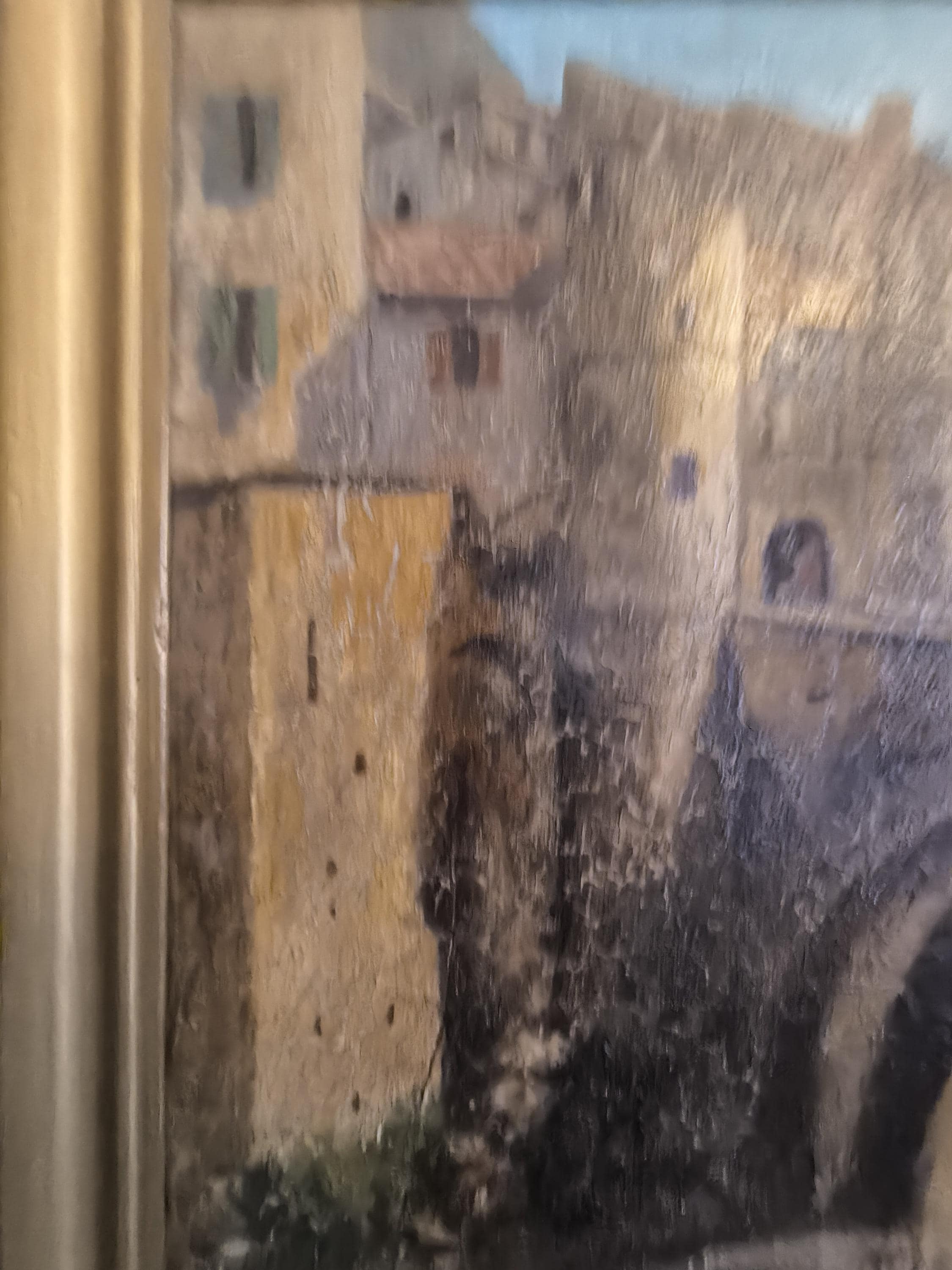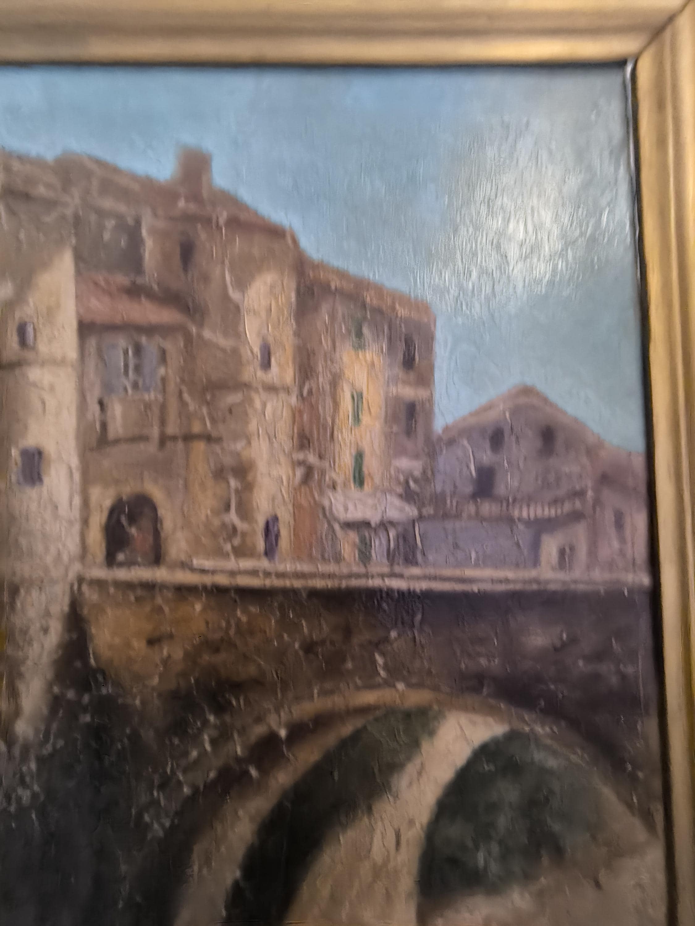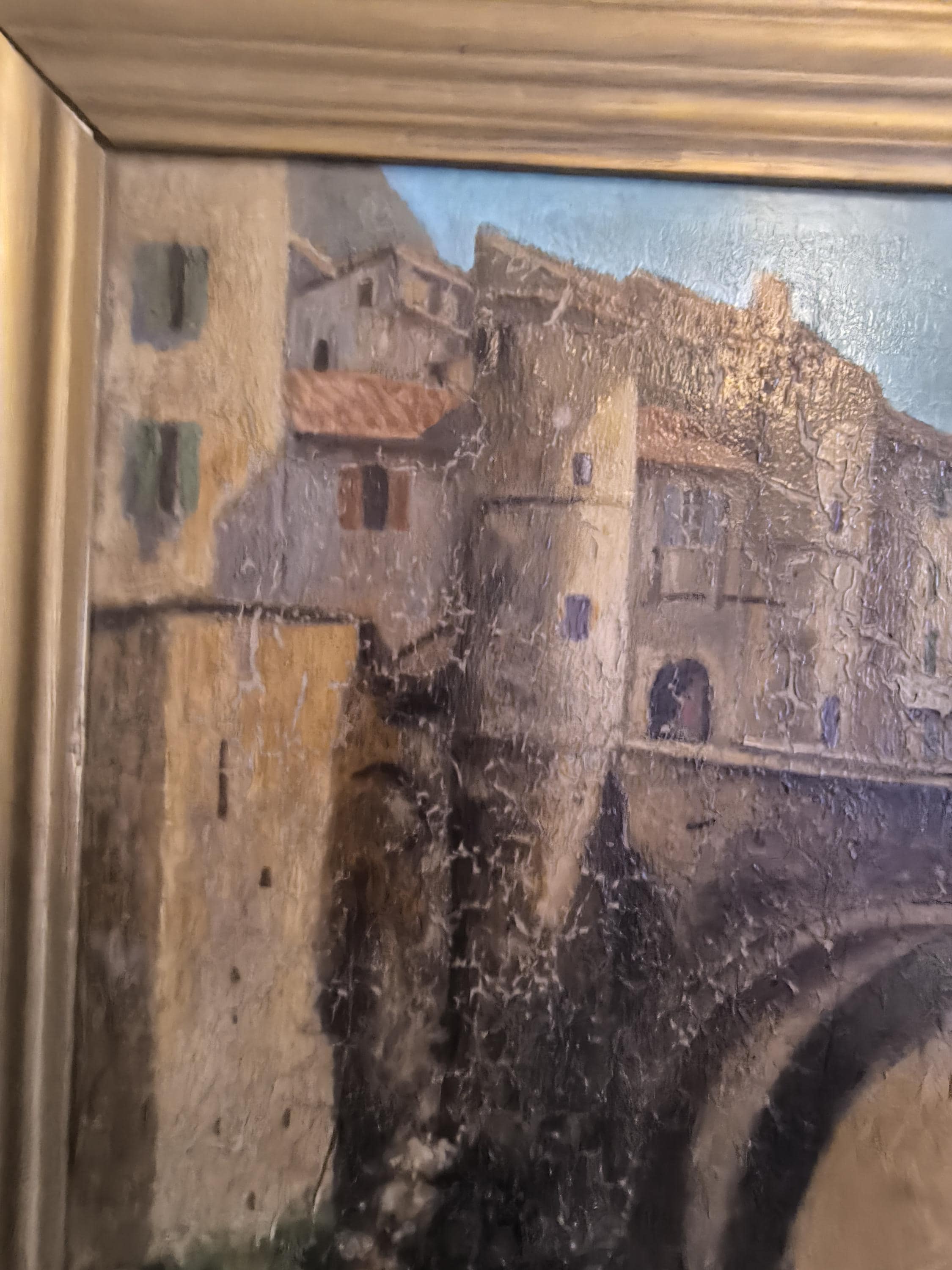 Historic bridge of Entrevaux: Oil on panel signed Senger, picturesque landscape of the south of France