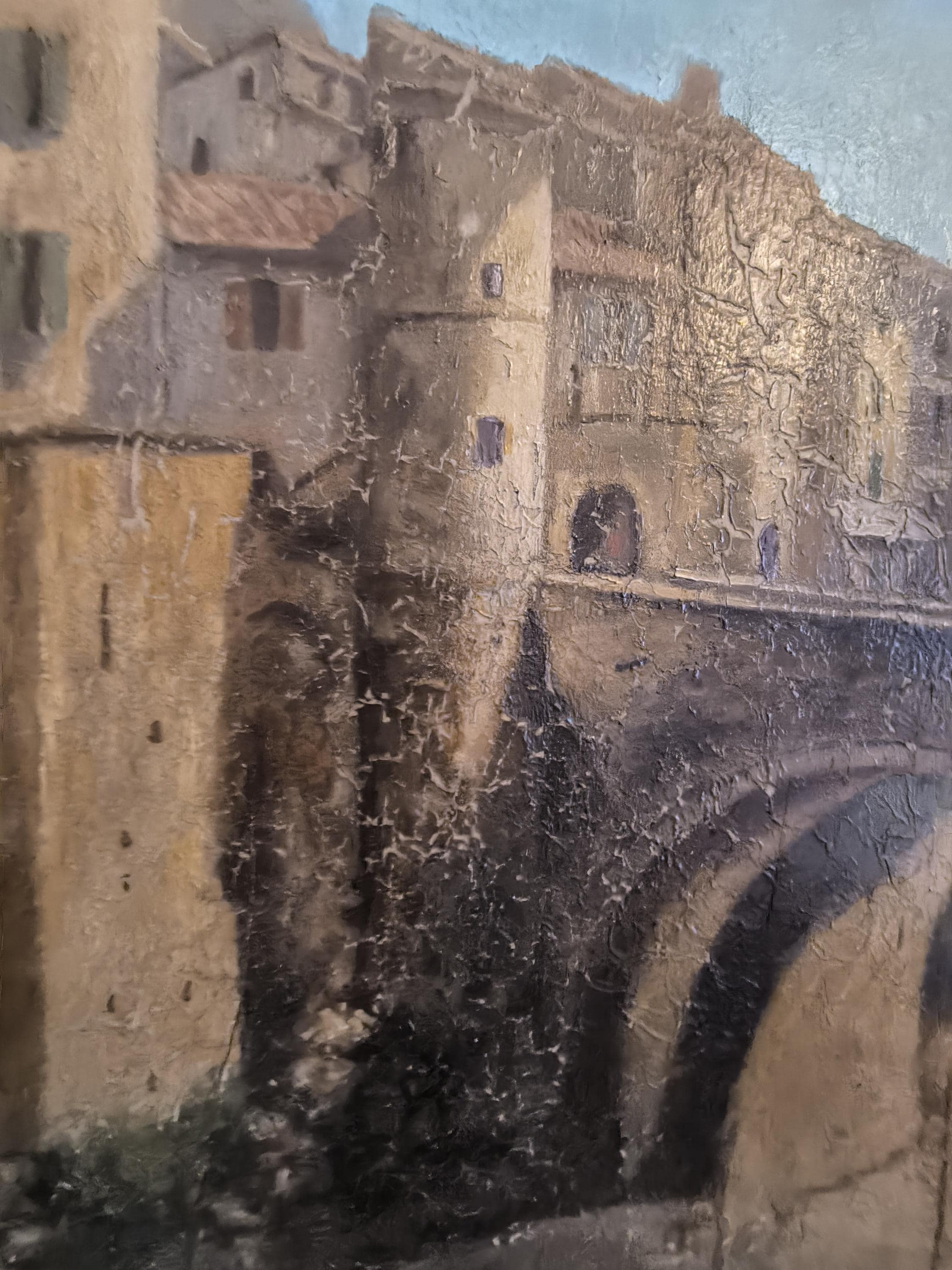 Realism: The artist strives to represent the subject (the Entrevaux Bridge and its surroundings) in a manner faithful to reality. The shapes of the buildings, the bridge, and the vegetation are recognizable and well-defined.