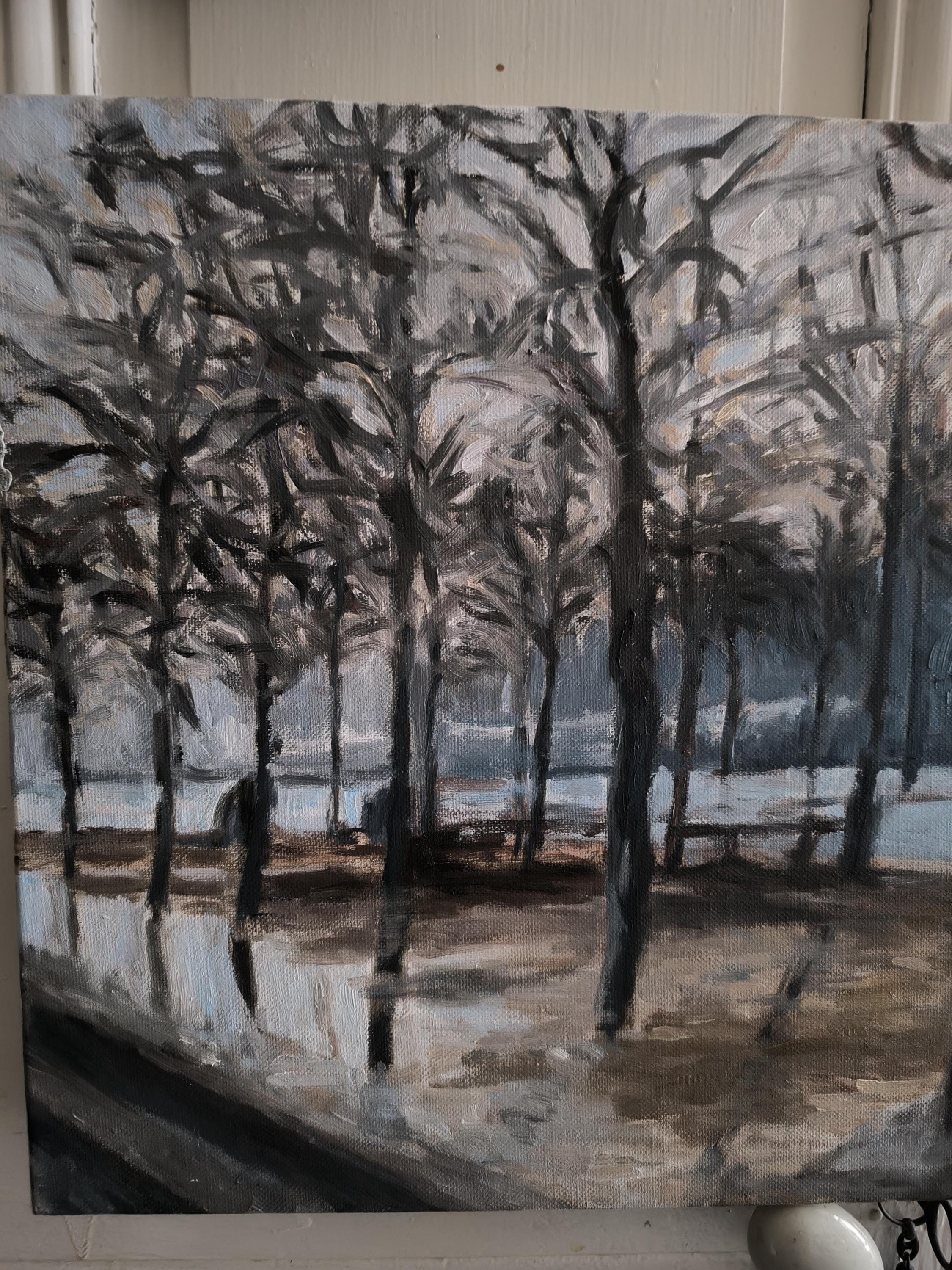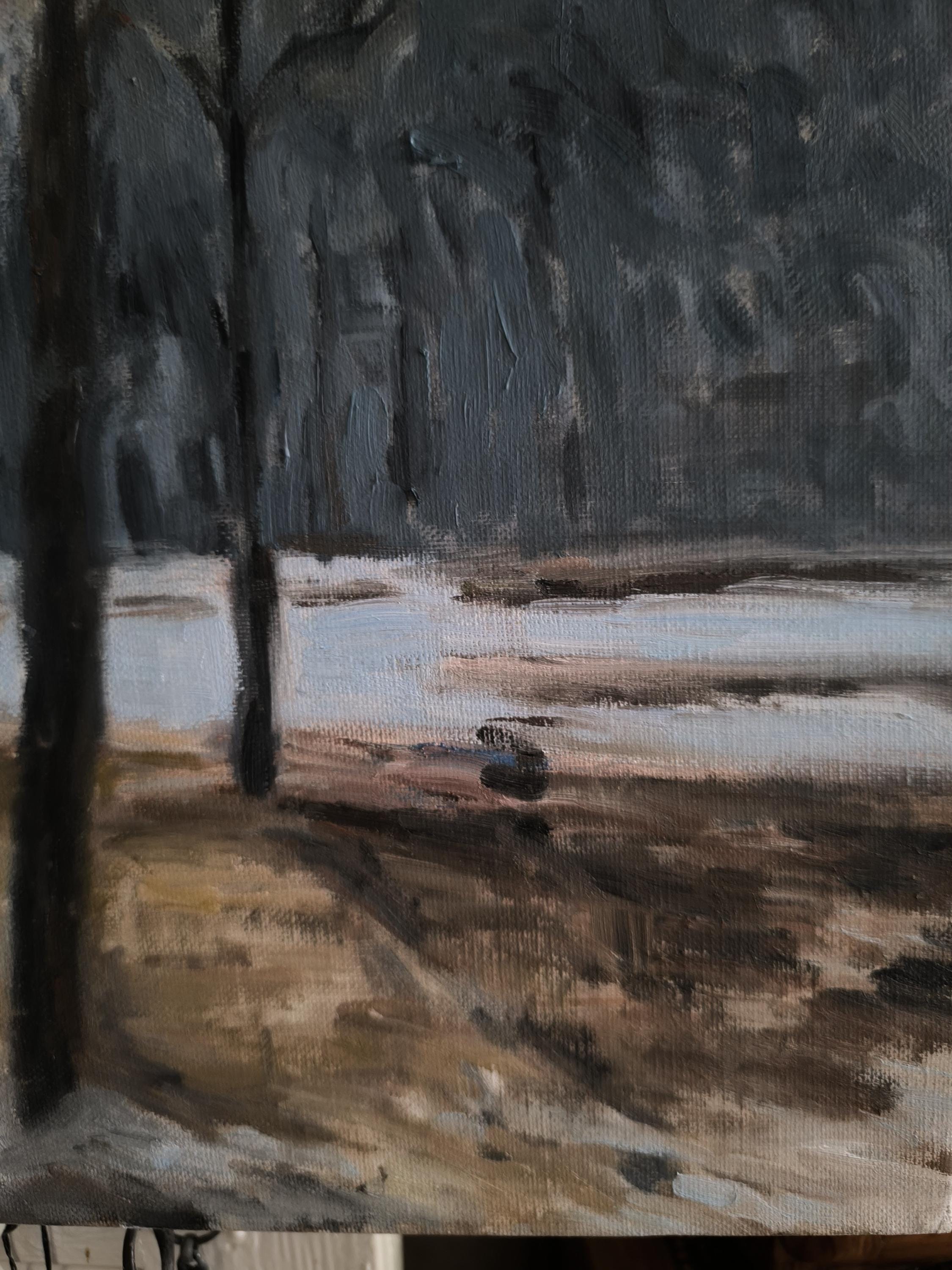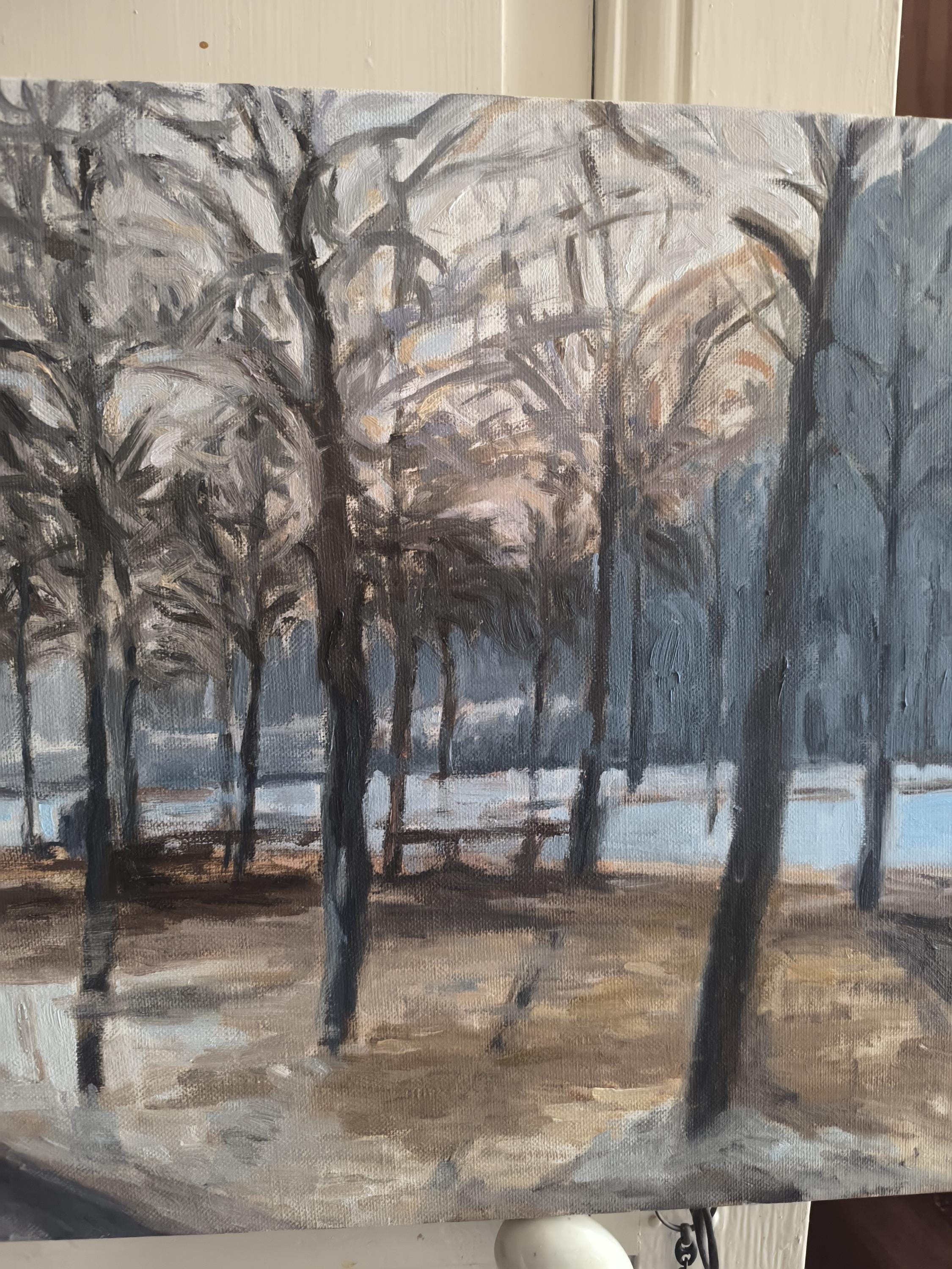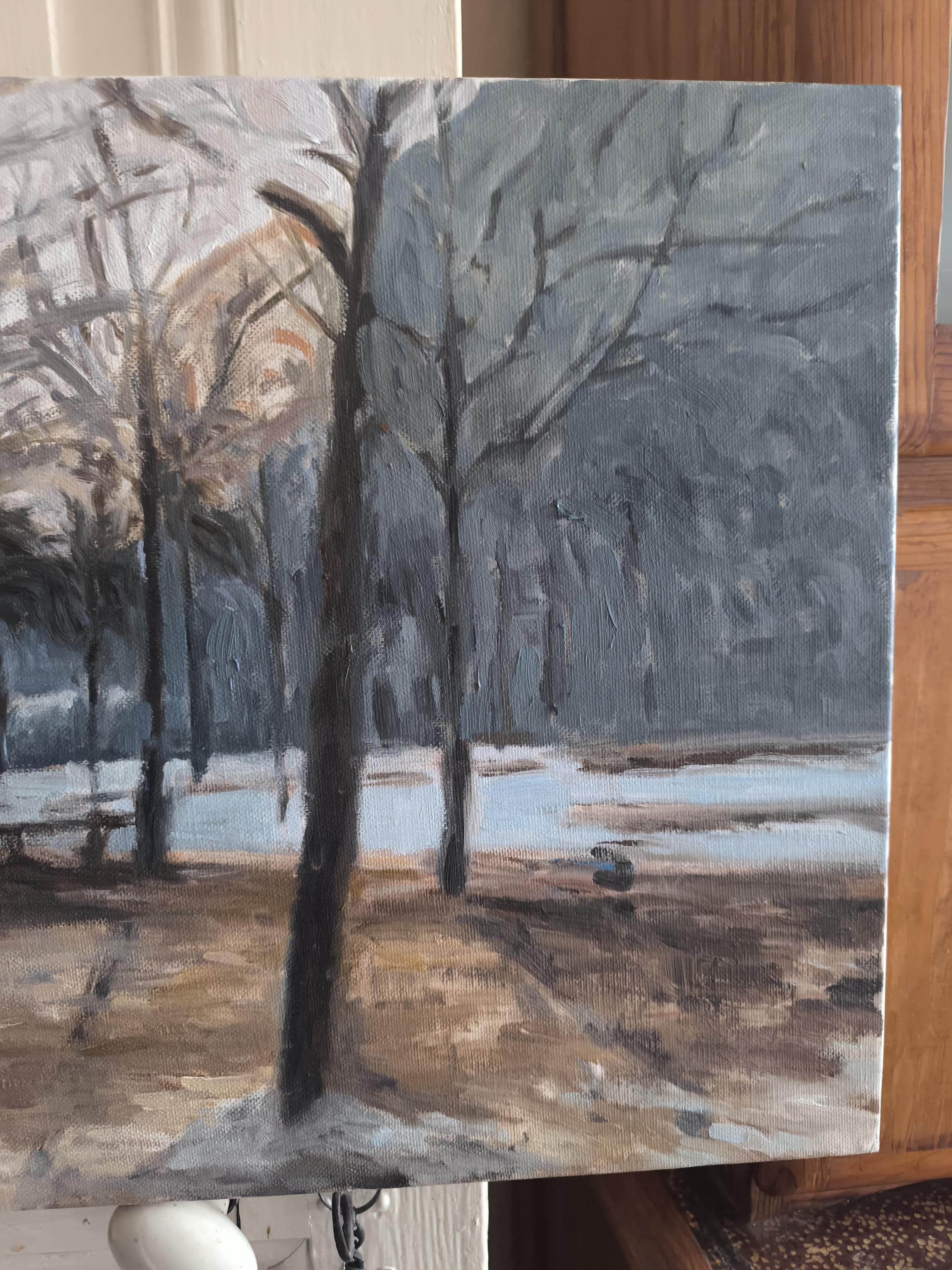 This artwork sensitively captures the atmosphere of a winter's day, where slender, bare trees line a path. Soft, diffused light filters through the branches, creating subtle plays of light and shadow on the ground scattered with snow and earth. The dominant colors, in shades of gray, brown, and white, evoke the tranquility and melancholic beauty of this season.