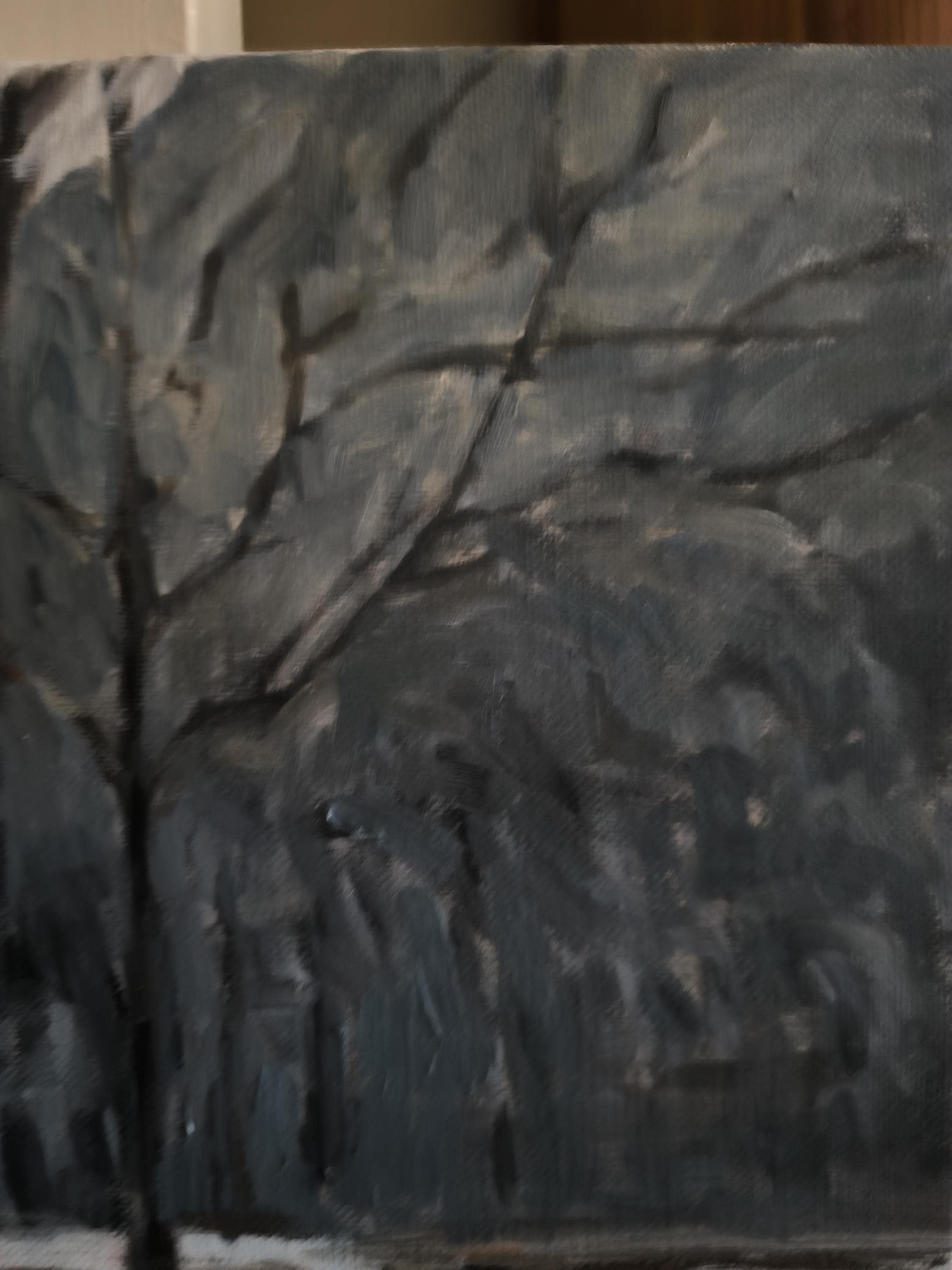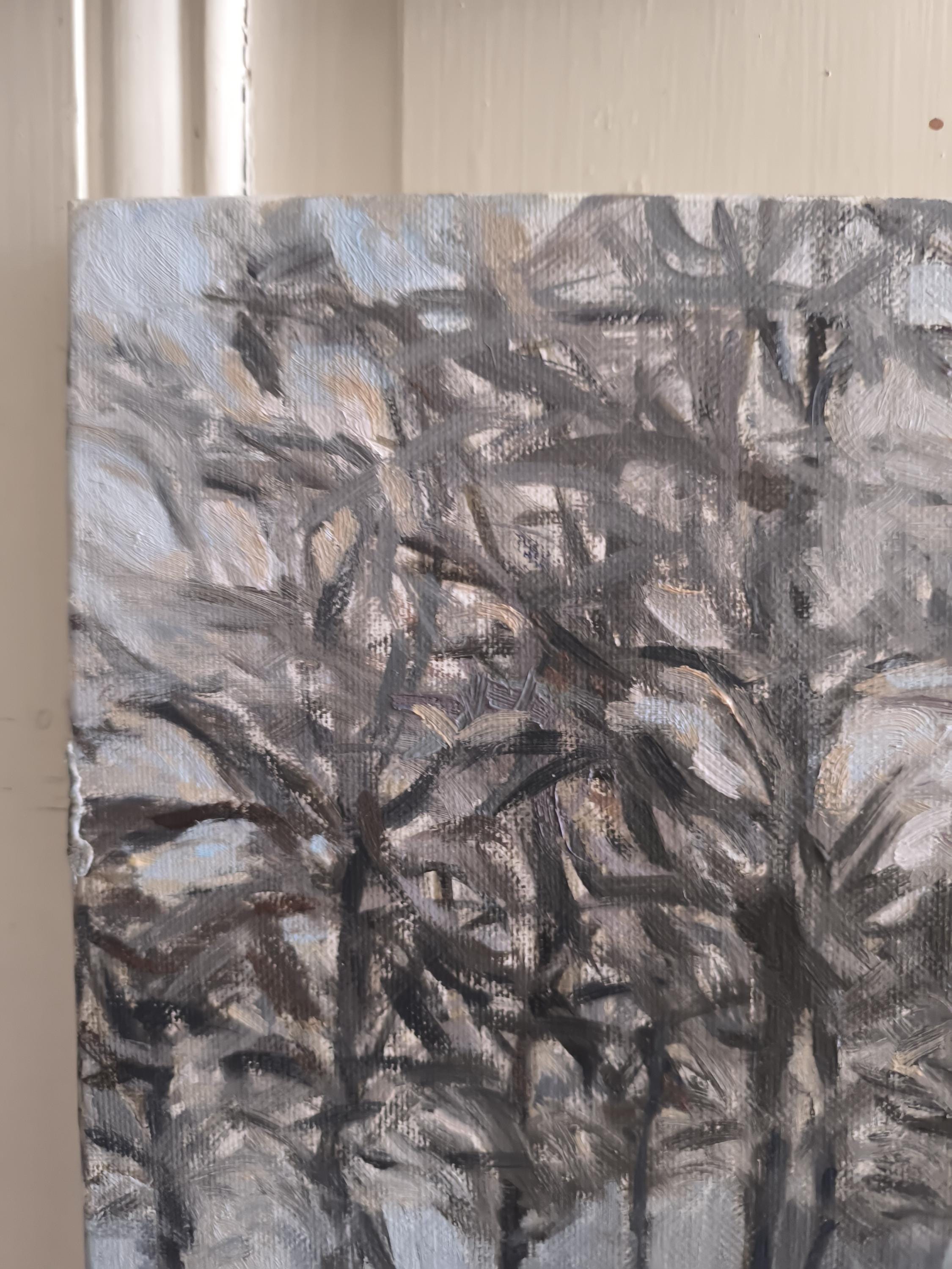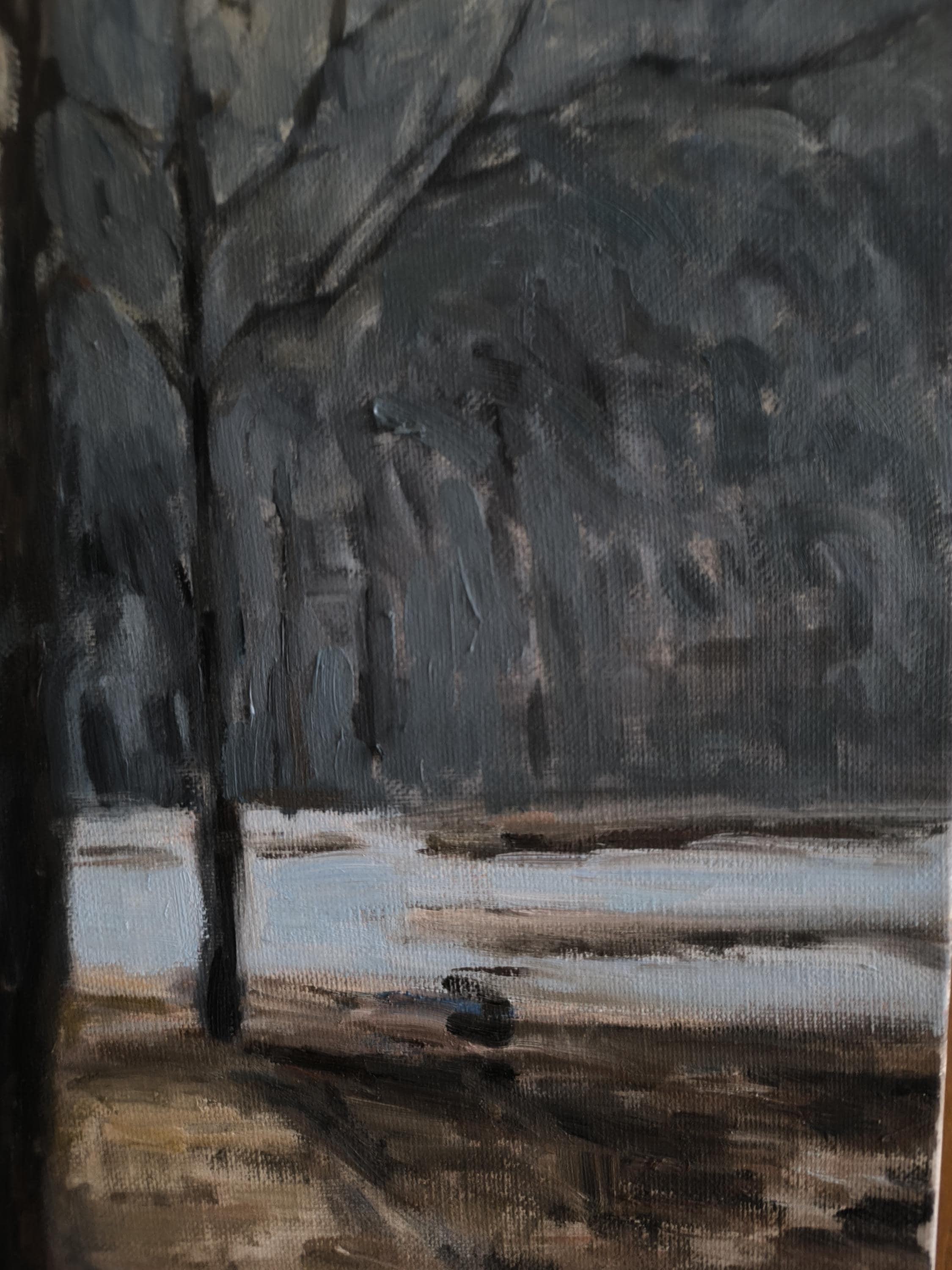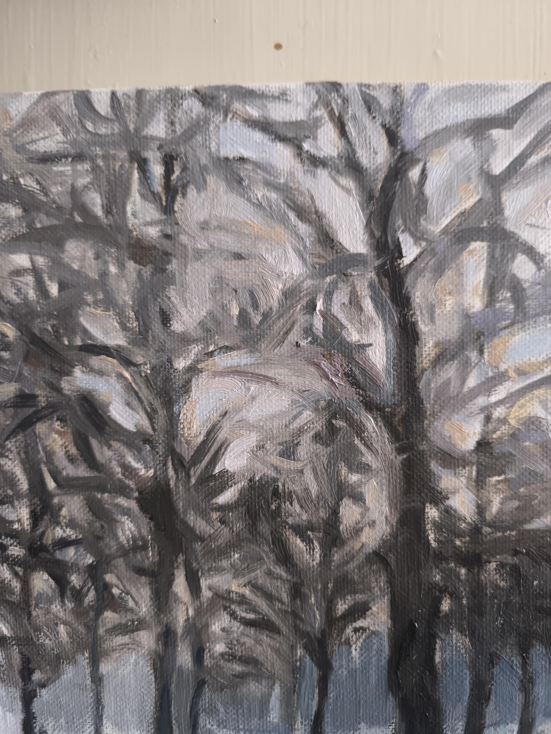 This artwork sensitively captures the atmosphere of a winter's day, where slender, bare trees line a path. Soft, diffused light filters through the branches, creating subtle plays of light and shadow on the ground scattered with snow and earth. The dominant colors, in shades of gray, brown, and white, evoke the tranquility and melancholic beauty of this season.