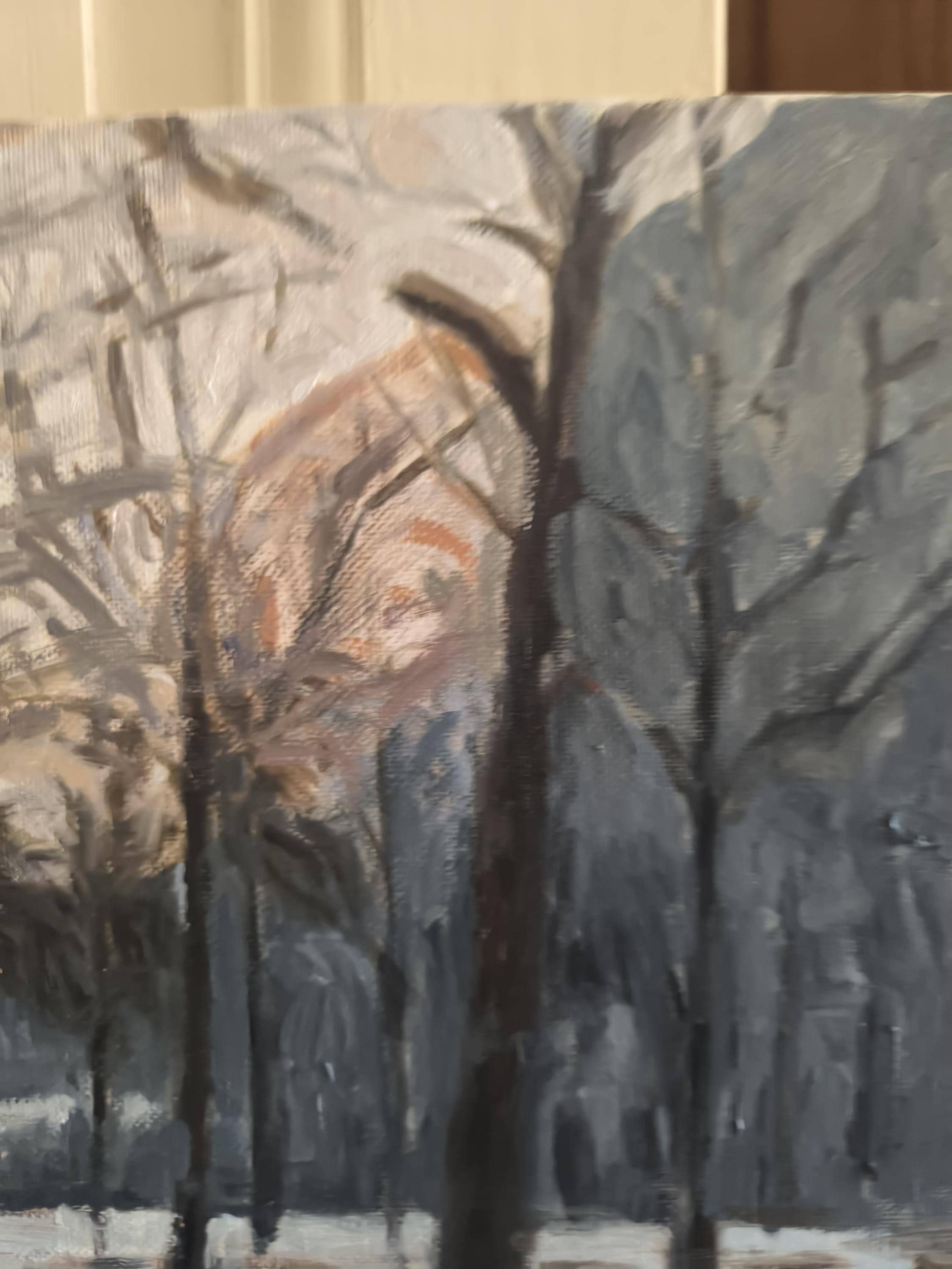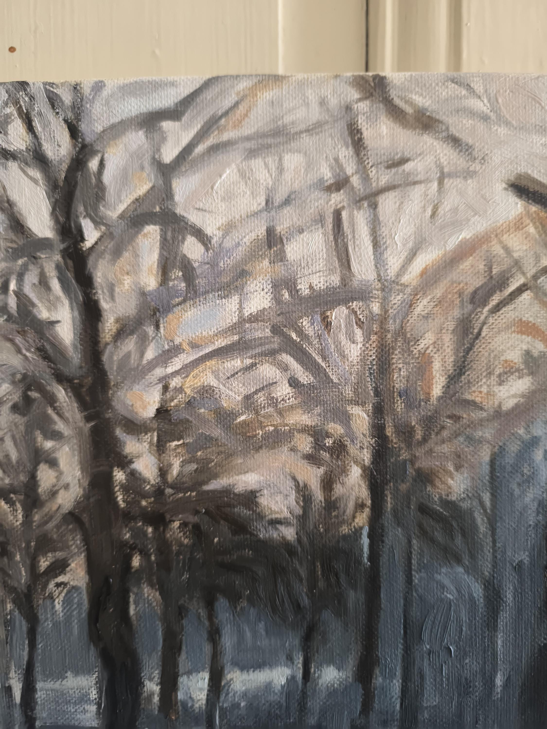 Magnificent original oil on canvas by the artist Mireille Besson born in 1931 † 2023, lived in Lyon and then in Taulignan in the Drôme, unsigned, artist's stamp on the back, representing a poetic winter scene entitled "Avenue of Trees".