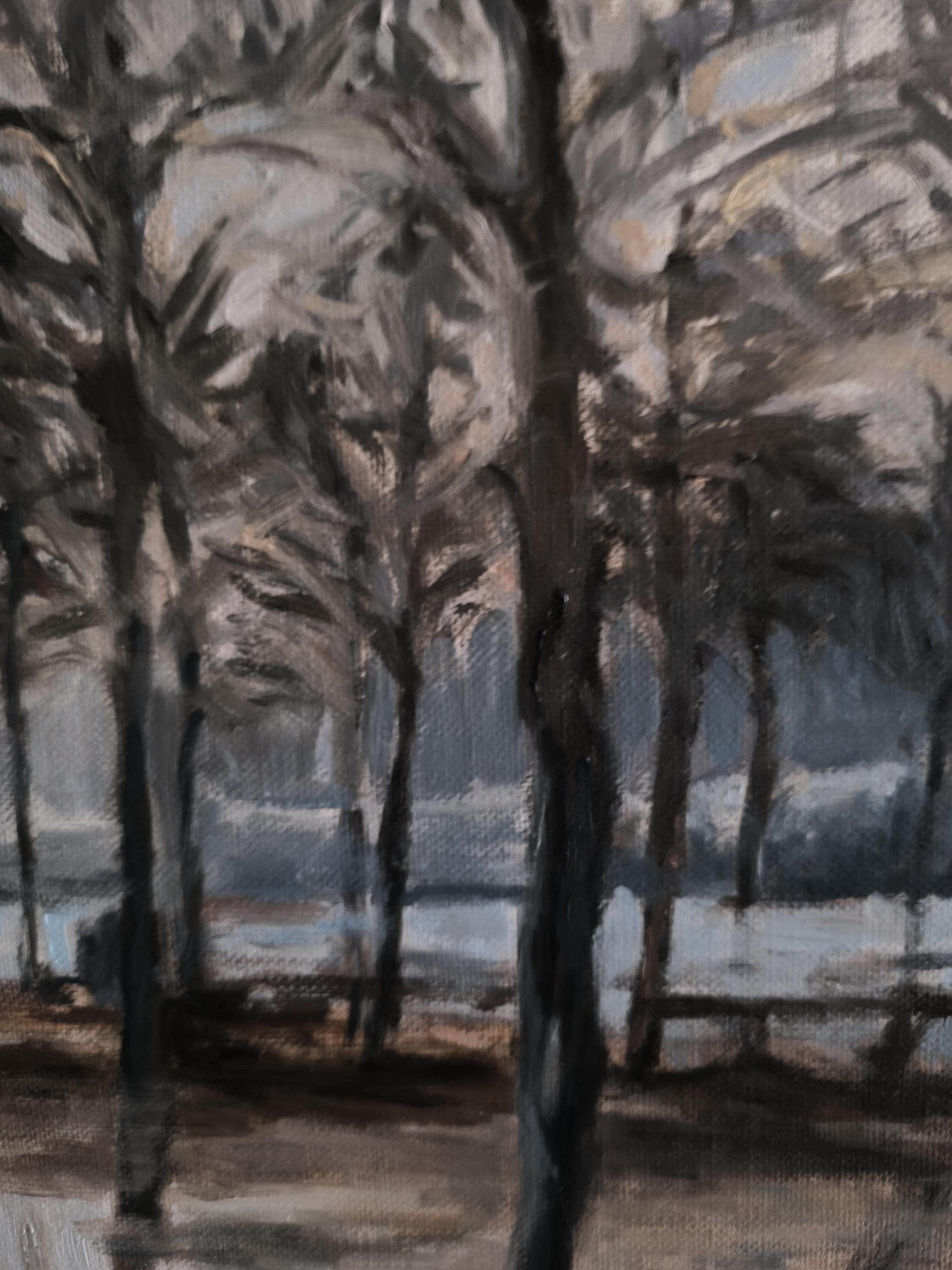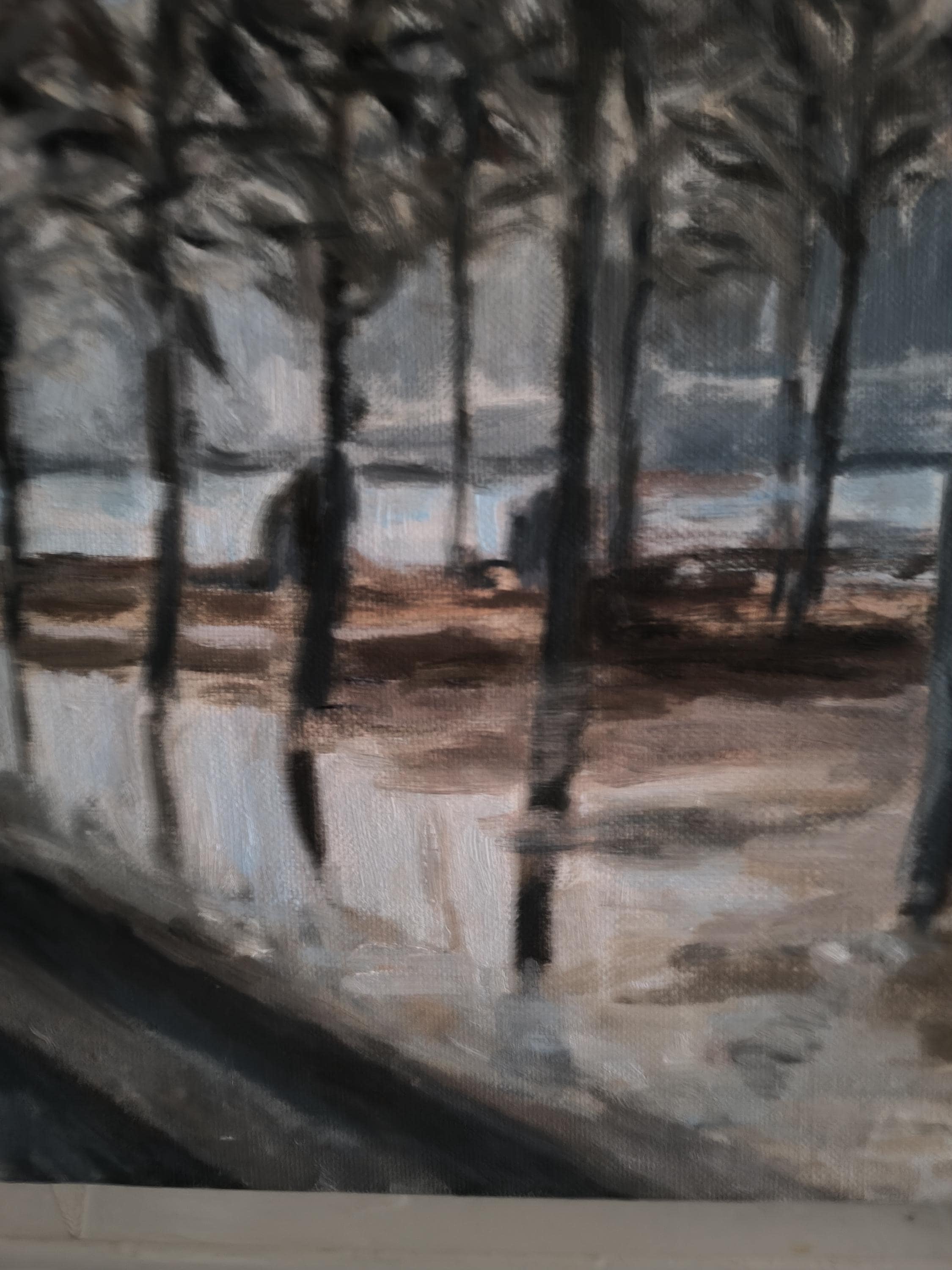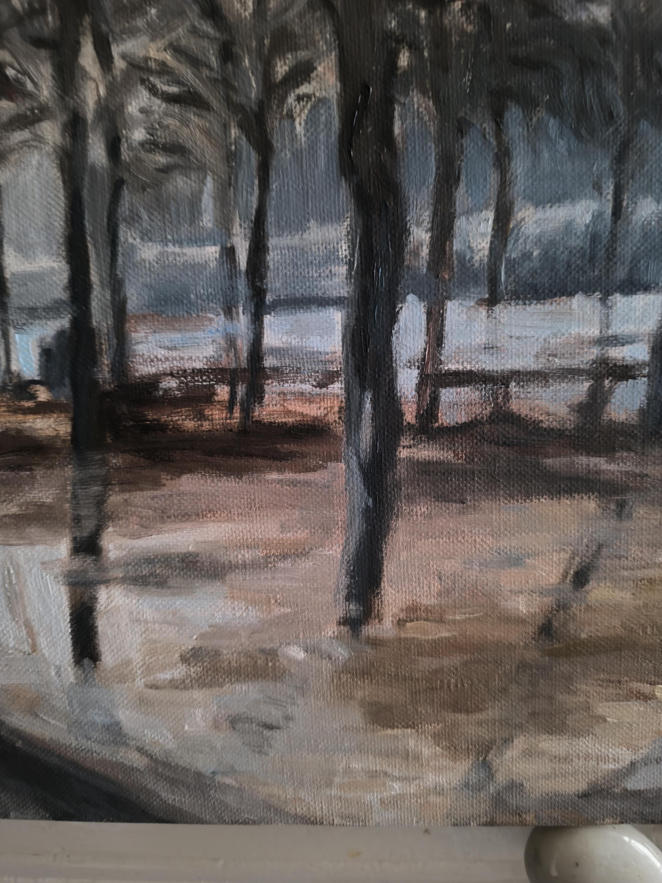 Mireille Besson demonstrates her talent for capturing the emotion and depth of a landscape. The oil painting technique lends a rich and vibrant texture to the canvas, making each brushstroke palpable. The reflections on the wet ground add a touch of realism and depth to the composition.