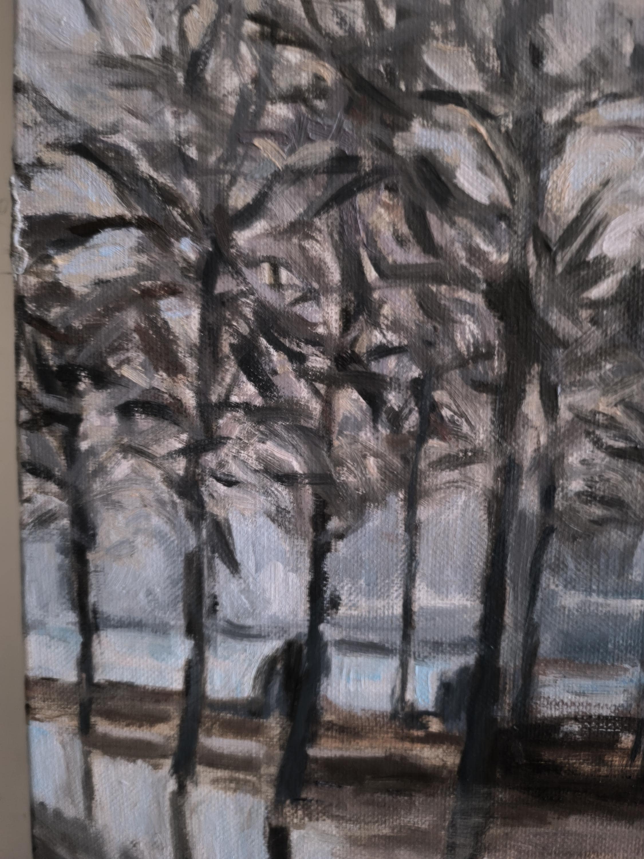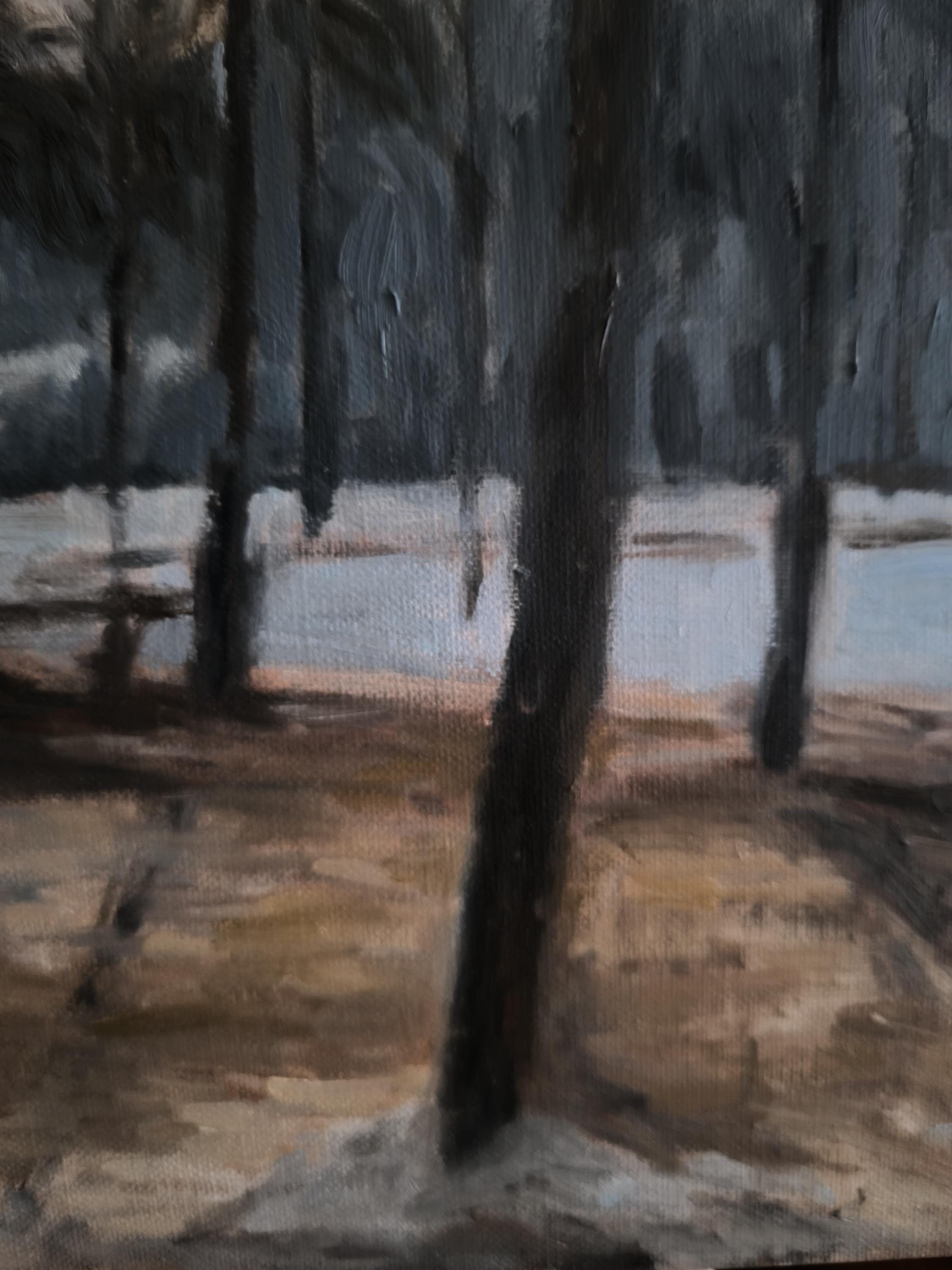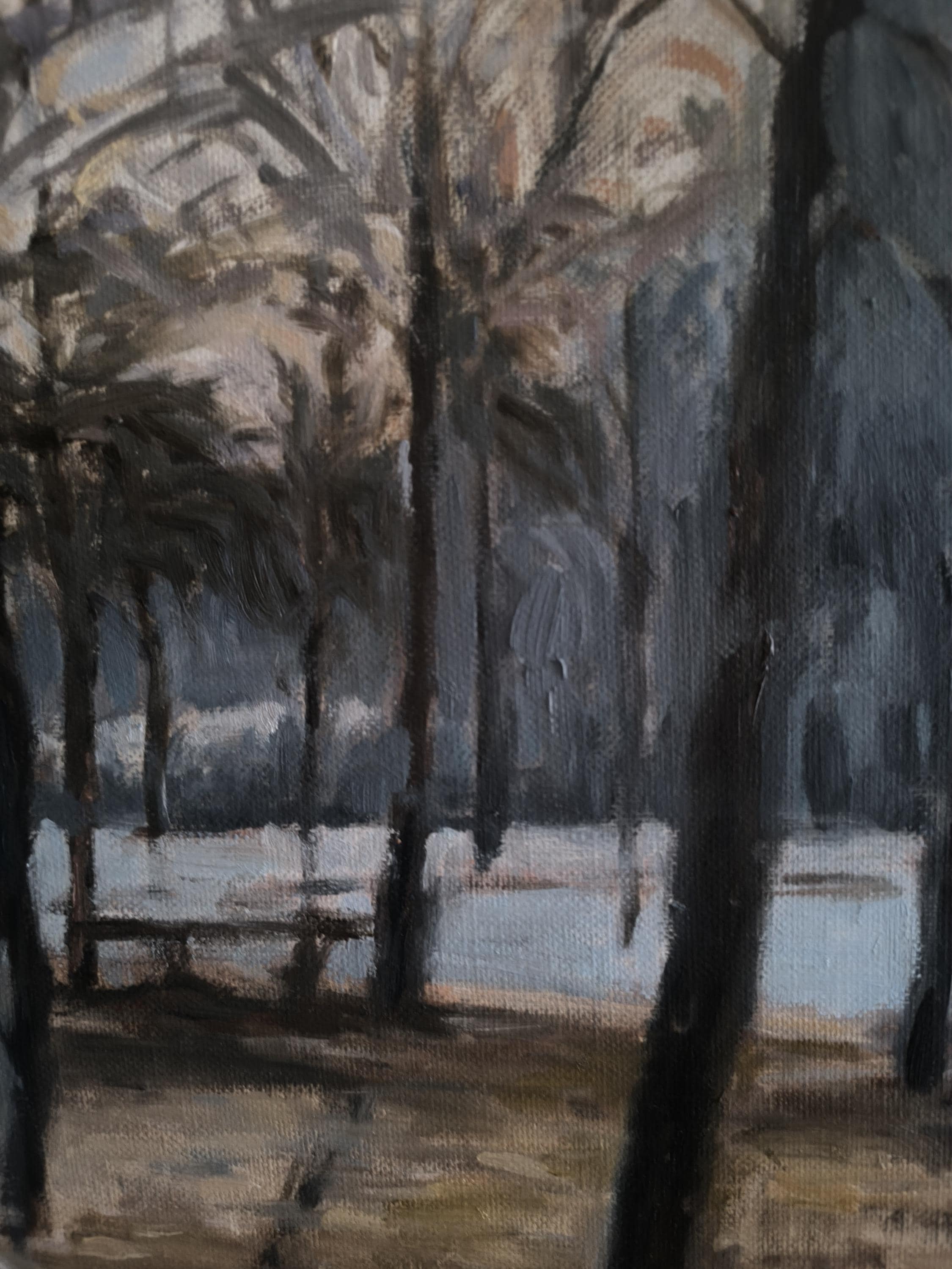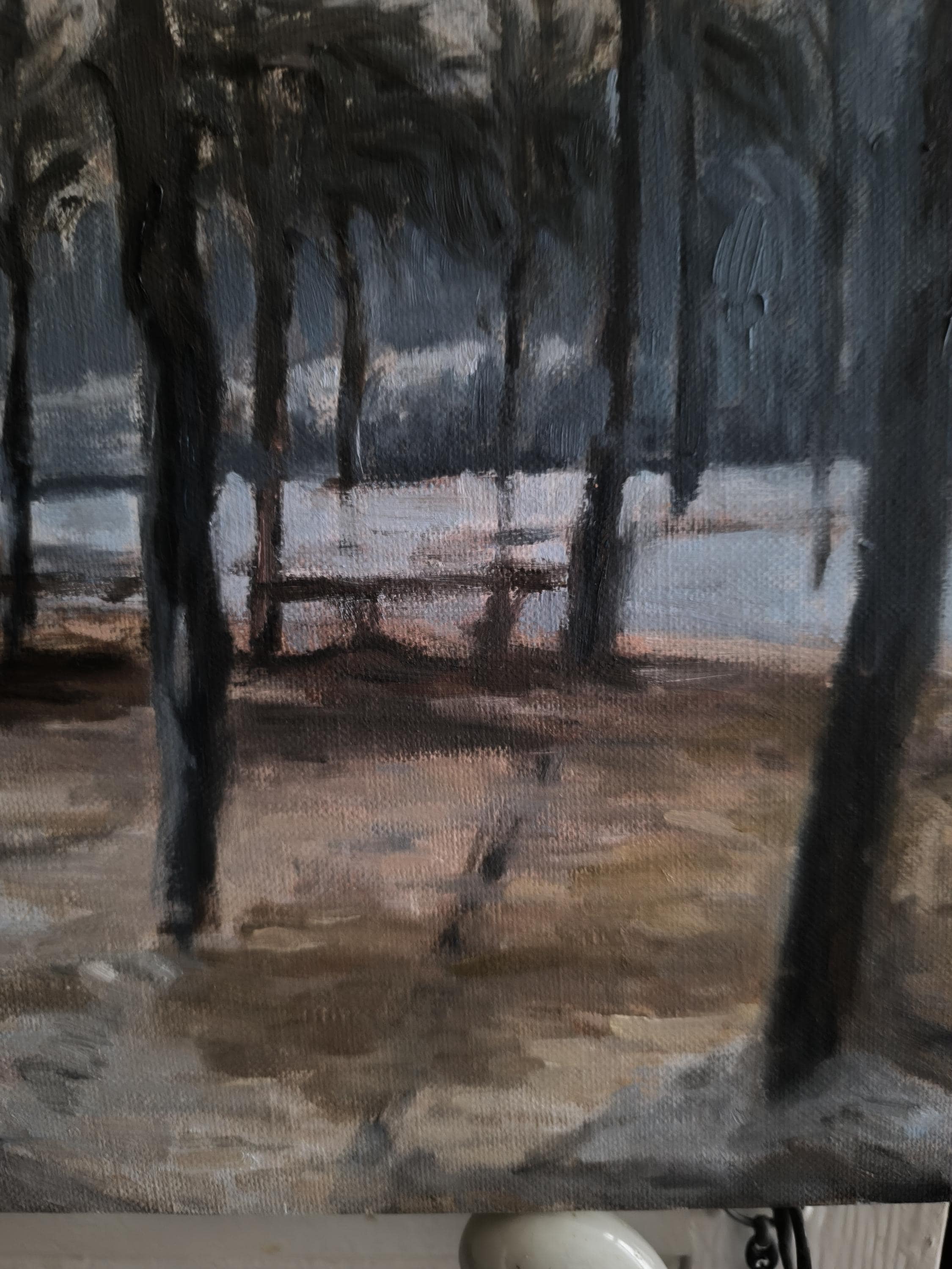 Mireille Besson demonstrates her talent for capturing the emotion and depth of a landscape. The oil painting technique lends a rich and vibrant texture to the canvas, making each brushstroke palpable. The reflections on the wet ground add a touch of realism and depth to the composition.