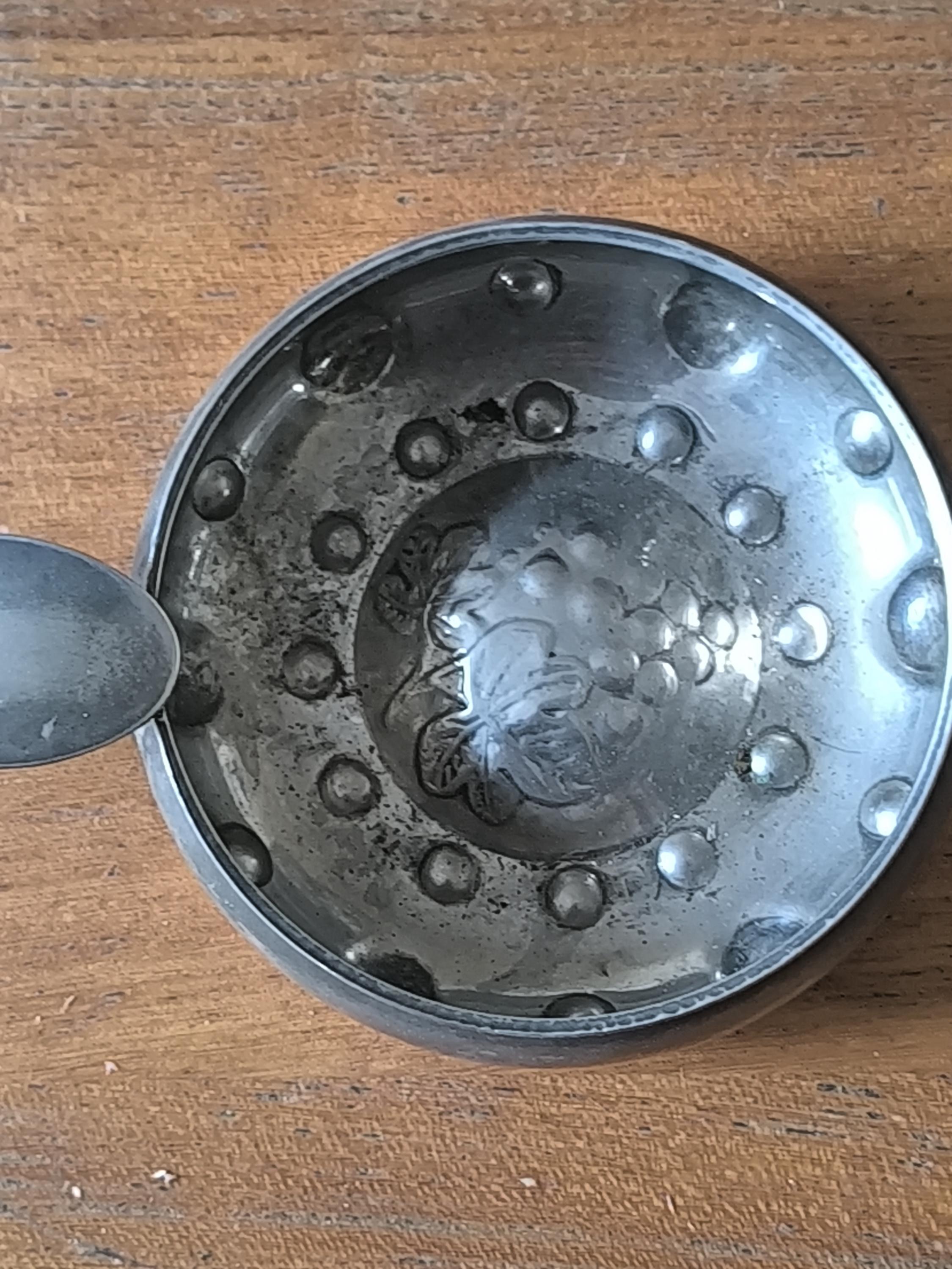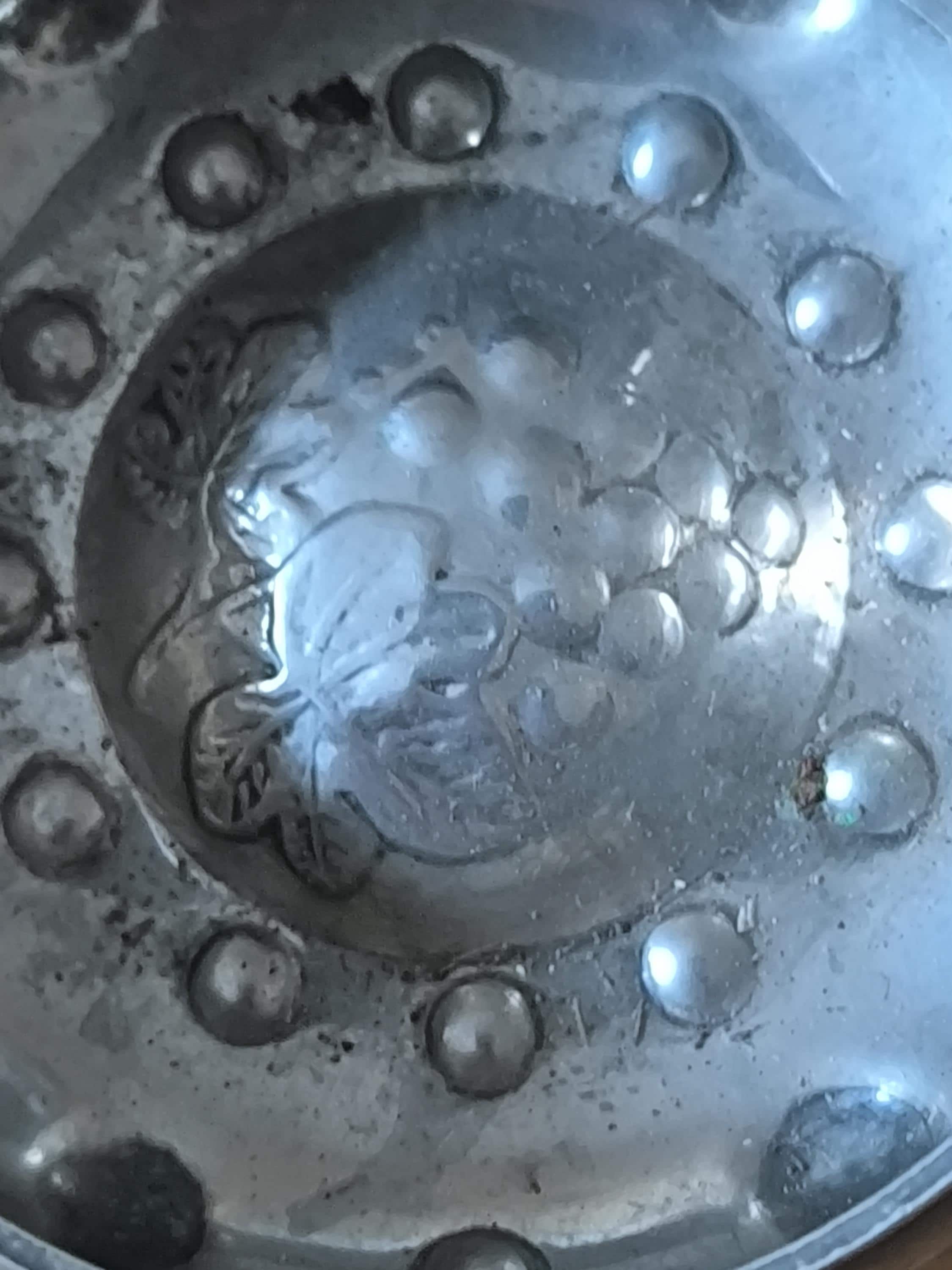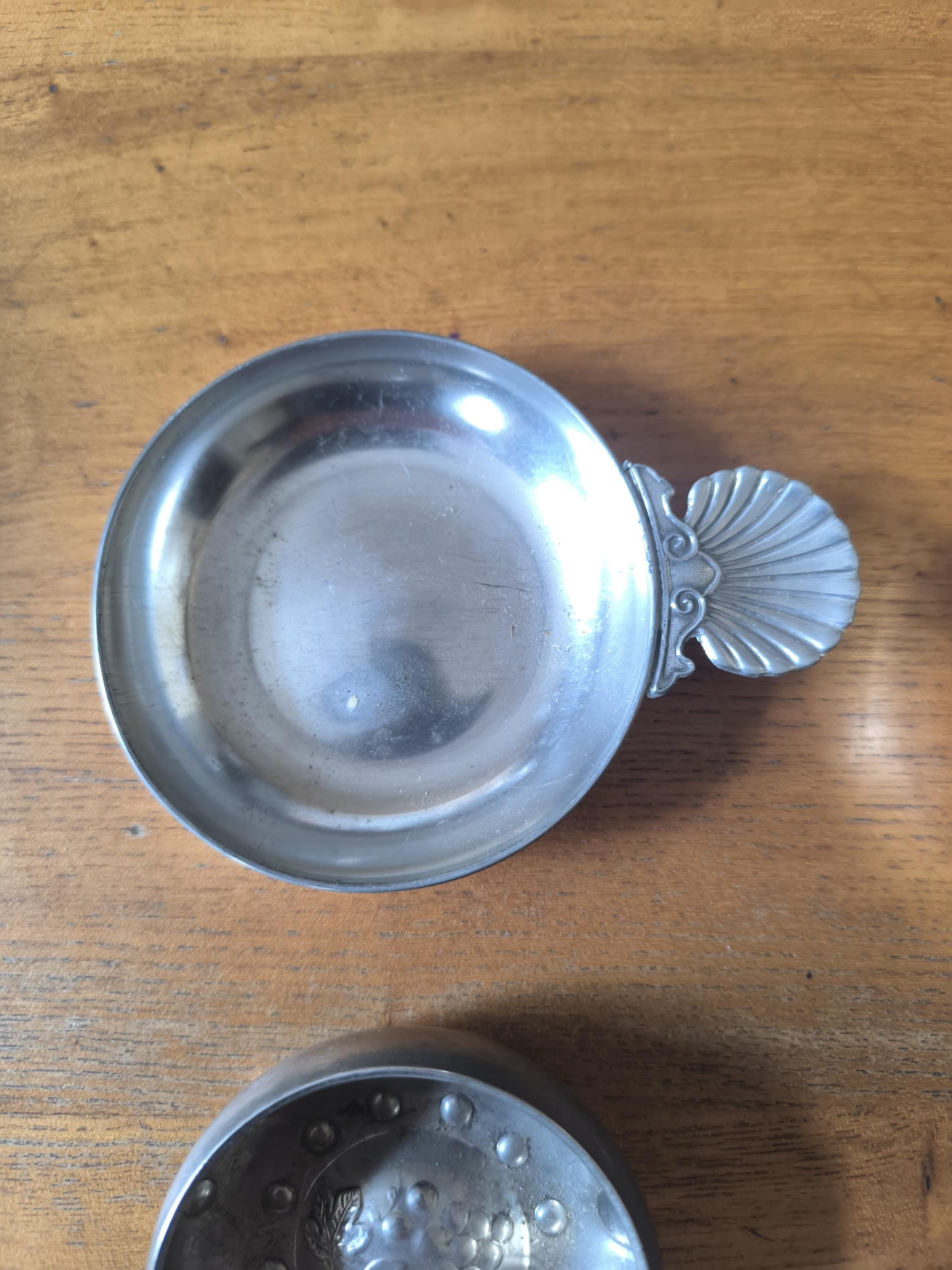 A lovely set of two silver-plated wine tasting cups, one decorated with grapes.