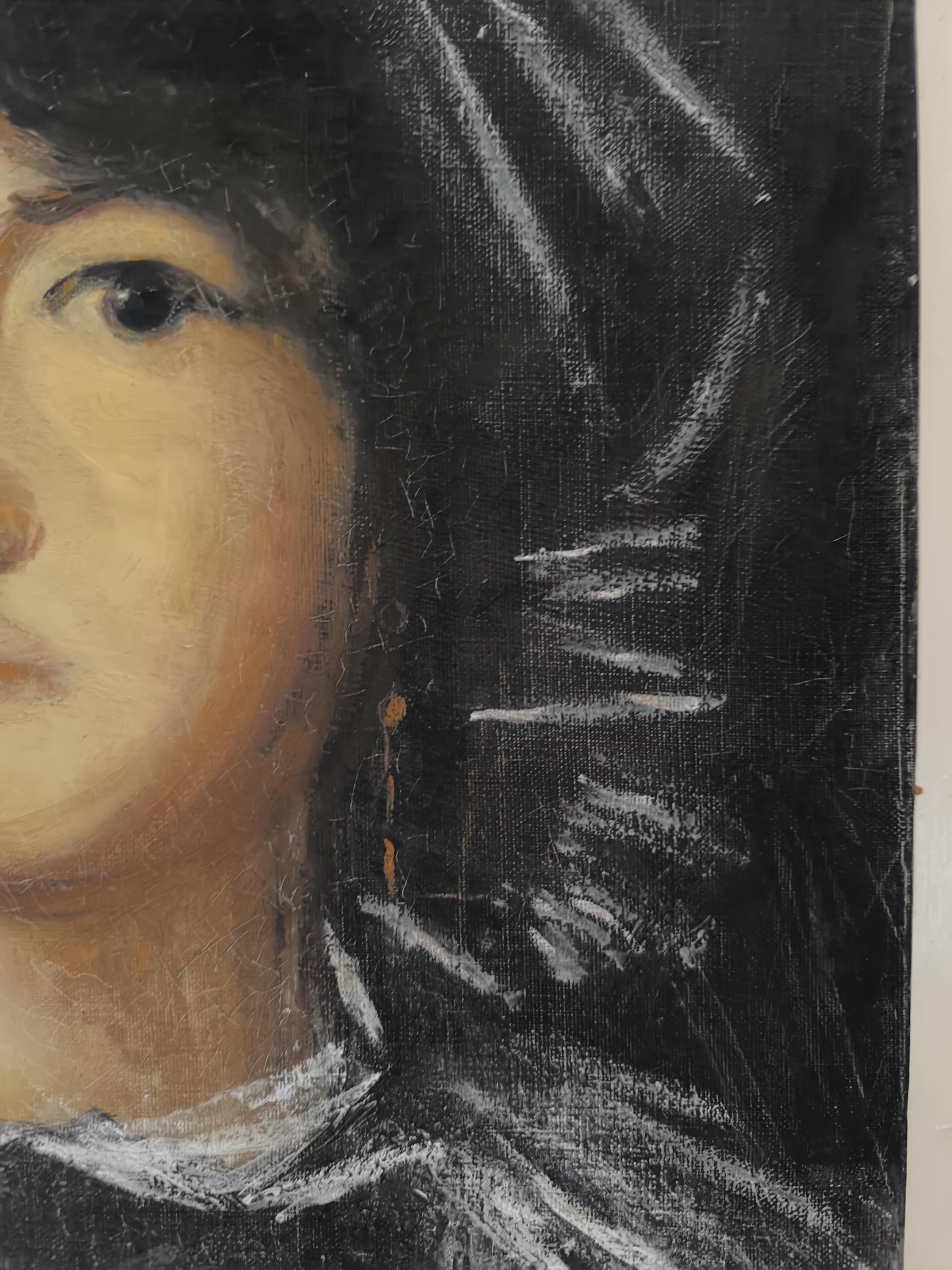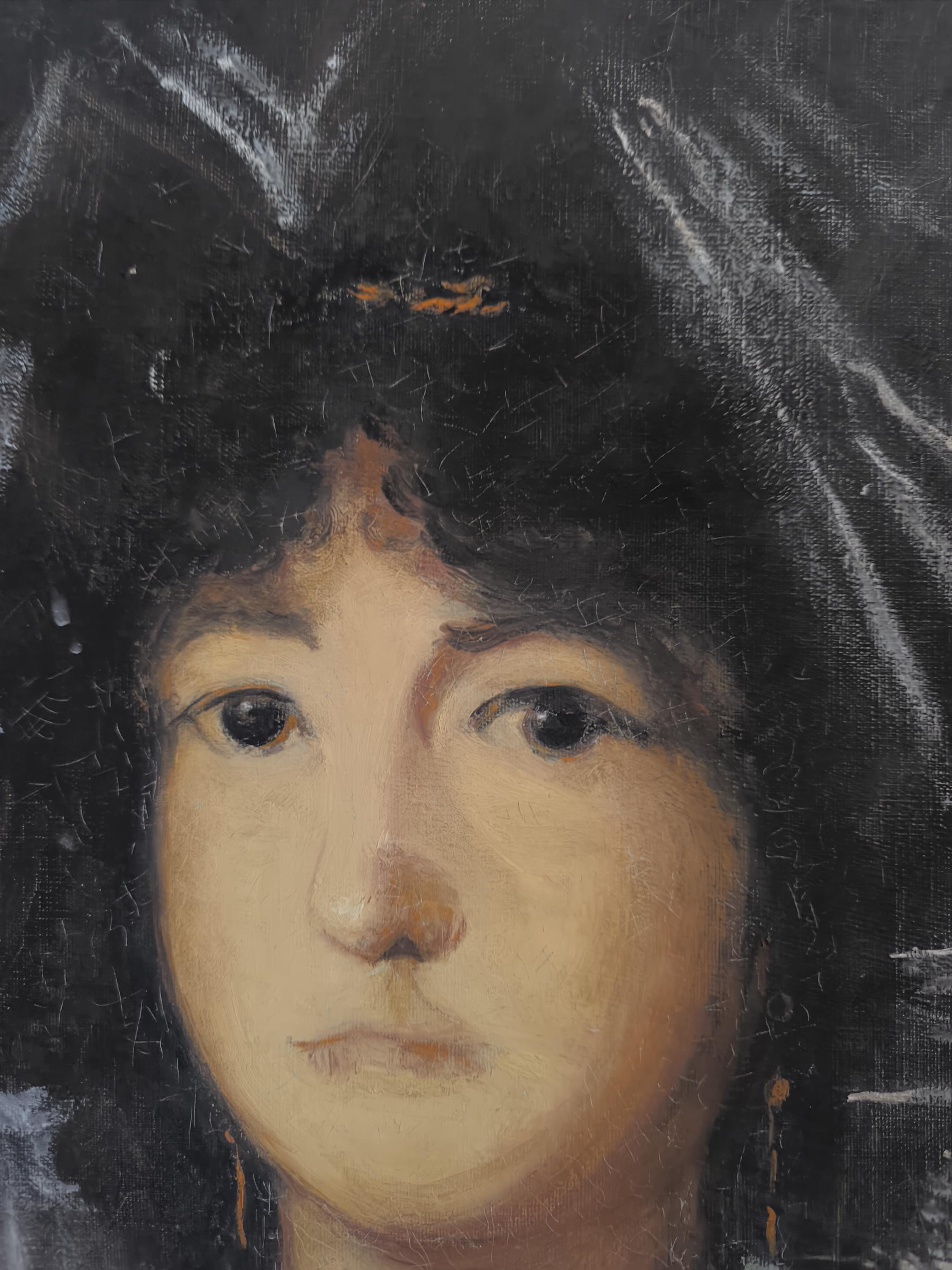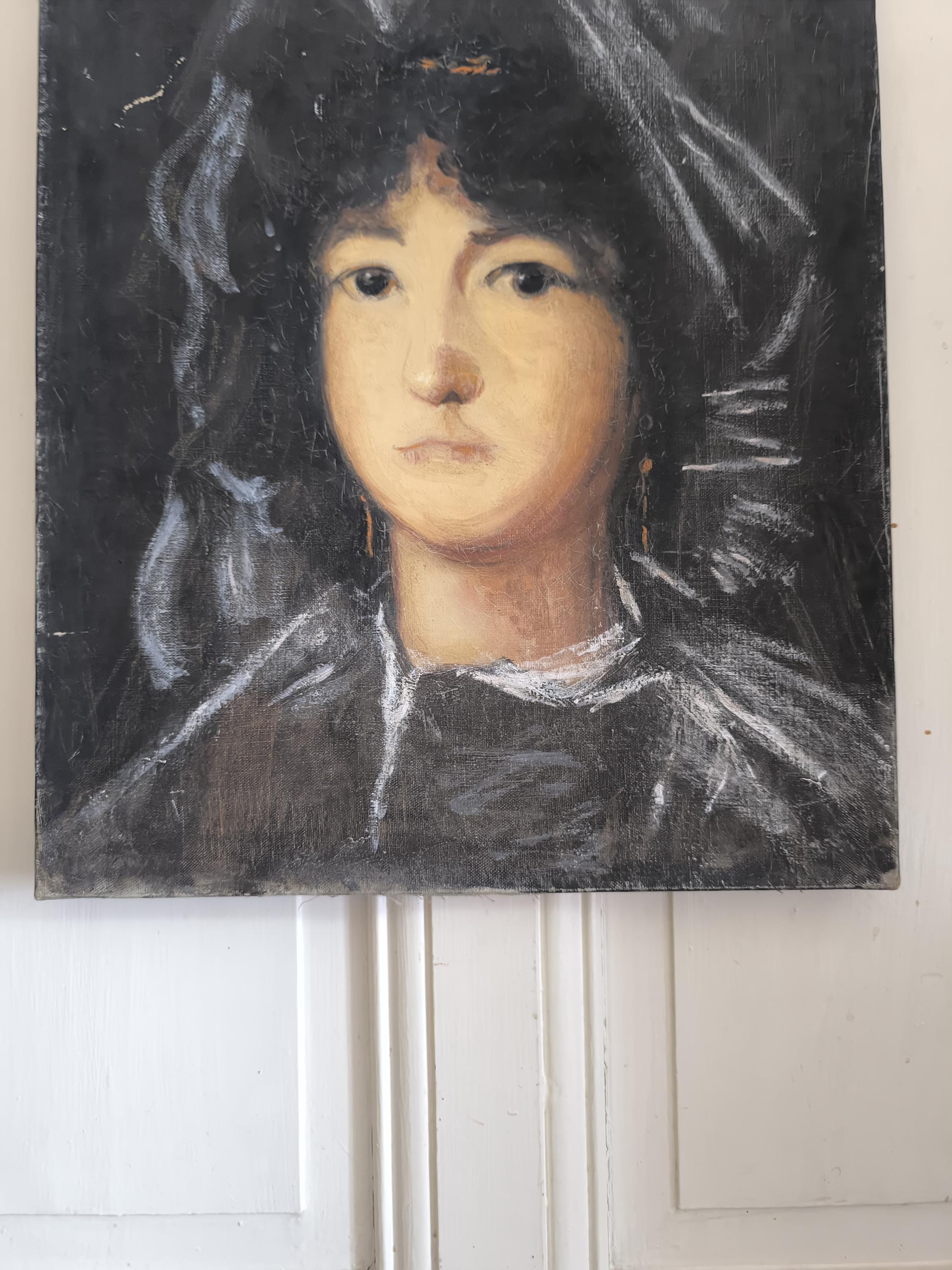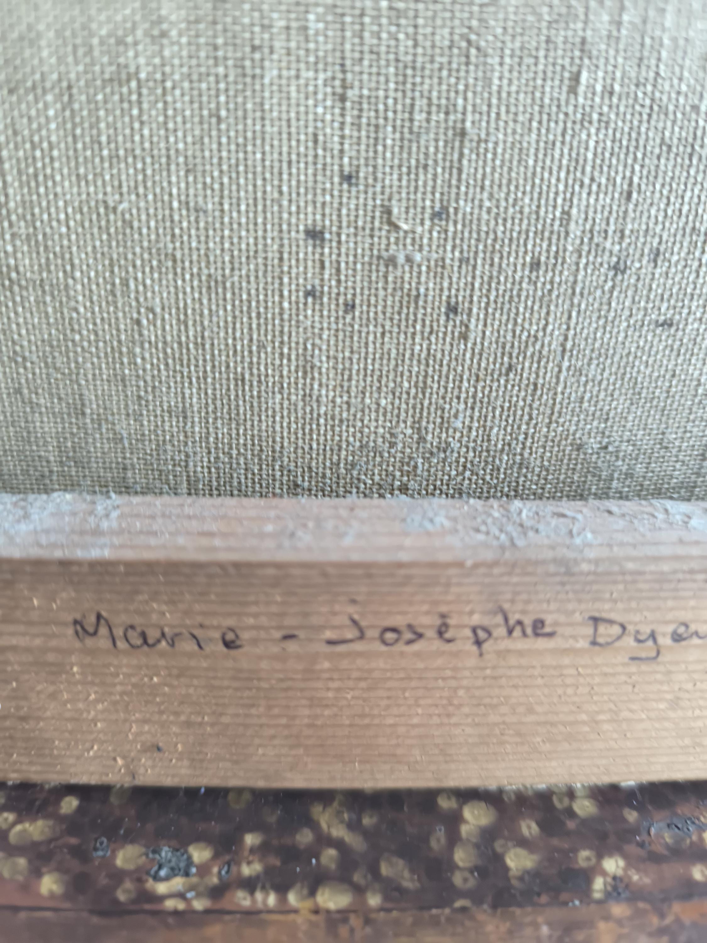L'œuvre est un portrait représentant une jeune femme, peint par Marie Joseph Dyen (1918-2018) signature en partie effacée en bas à gauche , dite Gohelle, elle représente la Marquise de Lazan, d'après une œuvre de Goya. La femme est représentée de face, avec un regard direct et une expression neutre. Elle porte une coiffe noire volumineuse et des vêtements sombres, typiques de la mode de la fin du XVIIIe siècle ou du début du XIXe siècle. Le fond est sombre, ce qui met en valeur le visage et la coiffure de la modèle. L'artiste a utilisé des touches de blanc pour suggérer la lumière sur les plis de la coiffe et des vêtements, ainsi que sur le visage de la marquise. On peut observer des boucles d'oreilles pendantes, de couleur dorée, qui ajoutent une touche de couleur discrète à l'ensemble. La technique employée semble être celle de la peinture à l'huile, avec des empâtements de matière par endroits, notamment sur la coiffe et les vêtements. Le style général évoque le portrait d'époque, avec une attention particulière portée à la ressemblance physique et à la représentation du statut social de la modèle.