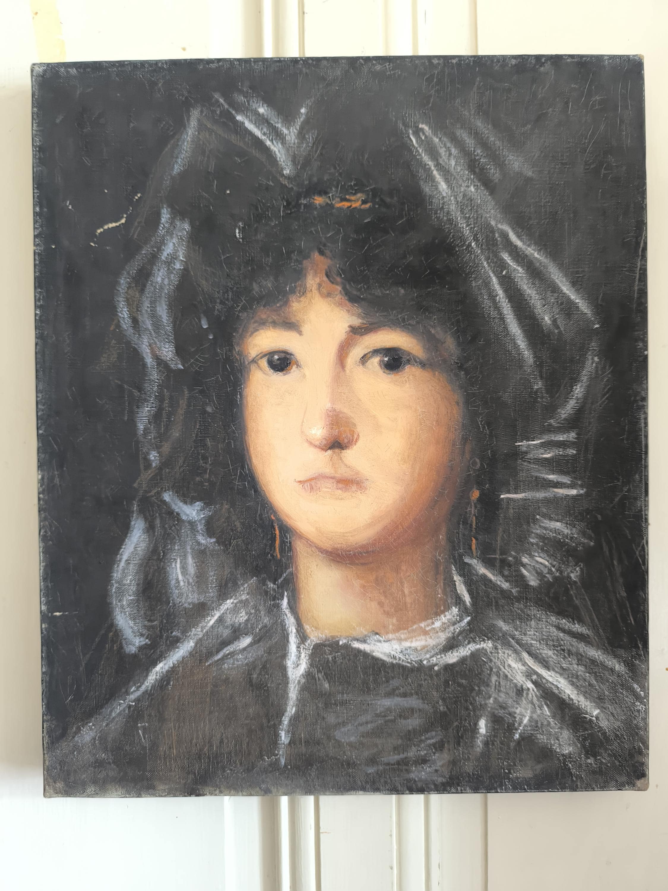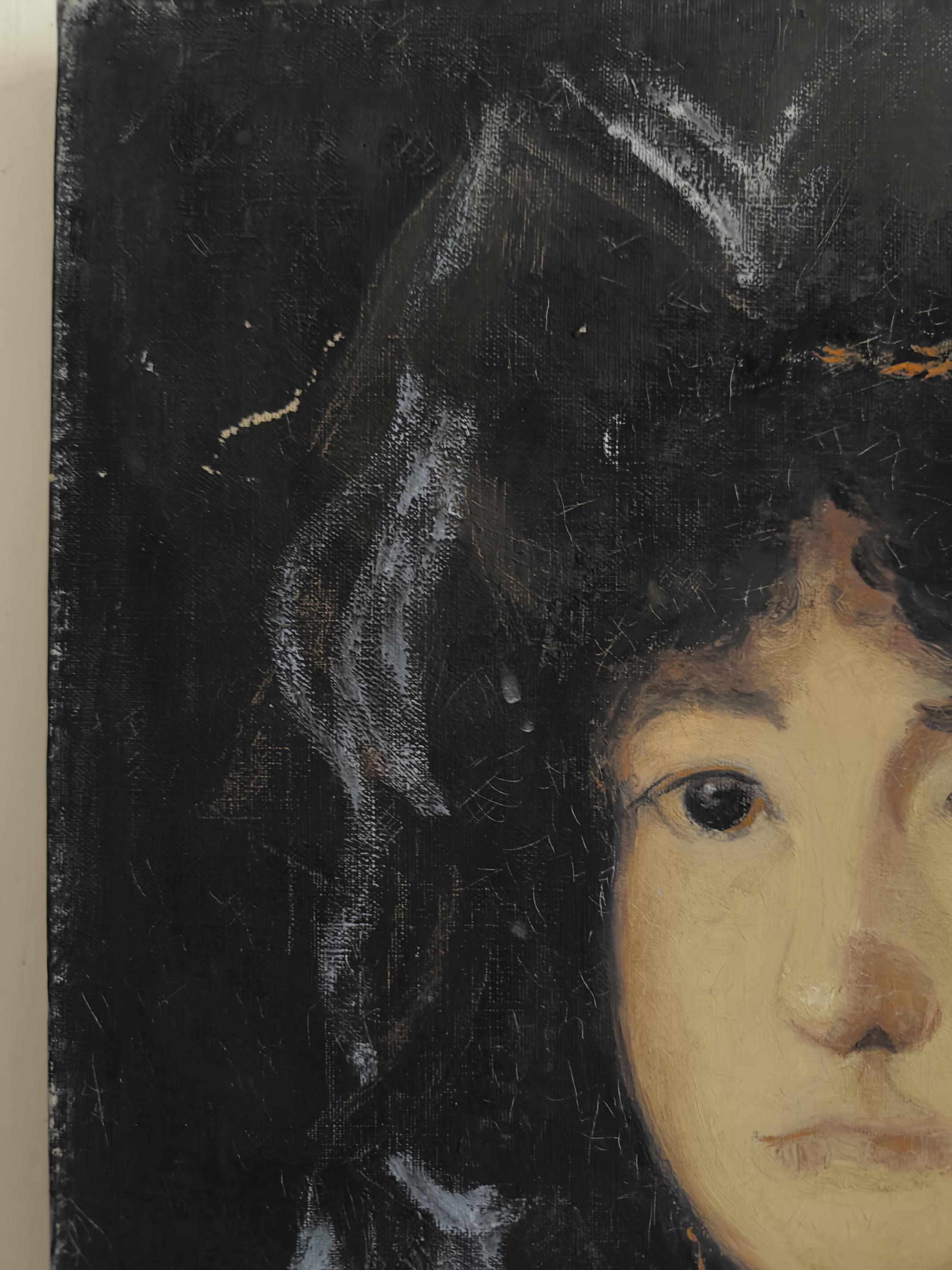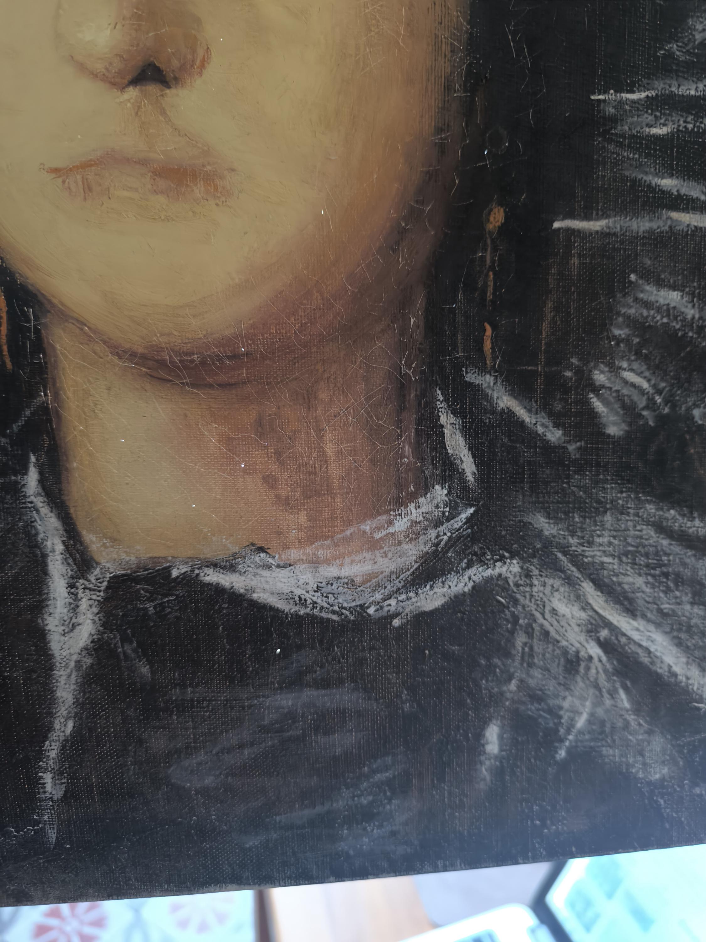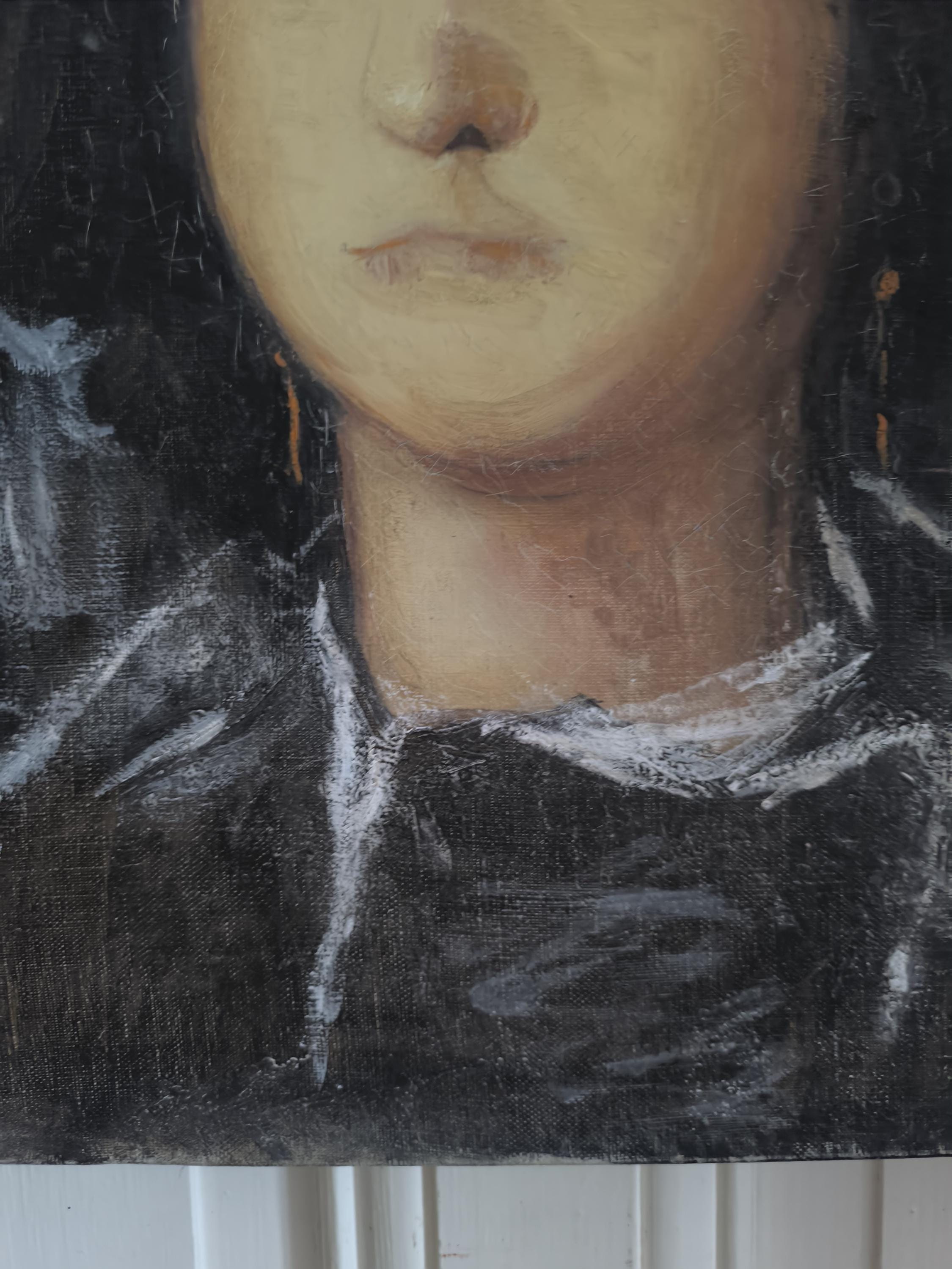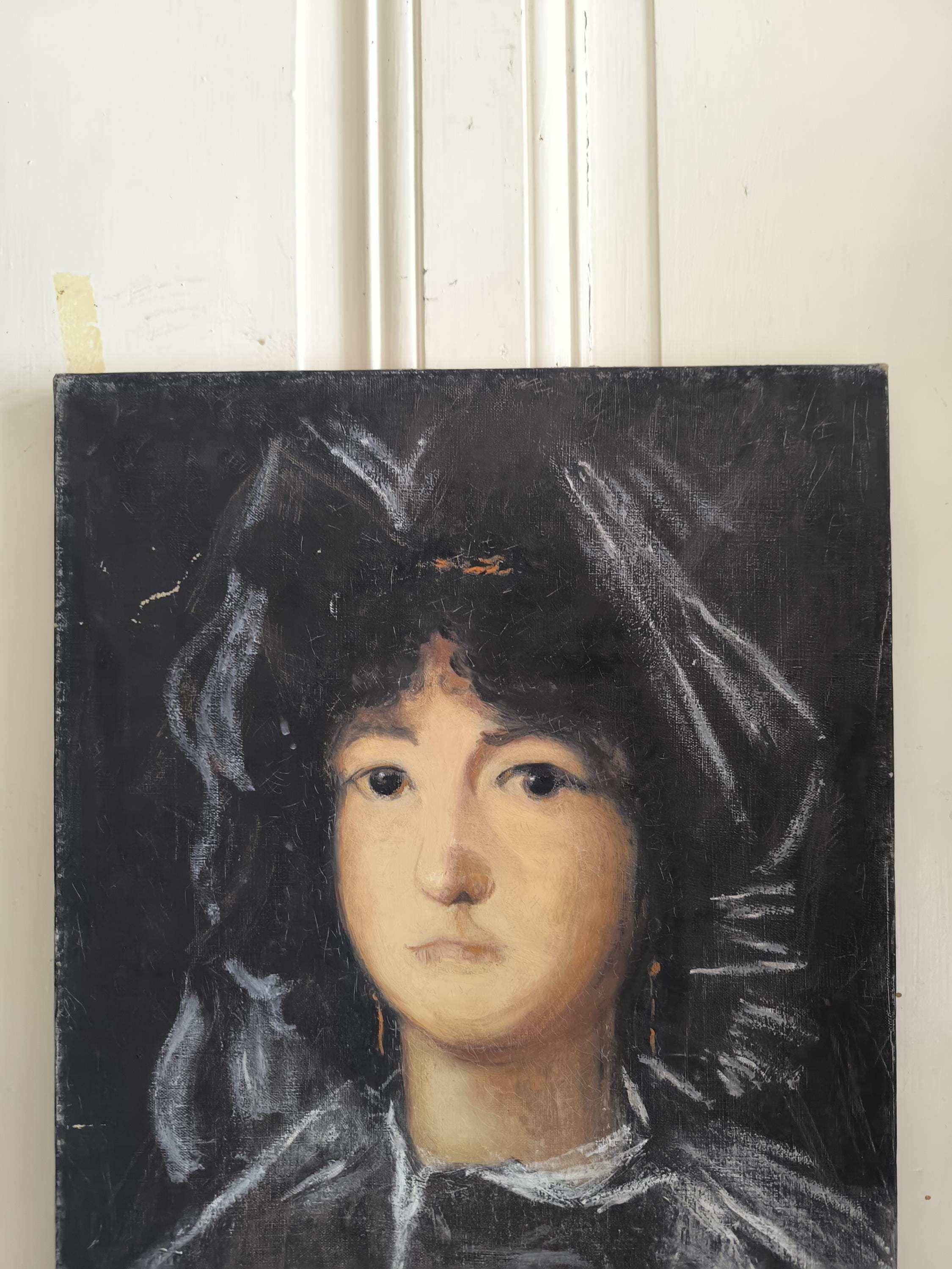 L'œuvre est un portrait représentant une jeune femme, peint par Marie Joseph Dyen (1918-2018) signature en partie effacée en bas à gauche , dite Gohelle, elle représente la Marquise de Lazan, d'après une œuvre de Goya. La femme est représentée de face, avec un regard direct et une expression neutre. Elle porte une coiffe noire volumineuse et des vêtements sombres, typiques de la mode de la fin du XVIIIe siècle ou du début du XIXe siècle. Le fond est sombre, ce qui met en valeur le visage et la coiffure de la modèle. L'artiste a utilisé des touches de blanc pour suggérer la lumière sur les plis de la coiffe et des vêtements, ainsi que sur le visage de la marquise. On peut observer des boucles d'oreilles pendantes, de couleur dorée, qui ajoutent une touche de couleur discrète à l'ensemble. La technique employée semble être celle de la peinture à l'huile, avec des empâtements de matière par endroits, notamment sur la coiffe et les vêtements. Le style général évoque le portrait d'époque, avec une attention particulière portée à la ressemblance physique et à la représentation du statut social de la modèle.
