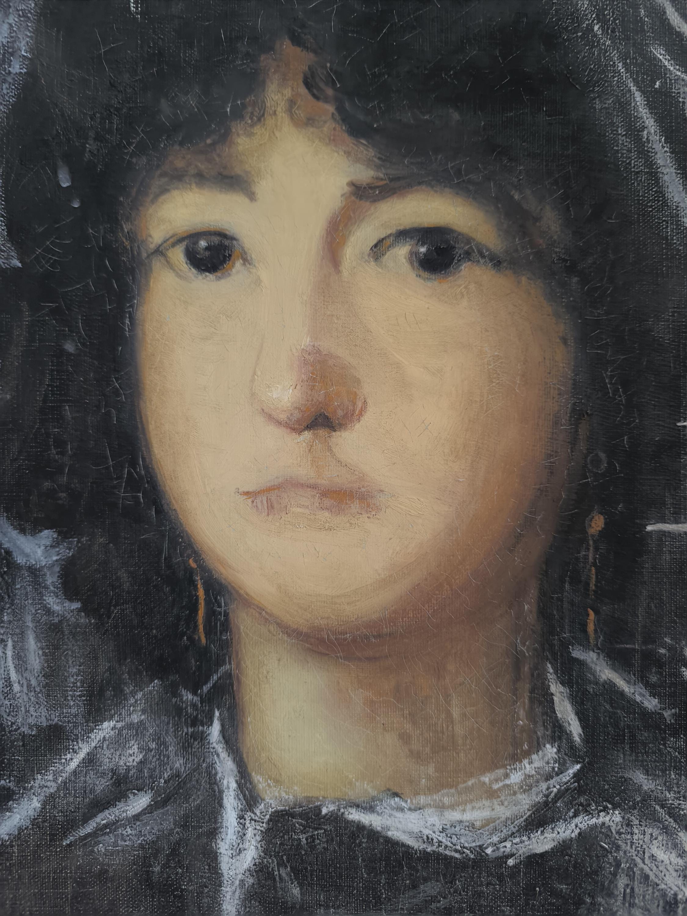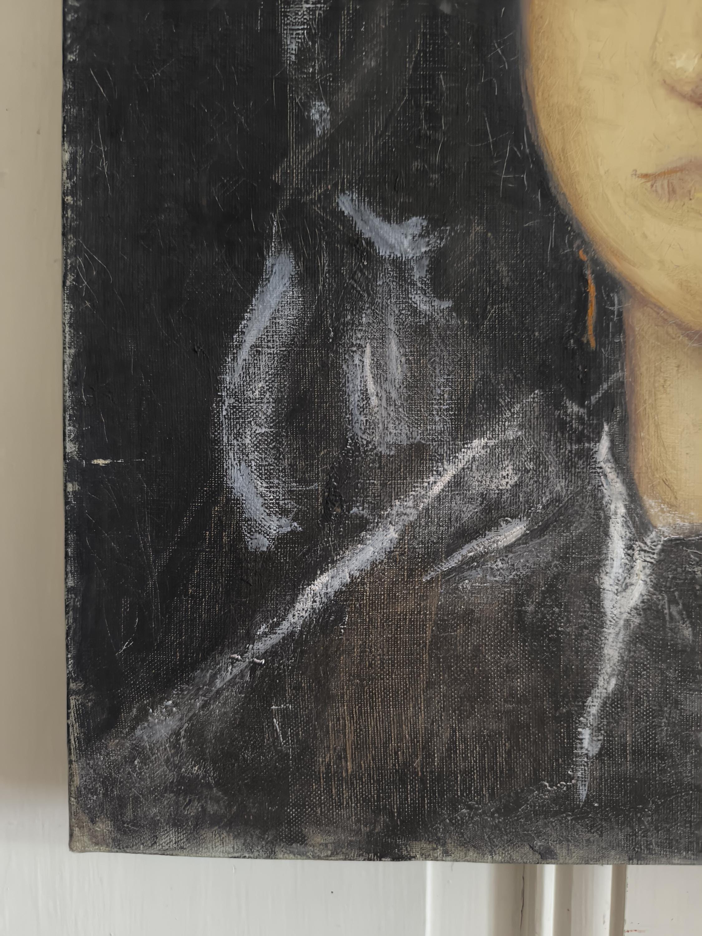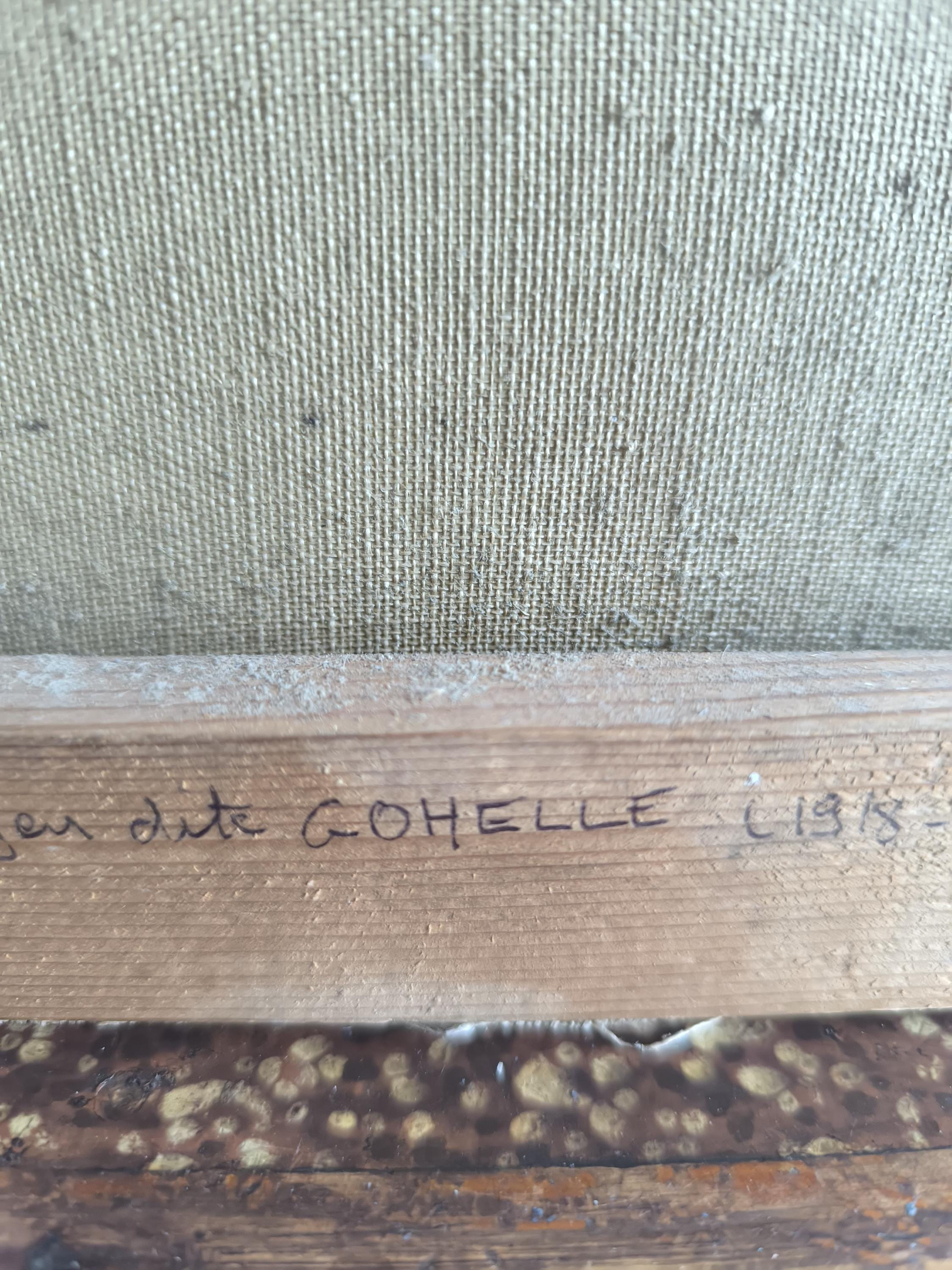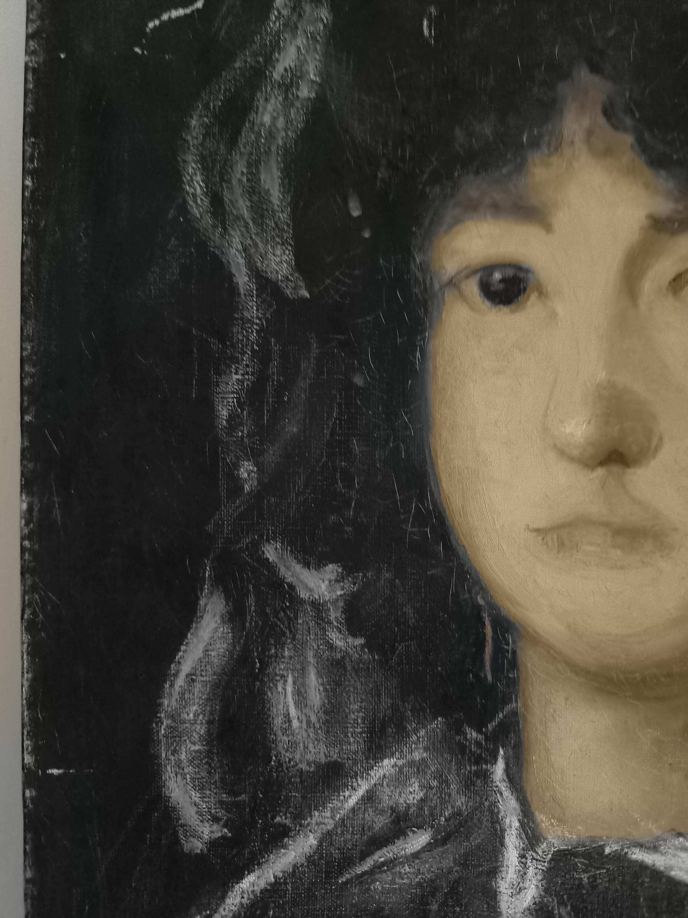 L'œuvre est un portrait représentant une jeune femme, peint par Marie Joseph Dyen (1918-2018) signature en partie effacée en bas à gauche , dite Gohelle, elle représente la Marquise de Lazan, d'après une œuvre de Goya. La femme est représentée de face, avec un regard direct et une expression neutre. Elle porte une coiffe noire volumineuse et des vêtements sombres, typiques de la mode de la fin du XVIIIe siècle ou du début du XIXe siècle. Le fond est sombre, ce qui met en valeur le visage et la coiffure de la modèle. L'artiste a utilisé des touches de blanc pour suggérer la lumière sur les plis de la coiffe et des vêtements, ainsi que sur le visage de la marquise. On peut observer des boucles d'oreilles pendantes, de couleur dorée, qui ajoutent une touche de couleur discrète à l'ensemble. La technique employée semble être celle de la peinture à l'huile, avec des empâtements de matière par endroits, notamment sur la coiffe et les vêtements. Le style général évoque le portrait d'époque, avec une attention particulière portée à la ressemblance physique et à la représentation du statut social de la modèle.