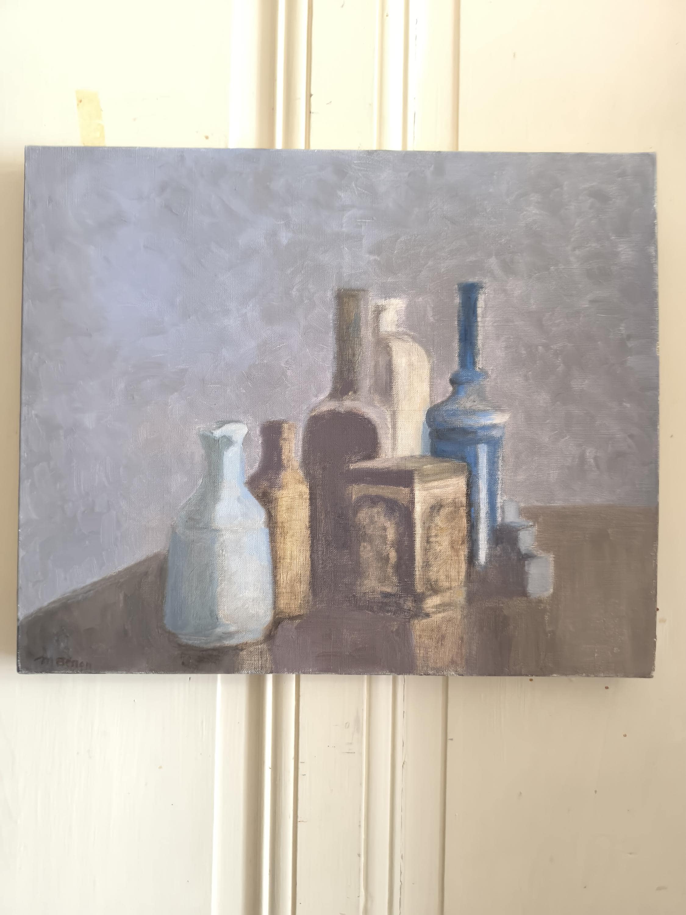 Discover this magnificent original oil on canvas, signed by the artist Mireille Besson (born in 1931 and died in 2023), who lived in Lyon and later in Taulignan in the Drôme region. The painting captures a still life scene imbued with serenity and light. The work presents a harmonious arrangement of containers of varying shapes, dominated by a group of vases and a decorative box in the center.