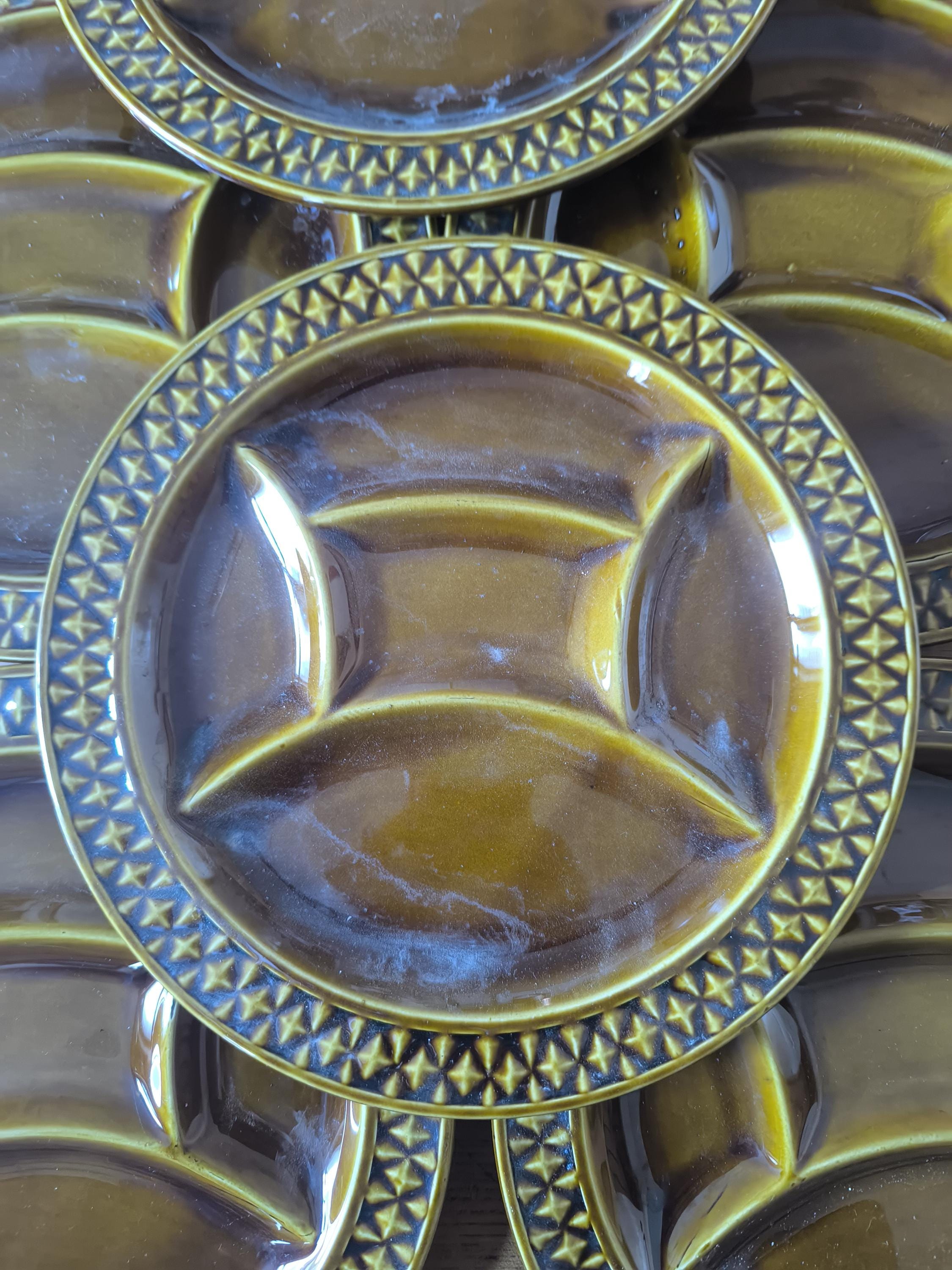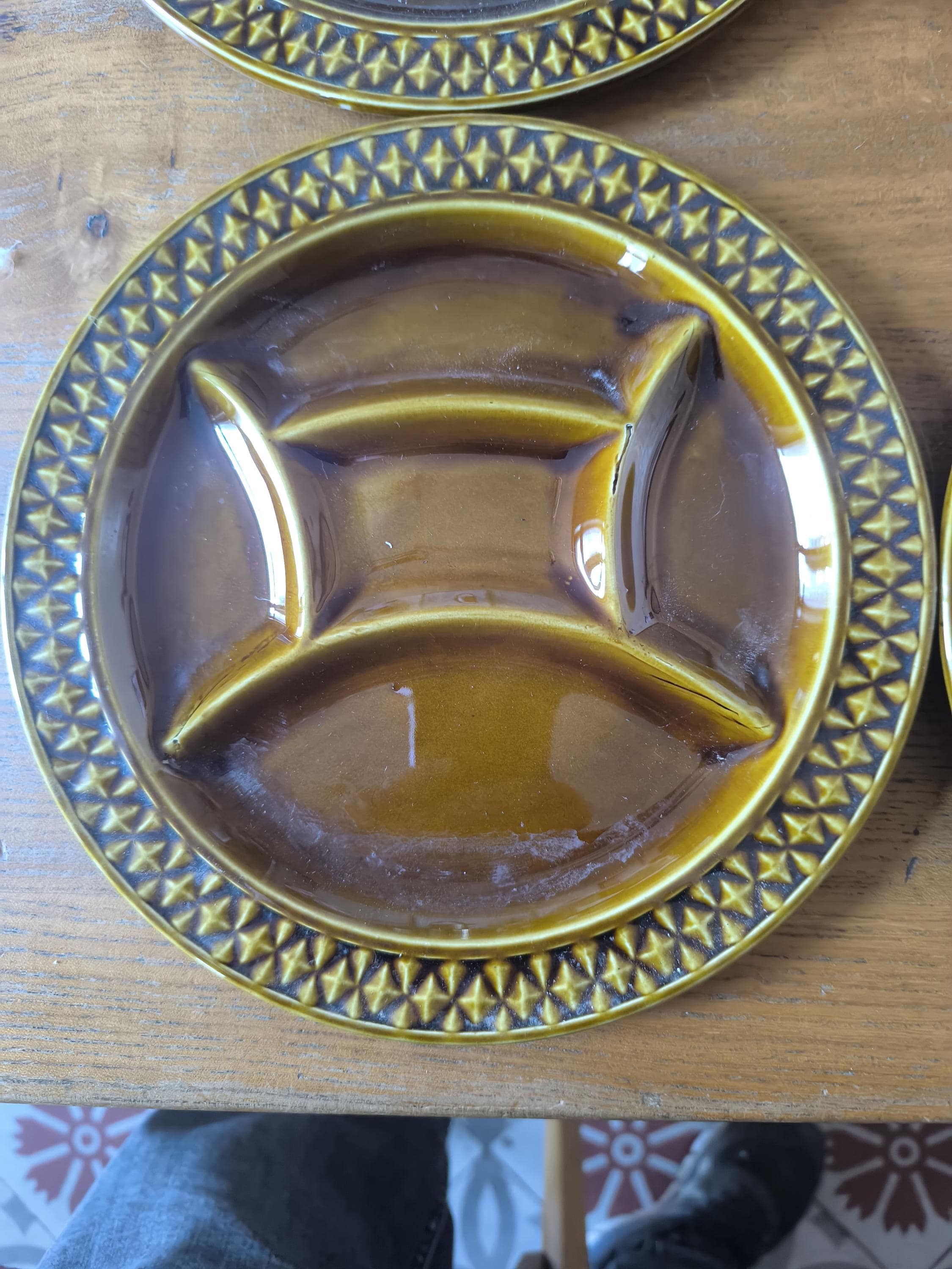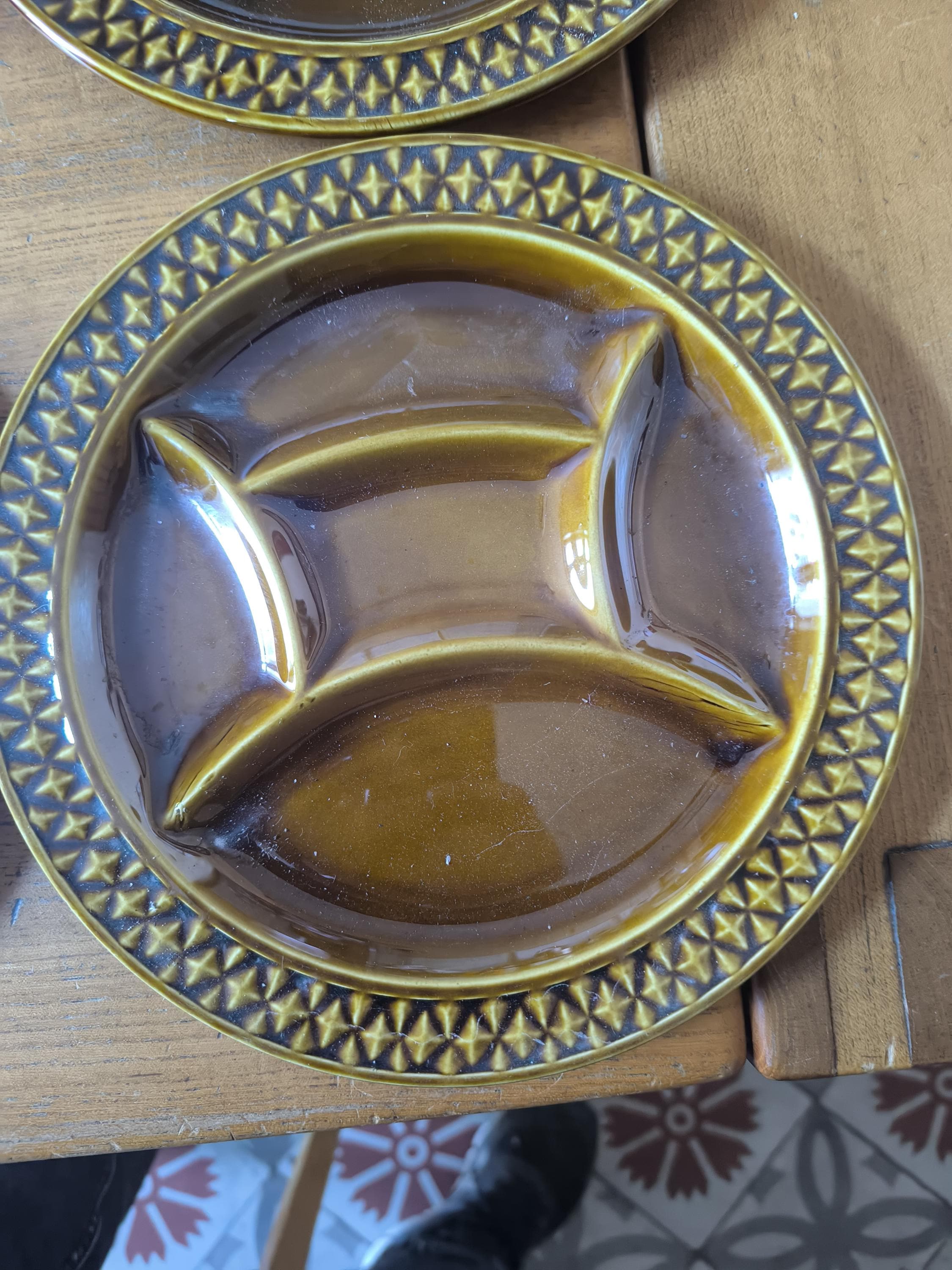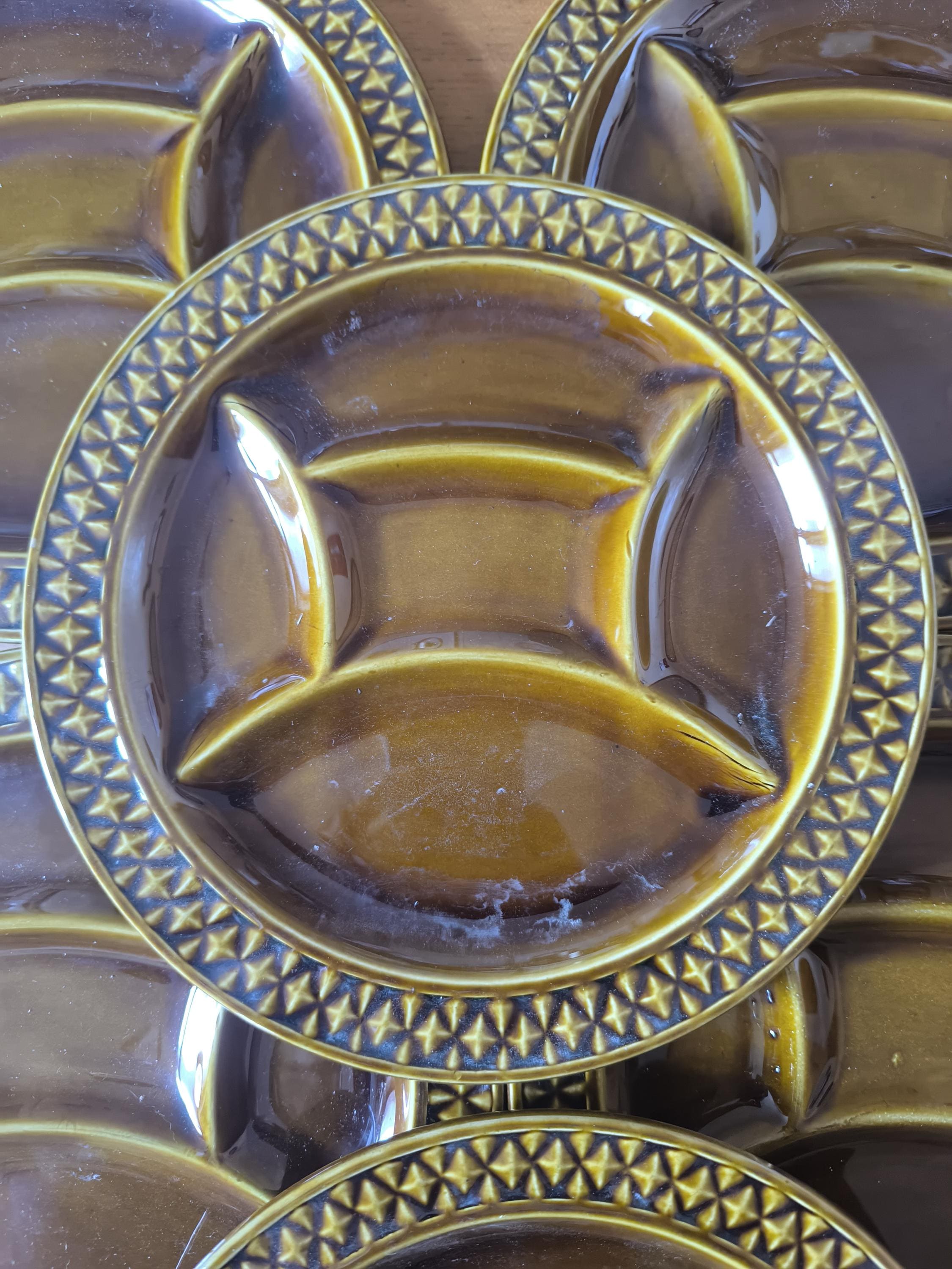 belle suite de 8 assiettes à fondue en faïence de Sarreguemines